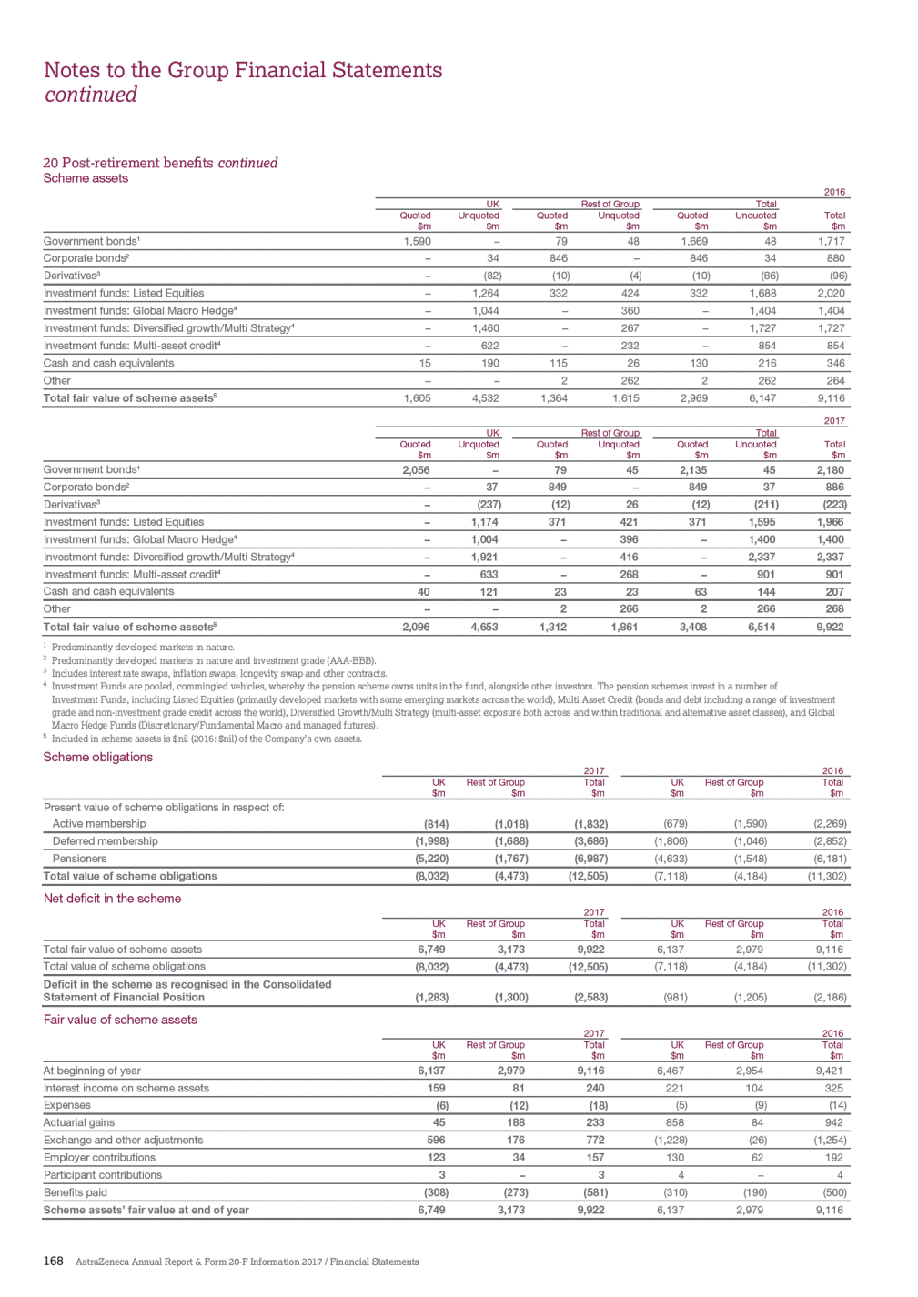 Notes to the Group Financial Statements continued 20 Post-retirement benets continued Scheme assets 2016 UK Rest of Group Total Quoted Unquoted Quoted Unquoted Quoted Unquoted Total $m $m $m $m $m $m $m Government bonds1 1,590 – 79 48 1,669 48 1,717 Corporate bonds2 – 34 846 – 846 34 880 Derivatives3 – (82) (10) (4) (10) (86) (96) Investment funds: Listed Equities – 1,264 332 424 332 1,688 2,020 Investment funds: Global Macro Hedge4 – 1,044 – 360 – 1,404 1,404 Investment funds: Diversified growth/Multi Strategy4 – 1,460 – 267 – 1,727 1,727 Investment funds: Multi-asset credit4 – 622 – 232 – 854 854 Cash and cash equivalents 15 190 115 26 130 216 346 Other – – 2 262 2 262 264 Total fair value of scheme assets5 1,605 4,532 1,364 1,615 2,969 6,147 9,116 2017 UK Rest of Group Total Quoted Unquoted Quoted Unquoted Quoted Unquoted Total $m $m $m $m $m $m $m Government bonds1 2,056 – 79 45 2,135 45 2,180 Corporate bonds2 – 37 849 – 849 37 886 Derivatives3 – (237) (12) 26 (12) (211) (223) Investment funds: Listed Equities – 1,174 371 421 371 1,595 1,966 Investment funds: Global Macro Hedge4 – 1,004 – 396 – 1,400 1,400 Investment funds: Diversified growth/Multi Strategy4 – 1,921 – 416 – 2,337 2,337 Investment funds: Multi-asset credit4 – 633 – 268 – 901 901 Cash and cash equivalents 40 121 23 23 63 144 207 Other – – 2 266 2 266 268 Total fair value of scheme assets5 2,096 4,653 1,312 1,861 3,408 6,514 9,922 1 Predominantly developed markets in nature. 2 Predominantly developed markets in nature and investment grade (AAA-BBB). 3 Includes interest rate swaps, inflation swaps, longevity swap and other contracts. 4 Investment Funds are pooled, commingled vehicles, whereby the pension scheme owns units in the fund, alongside other investors. The pension schemes invest in a number of Investment Funds, including Listed Equities (primarily developed markets with some emerging markets across the world), Multi Asset Credit (bonds and debt including a range of investment grade and non-investment grade credit across the world), Diversified Growth/Multi Strategy (multi-asset exposure both across and within traditional and alternative asset classes), and Global Macro Hedge Funds (Discretionary/Fundamental Macro and managed futures). 5 Included in scheme assets is $nil (2016: $nil) of the Company’s own assets. Scheme obligations 2017 2016 UK Rest of Group Total UK Rest of Group Total $m $m $m $m $m $m Present value of scheme obligations in respect of: Active membership (814) (1,018) (1,832) (679) (1,590) (2,269) Deferred membership (1,998) (1,688) (3,686) (1,806) (1,046) (2,852) Pensioners (5,220) (1,767) (6,987) (4,633) (1,548) (6,181) Total value of scheme obligations (8,032) (4,473) (12,505) (7,118) (4,184) (11,302) Net deficit in the scheme 2017 2016 UK Rest of Group Total UK Rest of Group Total $m $m $m $m $m $m Total fair value of scheme assets 6,749 3,173 9,922 6,137 2,979 9,116 Total value of scheme obligations (8,032) (4,473) (12,505) (7,118) (4,184) (11,302) Deficit in the scheme as recognised in the Consolidated Statement of Financial Position (1,283) (1,300) (2,583) (981) (1,205) (2,186) Fair value of scheme assets 2017 2016 UK Rest of Group Total UK Rest of Group Total $m $m $m $m $m $m At beginning of year 6,137 2,979 9,116 6,467 2,954 9,421 Interest income on scheme assets 159 81 240 221 104 325 Expenses (6) (12) (18) (5) (9) (14) Actuarial gains 45 188 233 858 84 942 Exchange and other adjustments 596 176 772 (1,228) (26) (1,254) Employer contributions 123 34 157 130 62 192 Participant contributions 3 – 3 4 – 4 Benefits paid (308) (273) (581) (310) (190) (500) Scheme assets’ fair value at end of year 6,749 3,173 9,922 6,137 2,979 9,116 168 AstraZeneca Annual Report & Form 20-F Information 2017 / Financial Statements