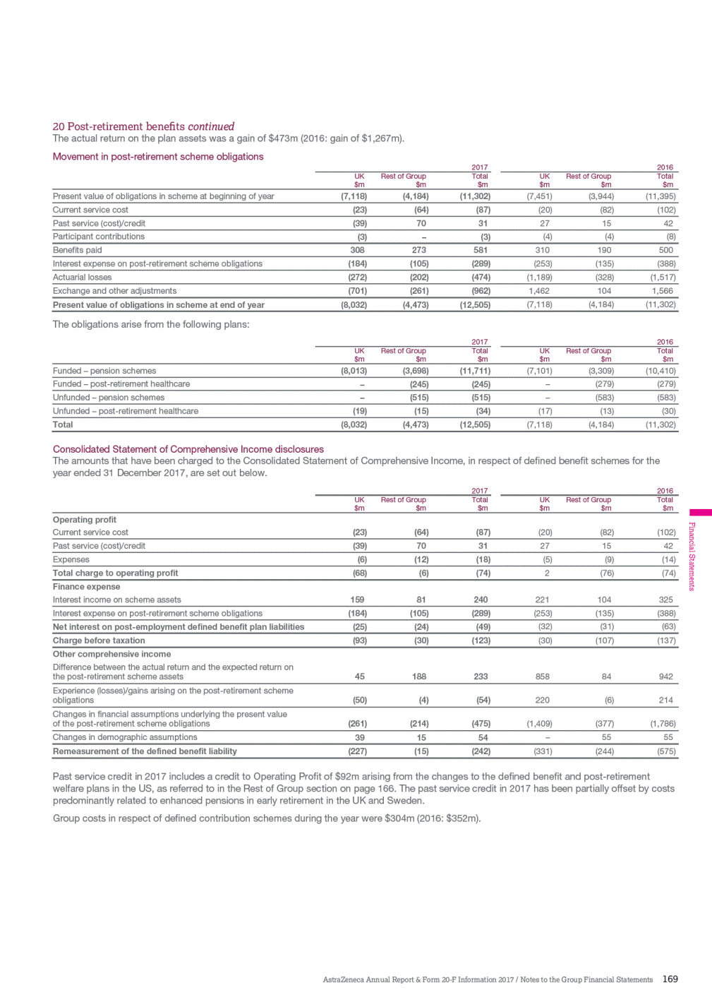 20 Post-retirement benets continued The actual return on the plan assets was a gain of $473m (2016: gain of $1,267m). Movement in post-retirement scheme obligations 2017 2016 UK Rest of Group Total UK Rest of Group Total $m $m $m $m $m $m Present value of obligations in scheme at beginning of year (7,118) (4,184) (11,302) (7,451) (3,944) (11,395) Current service cost (23) (64) (87) (20) (82) (102) Past service (cost)/credit (39) 70 31 27 15 42 Participant contributions (3) – (3) (4) (4) (8) Benefits paid 308 273 581 310 190 500 Interest expense on post-retirement scheme obligations (184) (105) (289) (253) (135) (388) Actuarial losses (1,189) (328) (1,517) (272) (202) (474) Exchange and other adjustments (701) (261) (962) 1,462 104 1,566 Present value of obligations in scheme at end of year (8,032) (4,473) (12,505) (7,118) (4,184) (11,302) The obligations arise from the following plans: 2017 2016 UK Rest of Group Total UK Rest of Group Total $m $m $m $m $m $m Funded – pension schemes (8,013) (3,698) (11,711) (7,101) (3,309) (10,410) Funded – post-retirement healthcare – (245) (245) – (279) (279) Unfunded – pension schemes – (515) (515) – (583) (583) Unfunded – post-retirement healthcare (19) (15) (34) (17) (13) (30) Total (8,032) (4,473) (12,505) (7,118) (4,184) (11,302) Consolidated Statement of Comprehensive Income disclosures The amounts that have been charged to the Consolidated Statement of Comprehensive Income, in respect of defined benefit schemes for the year ended 31 December 2017, are set out below. 2017 2016 UK Rest of Group Total UK Rest of Group Total $m $m $m $m $m $m Operating profit Current service cost (23) (64) (87) (20) (82) (102) Past service (cost)/credit (39) 70 31 27 15 42 Expenses (6) (12) (18) (5) (9) (14) Total charge to operating profit (68) (6) (74) 2 (76) (74) Finance expense Interest income on scheme assets 159 81 240 221 104 325 Interest expense on post-retirement scheme obligations (184) (105) (289) (253) (135) (388) Net interest on post-employment defined benefit plan liabilities (25) (24) (49) (32) (31) (63) Charge before taxation (93) (30) (123) (30) (107) (137) Other comprehensive income Difference between the actual return and the expected return on the post-retirement scheme assets 45 188 233 858 84 942 Experience (losses)/gains arising on the post-retirement scheme obligations (50) (4) (54) 220 (6) 214 Changes in financial assumptions underlying the present value of the post-retirement scheme obligations (261) (214) (475) (1,409) (377) (1,786) Changes in demographic assumptions 39 15 54 – 55 55 Remeasurement of the defined benefit liability (227) (15) (242) (331) (244) (575) Past service credit in 2017 includes a credit to Operating Profit of $92m arising from the changes to the defined benefit and post-retirement welfare plans in the US, as referred to in the Rest of Group section on page 166. The past service credit in 2017 has been partially offset by costs predominantly related to enhanced pensions in early retirement in the UK and Sweden. Group costs in respect of defined contribution schemes during the year were $304m (2016: $352m). AstraZeneca Annual Report & Form 20-F Information 2017 / Notes to the Group Financial Statements 169 Financial Statements