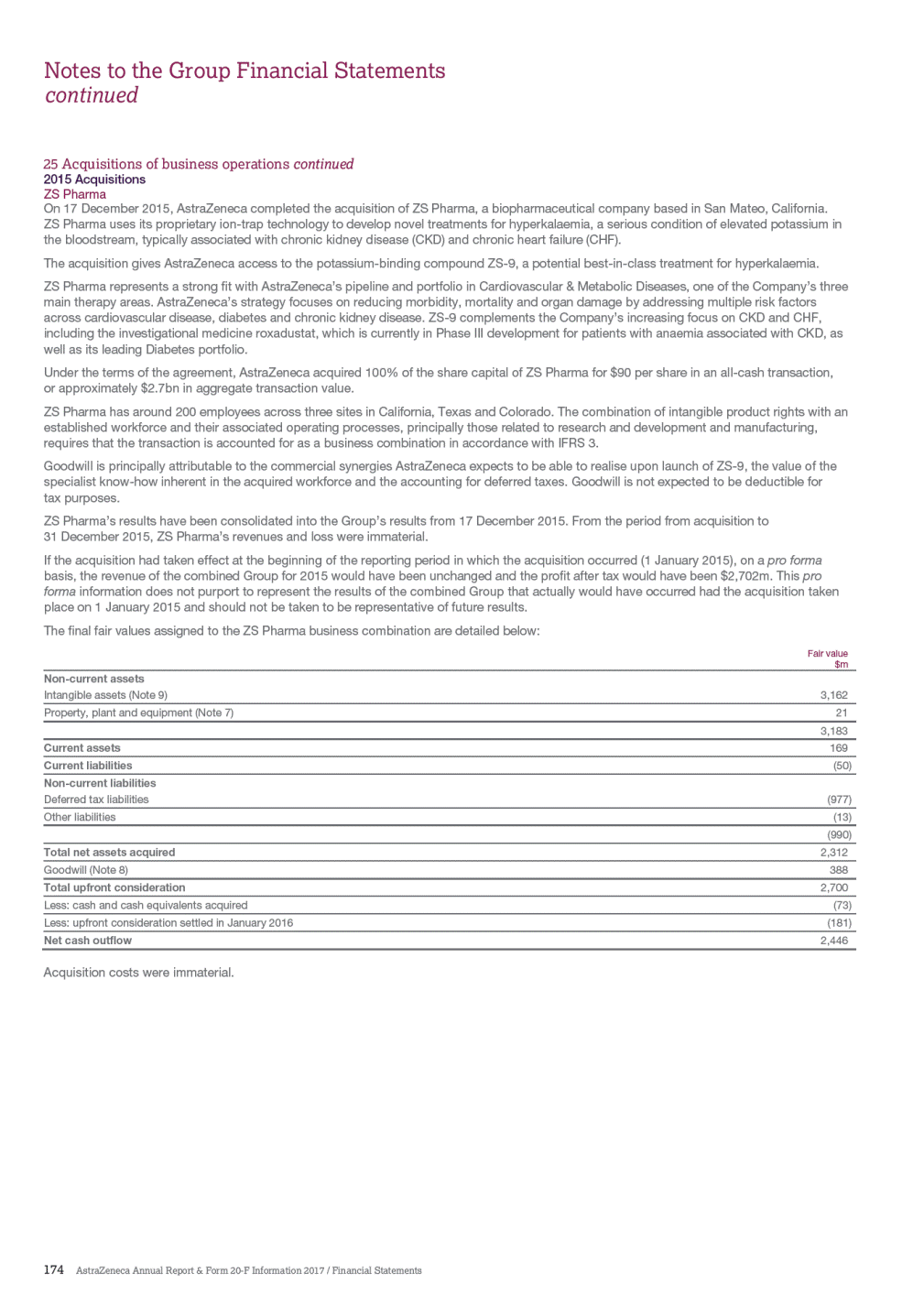 Notes to the Group Financial Statements continued 25 Acquisitions of business operations continued 2015 Acquisitions ZS Pharma On 17 December 2015, AstraZeneca completed the acquisition of ZS Pharma, a biopharmaceutical company based in San Mateo, California. ZS Pharma uses its proprietary ion-trap technology to develop novel treatments for hyperkalaemia, a serious condition of elevated potassium in the bloodstream, typically associated with chronic kidney disease (CKD) and chronic heart failure (CHF). The acquisition gives AstraZeneca access to the potassium-binding compound ZS-9, a potential best-in-class treatment for hyperkalaemia. ZS Pharma represents a strong fit with AstraZeneca’s pipeline and portfolio in Cardiovascular & Metabolic Diseases, one of the Company’s three main therapy areas. AstraZeneca’s strategy focuses on reducing morbidity, mortality and organ damage by addressing multiple risk factors across cardiovascular disease, diabetes and chronic kidney disease. ZS-9 complements the Company’s increasing focus on CKD and CHF, including the investigational medicine roxadustat, which is currently in Phase III development for patients with anaemia associated with CKD, as well as its leading Diabetes portfolio. Under the terms of the agreement, AstraZeneca acquired 100% of the share capital of ZS Pharma for $90 per share in an all-cash transaction, or approximately $2.7bn in aggregate transaction value. ZS Pharma has around 200 employees across three sites in California, Texas and Colorado. The combination of intangible product rights with an established workforce and their associated operating processes, principally those related to research and development and manufacturing, requires that the transaction is accounted for as a business combination in accordance with IFRS 3. Goodwill is principally attributable to the commercial synergies AstraZeneca expects to be able to realise upon launch of ZS-9, the value of the specialist know-how inherent in the acquired workforce and the accounting for deferred taxes. Goodwill is not expected to be deductible for tax purposes. ZS Pharma’s results have been consolidated into the Group’s results from 17 December 2015. From the period from acquisition to 31 December 2015, ZS Pharma’s revenues and loss were immaterial. If the acquisition had taken effect at the beginning of the reporting period in which the acquisition occurred (1 January 2015), on a pro forma basis, the revenue of the combined Group for 2015 would have been unchanged and the profit after tax would have been $2,702m. This pro forma information does not purport to represent the results of the combined Group that actually would have occurred had the acquisition taken place on 1 January 2015 and should not be taken to be representative of future results. The final fair values assigned to the ZS Pharma business combination are detailed below: Fair value $m Non-current assets Intangible assets (Note 9) 3,162 Property, plant and equipment (Note 7) 21 3,183 Current assets 169 Current liabilities (50) Non-current liabilities Deferred tax liabilities (977) Other liabilities (13) (990) Total net assets acquired 2,312 Goodwill (Note 8) 388 2,700 Total upfront consideration Less: cash and cash equivalents acquired (73) Less: upfront consideration settled in January 2016 (181) 2,446 Net cash outflow Acquisition costs were immaterial. 174 AstraZeneca Annual Report & Form 20-F Information 2017 / Financial Statements