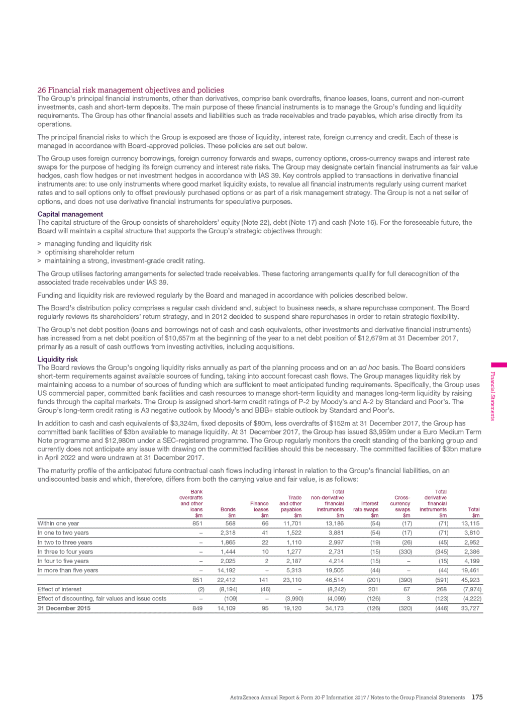 26 Financial risk management objectives and policies The Group’s principal financial instruments, other than derivatives, comprise bank overdrafts, finance leases, loans, current and non-current investments, cash and short-term deposits. The main purpose of these financial instruments is to manage the Group’s funding and liquidity requirements. The Group has other financial assets and liabilities such as trade receivables and trade payables, which arise directly from its operations. The principal financial risks to which the Group is exposed are those of liquidity, interest rate, foreign currency and credit. Each of these is managed in accordance with Board-approved policies. These policies are set out below. The Group uses foreign currency borrowings, foreign currency forwards and swaps, currency options, cross-currency swaps and interest rate swaps for the purpose of hedging its foreign currency and interest rate risks. The Group may designate certain financial instruments as fair value hedges, cash flow hedges or net investment hedges in accordance with IAS 39. Key controls applied to transactions in derivative financial instruments are: to use only instruments where good market liquidity exists, to revalue all financial instruments regularly using current market rates and to sell options only to offset previously purchased options or as part of a risk management strategy. The Group is not a net seller of options, and does not use derivative financial instruments for speculative purposes. Capital management The capital structure of the Group consists of shareholders’ equity (Note 22), debt (Note 17) and cash (Note 16). For the foreseeable future, the Board will maintain a capital structure that supports the Group’s strategic objectives through: ! managing funding and liquidity risk ! optimising shareholder return ! maintaining a strong, investment-grade credit rating. The Group utilises factoring arrangements for selected trade receivables. These factoring arrangements qualify for full derecognition of the associated trade receivables under IAS 39. Funding and liquidity risk are reviewed regularly by the Board and managed in accordance with policies described below. The Board’s distribution policy comprises a regular cash dividend and, subject to business needs, a share repurchase component. The Board regularly reviews its shareholders’ return strategy, and in 2012 decided to suspend share repurchases in order to retain strategic flexibility. The Group’s net debt position (loans and borrowings net of cash and cash equivalents, other investments and derivative financial instruments) has increased from a net debt position of $10,657m at the beginning of the year to a net debt position of $12,679m at 31 December 2017, primarily as a result of cash outflows from investing activities, including acquisitions. Liquidity risk The Board reviews the Group’s ongoing liquidity risks annually as part of the planning process and on an ad hoc basis. The Board considers short-term requirements against available sources of funding, taking into account forecast cash flows. The Group manages liquidity risk by maintaining access to a number of sources of funding which are sufficient to meet anticipated funding requirements. Specifically, the Group uses US commercial paper, committed bank facilities and cash resources to manage short-term liquidity and manages long-term liquidity by raising funds through the capital markets. The Group is assigned short-term credit ratings of P-2 by Moody’s and A-2 by Standard and Poor’s. The Group’s long-term credit rating is A3 negative outlook by Moody’s and BBB+ stable outlook by Standard and Poor’s. In addition to cash and cash equivalents of $3,324m, fixed deposits of $80m, less overdrafts of $152m at 31 December 2017, the Group has committed bank facilities of $3bn available to manage liquidity. At 31 December 2017, the Group has issued $3,959m under a Euro Medium Term Note programme and $12,980m under a SEC-registered programme. The Group regularly monitors the credit standing of the banking group and currently does not anticipate any issue with drawing on the committed facilities should this be necessary. The committed facilities of $3bn mature in April 2022 and were undrawn at 31 December 2017. The maturity profile of the anticipated future contractual cash flows including interest in relation to the Group’s financial liabilities, on an undiscounted basis and which, therefore, differs from both the carrying value and fair value, is as follows: Bank overdrafts and other loans Total non-derivative financial instruments Total derivative financial instruments Trade and other payables Cross-currency swaps Finance leases Interest rate swaps Bonds Total $m $m $m $m $m $m $m $m $m Within one year 851 568 66 11,701 13,186 (54) (17) (71) 13,115 In one to two years – 2,318 41 1,522 3,881 (54) (17) (71) 3,810 In two to three years – 1,865 22 1,110 2,997 (19) (26) (45) 2,952 In three to four years – 1,444 10 1,277 2,731 (15) (330) (345) 2,386 In four to five years – 2,025 2 2,187 4,214 (15) – (15) 4,199 In more than five years – 14,192 – 5,313 19,505 (44) – (44) 19,461 851 22,412 141 23,110 46,514 (201) (390) (591) 45,923 Effect of interest (2) (8,194) (46) – (8,242) 201 67 268 (7,974) Effect of discounting, fair values and issue costs – (109) – (3,990) (4,099) (126) 3 (123) (4,222) 31 December 2015 849 14,109 95 19,120 34,173 (126) (320) (446) 33,727 AstraZeneca Annual Report & Form 20-F Information 2017 / Notes to the Group Financial Statements 175 Financial Statements