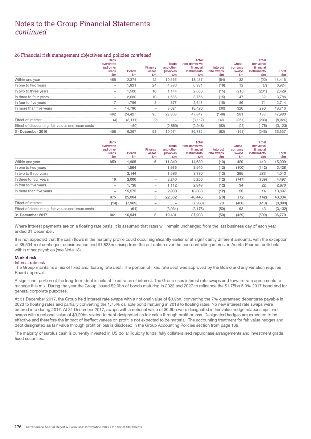Notes to the Group Financial Statements continued 26 Financial risk management objectives and policies continued Bank overdrafts Total non-derivative financial instruments Total derivative financial instruments Trade and other payables Cross-currency swaps and other loans Finance leases Interest rate swaps Bonds Total $m $m $m $m $m $m $m $m $m Within one year 455 2,374 42 10,566 13,437 (54) 32 (22) 13,415 In one to two years – 1,921 24 4,986 6,931 (19) 12 (7) 6,924 In two to three years – 1,500 16 1,144 2,660 (15) (216) (231) 2,429 In three to four years – 2,080 10 1,666 3,756 (15) 47 32 3,788 In four to five years 7 1,756 3 877 2,643 (15) 86 71 2,714 In more than five years – 14,796 – 3,624 18,420 (30) 320 290 18,710 462 24,427 95 22,863 47,847 (148) 281 133 47,980 Effect of interest (4) (8,111) (2) – (8,117) 148 (351) (203) (8,320) Effect of discounting, fair values and issue costs – (59) – (2,889) (2,948) (82) (93) (175) (3,123) 31 December 2016 458 16,257 93 19,974 36,782 (82) (163) (245) 36,537 Bank overdrafts and other loans Total non-derivative financial instruments Total derivative financial instruments Trade and other payables Cross-currency swaps Finance leases Interest rate swaps Bonds Total $m $m $m $m $m $m $m $m $m Within one year 859 1,985 5 11,840 14,689 (10) 420 410 15,099 In one to two years – 1,564 – 1,976 3,540 (12) (100) (112) 3,428 In two to three years – 2,144 – 1,586 3,730 (12) 295 283 4,013 In three to four years 16 2,000 – 3,240 5,256 (12) (747) (759) 4,497 In four to five years – 1,736 – 1,112 2,848 (12) 34 22 2,870 In more than five years – 15,575 – 2,808 18,383 (12) 26 14 18,397 875 25,004 5 22,562 48,446 (70) (72) (142) 48,304 Effect of interest (14) (7,969) – – (7,983) 70 (480) (410) (8,393) Effect of discounting, fair values and issue costs – (94) – (3,081) (3,175) (50) 93 43 (3,132) 31 December 2017 861 16,941 5 19,481 37,288 (50) (459) (509) 36,779 Where interest payments are on a floating rate basis, it is assumed that rates will remain unchanged from the last business day of each year ended 31 December. It is not expected that the cash flows in the maturity profile could occur significantly earlier or at significantly different amounts, with the exception of $5,534m of contingent consideration and $1,823m arising from the put option over the non-controlling interest in Acerta Pharma, both held within other payables (see Note 18). Market risk Interest rate risk The Group maintains a mix of fixed and floating rate debt. The portion of fixed rate debt was approved by the Board and any variation requires Board approval. A significant portion of the long-term debt is held at fixed rates of interest. The Group uses interest rate swaps and forward rate agreements to manage this mix. During the year the Group issued $2.0bn of bonds maturing in 2022 and 2027 to refinance the $1.75bn 5.9% 2017 bond and for general corporate purposes. At 31 December 2017, the Group held interest rate swaps with a notional value of $0.9bn, converting the 7% guaranteed debentures payable in 2023 to floating rates and partially converting the 1.75% callable bond maturing in 2018 to floating rates. No new interest rate swaps were entered into during 2017. At 31 December 2017, swaps with a notional value of $0.6bn were designated in fair value hedge relationships and swaps with a notional value of $0.29bn related to debt designated as fair value through profit or loss. Designated hedges are expected to be effective and therefore the impact of ineffectiveness on profit is not expected to be material. The accounting treatment for fair value hedges and debt designated as fair value through profit or loss is disclosed in the Group Accounting Policies section from page 139. The majority of surplus cash is currently invested in US dollar liquidity funds, fully collateralised repurchase arrangements and investment grade fixed securities. 176 AstraZeneca Annual Report & Form 20-F Information 2017 / Financial Statements