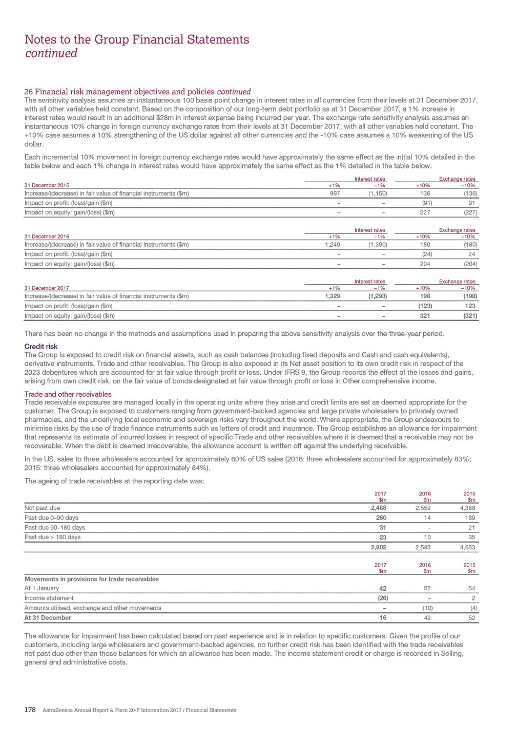 Notes to the Group Financial Statements continued 26 Financial risk management objectives and policies continued The sensitivity analysis assumes an instantaneous 100 basis point change in interest rates in all currencies from their levels at 31 December 2017, with all other variables held constant. Based on the composition of our long-term debt portfolio as at 31 December 2017, a 1% increase in interest rates would result in an additional $28m in interest expense being incurred per year. The exchange rate sensitivity analysis assumes an instantaneous 10% change in foreign currency exchange rates from their levels at 31 December 2017, with all other variables held constant. The +10% case assumes a 10% strengthening of the US dollar against all other currencies and the -10% case assumes a 10% weakening of the US dollar. Each incremental 10% movement in foreign currency exchange rates would have approximately the same effect as the initial 10% detailed in the table below and each 1% change in interest rates would have approximately the same effect as the 1% detailed in the table below. Interest rates Exchange rates 31 December 2015 +1% -1% +10% -10% Increase/(decrease) in fair value of financial instruments ($m) 997 (1,150) 136 (136) Impact on profit: (loss)/gain ($m) – – (91) 91 Impact on equity: gain/(loss) ($m) – – 227 (227) Interest rates Exchange rates 31 December 2016 +1% -1% +10% -10% Increase/(decrease) in fair value of financial instruments ($m) 1,249 (1,390) 180 (180) Impact on profit: (loss)/gain ($m) – – (24) 24 Impact on equity: gain/(loss) ($m) – – 204 (204) Interest rates Exchange rates 31 December 2017 +1% -1% +10% -10% Increase/(decrease) in fair value of financial instruments ($m) 1,329 (1,293) 198 (198) Impact on profit: (loss)/gain ($m) – – (123) 123 Impact on equity: gain/(loss) ($m) – – 321 (321) There has been no change in the methods and assumptions used in preparing the above sensitivity analysis over the three-year period. Credit risk The Group is exposed to credit risk on financial assets, such as cash balances (including fixed deposits and Cash and cash equivalents), derivative instruments, Trade and other receivables. The Group is also exposed in its Net asset position to its own credit risk in respect of the 2023 debentures which are accounted for at fair value through profit or loss. Under IFRS 9, the Group records the effect of the losses and gains, arising from own credit risk, on the fair value of bonds designated at fair value through profit or loss in Other comprehensive income. Trade and other receivables Trade receivable exposures are managed locally in the operating units where they arise and credit limits are set as deemed appropriate for the customer. The Group is exposed to customers ranging from government-backed agencies and large private wholesalers to privately owned pharmacies, and the underlying local economic and sovereign risks vary throughout the world. Where appropriate, the Group endeavours to minimise risks by the use of trade finance instruments such as letters of credit and insurance. The Group establishes an allowance for impairment that represents its estimate of incurred losses in respect of specific Trade and other receivables where it is deemed that a receivable may not be recoverable. When the debt is deemed irrecoverable, the allowance account is written off against the underlying receivable. In the US, sales to three wholesalers accounted for approximately 60% of US sales (2016: three wholesalers accounted for approximately 83%; 2015: three wholesalers accounted for approximately 84%). The ageing of trade receivables at the reporting date was: 2017 2016 2015 $m $m $m Not past due 2,488 2,559 4,388 Past due 0–90 days 260 14 189 Past due 90–180 days – 21 31 Past due > 180 days 23 10 35 2,802 2,583 4,633 2017 2016 2015 $m $m $m Movements in provisions for trade receivables At 1 January 42 52 54 Income statement (26) – 2 Amounts utilised, exchange and other movements – (10) (4) At 31 December 16 42 52 The allowance for impairment has been calculated based on past experience and is in relation to specific customers. Given the profile of our customers, including large wholesalers and government-backed agencies, no further credit risk has been identified with the trade receivables not past due other than those balances for which an allowance has been made. The income statement credit or charge is recorded in Selling, general and administrative costs. 178 AstraZeneca Annual Report & Form 20-F Information 2017 / Financial Statements