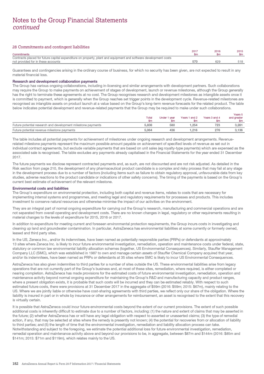 Notes to the Group Financial Statements continued 28 Commitments and contingent liabilities Commitments 2017 $m 2016 $m 2015 $m Contracts placed for future capital expenditure on property, plant and equipment and software development costs not provided for in these accounts 570 629 518 Guarantees and contingencies arising in the ordinary course of business, for which no security has been given, are not expected to result in any material financial loss. Research and development collaboration payments The Group has various ongoing collaborations, including in-licensing and similar arrangements with development partners. Such collaborations may require the Group to make payments on achievement of stages of development, launch or revenue milestones, although the Group generally has the right to terminate these agreements at no cost. The Group recognises research and development milestones as intangible assets once it is committed to payment, which is generally when the Group reaches set trigger points in the development cycle. Revenue-related milestones are recognised as intangible assets on product launch at a value based on the Group’s long-term revenue forecasts for the related product. The table below indicates potential development and revenue-related payments that the Group may be required to make under such collaborations. Years 5 Total Under 1 year Years 1 and 2 Years 3 and 4 and greater $m $m $m $m $m Future potential research and development milestone payments 5,838 580 1,254 723 3,281 Future potential revenue milestone payments 5,064 436 1,216 276 3,136 The table includes all potential payments for achievement of milestones under ongoing research and development arrangements. Revenue-related milestone payments represent the maximum possible amount payable on achievement of specified levels of revenue as set out in individual contract agreements, but exclude variable payments that are based on unit sales (eg royalty-type payments) which are expensed as the associated sale is recognised. The table excludes any payments already capitalised in the Financial Statements for the year ended 31 December 2017. The future payments we disclose represent contracted payments and, as such, are not discounted and are not risk adjusted. As detailed in the Risk section from page 210, the development of any pharmaceutical product candidate is a complex and risky process that may fail at any stage in the development process due to a number of factors (including items such as failure to obtain regulatory approval, unfavourable data from key studies, adverse reactions to the product candidate or indications of other safety concerns). The timing of the payments is based on the Group’s current best estimate of achievement of the relevant milestone. Environmental costs and liabilities The Group’s expenditure on environmental protection, including both capital and revenue items, relates to costs that are necessary for implementing internal systems and programmes, and meeting legal and regulatory requirements for processes and products. This includes investment to conserve natural resources and otherwise minimise the impact of our activities on the environment. They are an integral part of normal ongoing expenditure for carrying out the Group’s research, manufacturing and commercial operations and are not separated from overall operating and development costs. There are no known changes in legal, regulatory or other requirements resulting in material changes to the levels of expenditure for 2015, 2016 or 2017. In addition to expenditure for meeting current and foreseen environmental protection requirements, the Group incurs costs in investigating and cleaning up land and groundwater contamination. In particular, AstraZeneca has environmental liabilities at some currently or formerly owned, leased and third party sites. In the US, Zeneca Inc., and/or its indemnitees, have been named as potentially responsible parties (PRPs) or defendants at approximately 13 sites where Zeneca Inc. is likely to incur future environmental investigation, remediation, operation and maintenance costs under federal, state, statutory or common law environmental liability allocation schemes (together, US Environmental Consequences). Similarly, Stauffer Management Company LLC (SMC), which was established in 1987 to own and manage certain assets of Stauffer Chemical Company acquired that year, and/or its indemnitees, have been named as PRPs or defendants at 35 sites where SMC is likely to incur US Environmental Consequences. AstraZeneca has also given indemnities to third parties for a number of sites outside the US. These environmental liabilities arise from legacy operations that are not currently part of the Group’s business and, at most of these sites, remediation, where required, is either completed or nearing completion. AstraZeneca has made provisions for the estimated costs of future environmental investigation, remediation, operation and maintenance activity beyond normal ongoing expenditure for maintaining the Group’s R&D and manufacturing capacity and product ranges, where a present obligation exists, it is probable that such costs will be incurred and they can be estimated reliably. With respect to such estimated future costs, there were provisions at 31 December 2017 in the aggregate of $59m (2016: $59m; 2015: $67m), mainly relating to the US. Where we are jointly liable or otherwise have cost-sharing agreements with third parties, we reflect only our share of the obligation. Where the liability is insured in part or in whole by insurance or other arrangements for reimbursement, an asset is recognised to the extent that this recovery is virtually certain. It is possible that AstraZeneca could incur future environmental costs beyond the extent of our current provisions. The extent of such possible additional costs is inherently difficult to estimate due to a number of factors, including: (1) the nature and exte