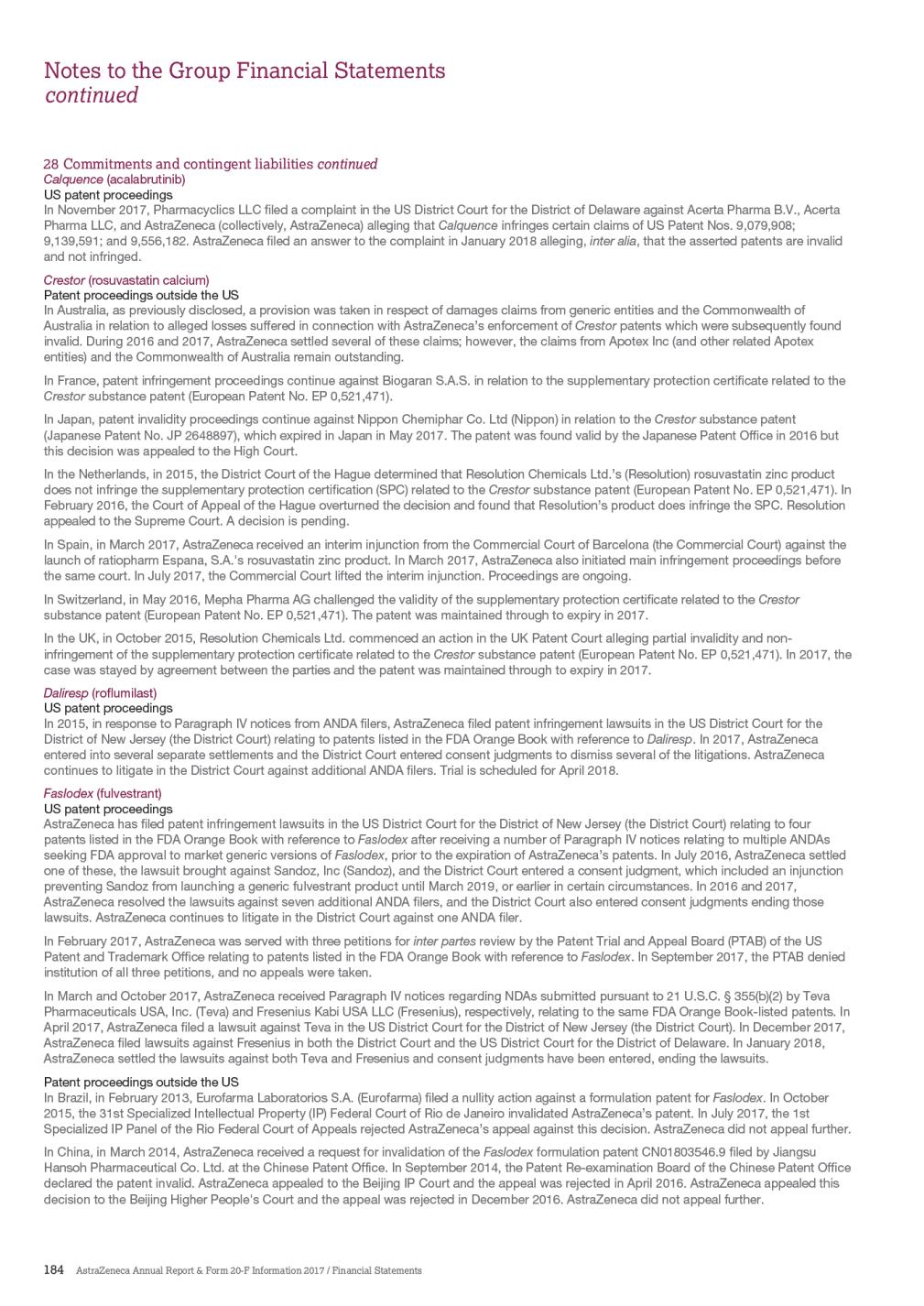 Notes to the Group Financial Statements continued 28 Commitments and contingent liabilities continued Calquence (acalabrutinib) US patent proceedings In November 2017, Pharmacyclics LLC filed a complaint in the US District Court for the District of Delaware against Acerta Pharma B.V., Acerta Pharma LLC, and AstraZeneca (collectively, AstraZeneca) alleging that Calquence infringes certain claims of US Patent Nos. 9,079,908; 9,139,591; and 9,556,182. AstraZeneca filed an answer to the complaint in January 2018 alleging, inter alia, that the asserted patents are invalid and not infringed. Crestor (rosuvastatin calcium) Patent proceedings outside the US In Australia, as previously disclosed, a provision was taken in respect of damages claims from generic entities and the Commonwealth of Australia in relation to alleged losses suffered in connection with AstraZeneca’s enforcement of Crestor patents which were subsequently found invalid. During 2016 and 2017, AstraZeneca settled several of these claims; however, the claims from Apotex Inc (and other related Apotex entities) and the Commonwealth of Australia remain outstanding. In France, patent infringement proceedings continue against Biogaran S.A.S. in relation to the supplementary protection certificate related to the Crestor substance patent (European Patent No. EP 0,521,471). In Japan, patent invalidity proceedings continue against Nippon Chemiphar Co. Ltd (Nippon) in relation to the Crestor substance patent (Japanese Patent No. JP 2648897), which expired in Japan in May 2017. The patent was found valid by the Japanese Patent Office in 2016 but this decision was appealed to the High Court. In the Netherlands, in 2015, the District Court of the Hague determined that Resolution Chemicals Ltd.’s (Resolution) rosuvastatin zinc product does not infringe the supplementary protection certification (SPC) related to the Crestor substance patent (European Patent No. EP 0,521,471). In February 2016, the Court of Appeal of the Hague overturned the decision and found that Resolution’s product does infringe the SPC. Resolution appealed to the Supreme Court. A decision is pending. In Spain, in March 2017, AstraZeneca received an interim injunction from the Commercial Court of Barcelona (the Commercial Court) against the launch of ratiopharm Espana, S.A.'s rosuvastatin zinc product. In March 2017, AstraZeneca also initiated main infringement proceedings before the same court. In July 2017, the Commercial Court lifted the interim injunction. Proceedings are ongoing. In Switzerland, in May 2016, Mepha Pharma AG challenged the validity of the supplementary protection certificate related to the Crestor substance patent (European Patent No. EP 0,521,471). The patent was maintained through to expiry in 2017. In the UK, in October 2015, Resolution Chemicals Ltd. commenced an action in the UK Patent Court alleging partial invalidity and non-infringement of the supplementary protection certificate related to the Crestor substance patent (European Patent No. EP 0,521,471). In 2017, the case was stayed by agreement between the parties and the patent was maintained through to expiry in 2017. Daliresp (roflumilast) US patent proceedings In 2015, in response to Paragraph IV notices from ANDA filers, AstraZeneca filed patent infringement lawsuits in the US District Court for the District of New Jersey (the District Court) relating to patents listed in the FDA Orange Book with reference to Daliresp. In 2017, AstraZeneca entered into several separate settlements and the District Court entered consent judgments to dismiss several of the litigations. AstraZeneca continues to litigate in the District Court against additional ANDA filers. Trial is scheduled for April 2018. Faslodex (fulvestrant) US patent proceedings AstraZeneca has filed patent infringement lawsuits in the US District Court for the District of New Jersey (the District Court) relating to four patents listed in the FDA Orange Book with reference to Faslodex after receiving a number of Paragraph IV notices relating to multiple ANDAs seeking FDA approval to market generic versions of Faslodex, prior to the expiration of AstraZeneca’s patents. In July 2016, AstraZeneca settled one of these, the lawsuit brought against Sandoz, Inc (Sandoz), and the District Court entered a consent judgment, which included an injunction preventing Sandoz from launching a generic fulvestrant product until March 2019, or earlier in certain circumstances. In 2016 and 2017, AstraZeneca resolved the lawsuits against seven additional ANDA filers, and the District Court also entered consent judgments ending those lawsuits. AstraZeneca continues to litigate in the District Court against one ANDA filer. In February 2017, AstraZeneca was served with three petitions for inter partes review by the Patent Trial and Appeal Board (PTAB) of the US Patent and Trademark Office relating to patents listed in the FDA Orange Book with reference to Faslodex. In September 2017, the PTAB denied institution of all three petitions, and no appeals were taken. In March and October 2017, AstraZeneca received Paragraph IV notices regarding NDAs submitted pursuant to 21 U.S.C. § 355(b)(2) by Teva Pharmaceuticals USA, Inc. (Teva) and Fresenius Kabi USA LLC (Fresenius), respectively, relating to the same FDA Orange Book-listed patents. In April 2017, AstraZeneca filed a lawsuit against Teva in the US District Court for the District of New Jersey (the District Court). In December 2017, AstraZeneca filed lawsuits against Fresenius in both the District Court and the US District Court for the District of Delaware. In January 2018, AstraZeneca settled the lawsuits against both Teva and Fresenius and consent judgments have been entered, ending the lawsuits. Patent proceedings outside the US In Brazil, in February 2013, Eurofarma Laboratorios S.A. (Eurofarma) filed a nullity action against a formulation patent for Faslodex. In October 2015, the 31st Specialized 
