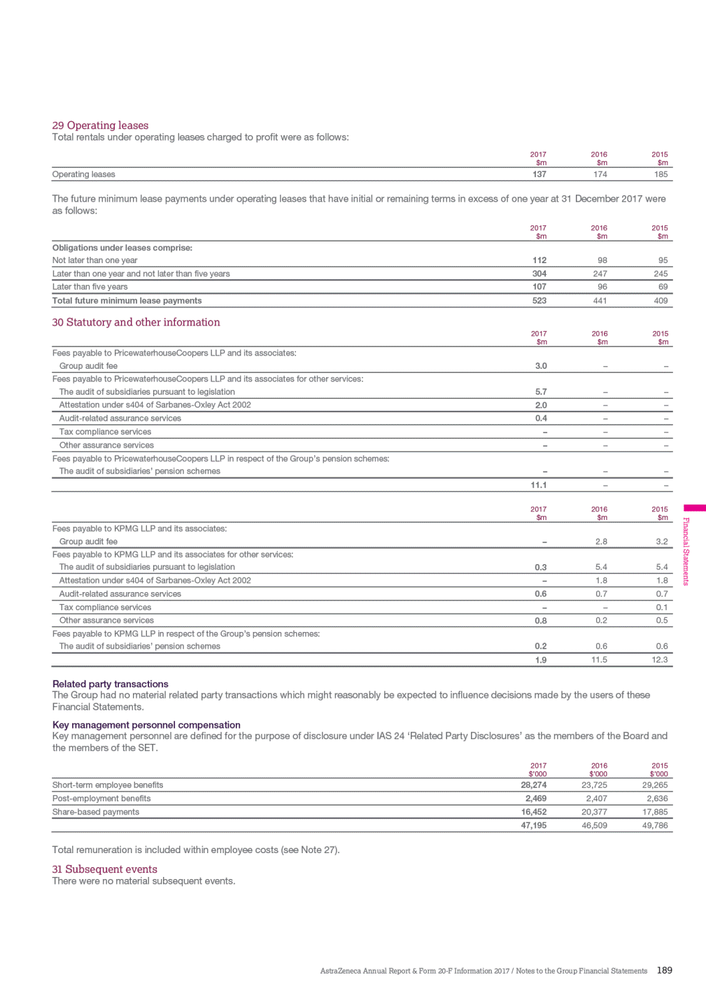 29 Operating leases Total rentals under operating leases charged to profit were as follows: 2017 2016 2015 $m $m $m Operating leases 137 174 185 The future minimum lease payments under operating leases that have initial or remaining terms in excess of one year at 31 December 2017 were as follows: 2017 2016 2015 $m $m $m Obligations under leases comprise: Not later than one year 112 98 95 Later than one year and not later than five years 304 247 245 Later than five years 107 96 69 Total future minimum lease payments 523 441 409 30 Statutory and other information 2017 2016 2015 $m $m $m Fees payable to PricewaterhouseCoopers LLP and its associates: Group audit fee 3.0 – – Fees payable to PricewaterhouseCoopers LLP and its associates for other services: The audit of subsidiaries pursuant to legislation 5.7 – – Attestation under s404 of Sarbanes-Oxley Act 2002 2.0 – – Audit-related assurance services 0.4 – – Tax compliance services – – – Other assurance services – – – Fees payable to PricewaterhouseCoopers LLP in respect of the Group’s pension schemes: The audit of subsidiaries’ pension schemes – – – 11.1 – – 2017 2016 2015 $m $m $m Fees payable to KPMG LLP and its associates: Group audit fee – 2.8 3.2 Fees payable to KPMG LLP and its associates for other services: The audit of subsidiaries pursuant to legislation 0.3 5.4 5.4 Attestation under s404 of Sarbanes-Oxley Act 2002 – 1.8 1.8 Audit-related assurance services 0.6 0.7 0.7 Tax compliance services – – 0.1 Other assurance services 0.8 0.2 0.5 Fees payable to KPMG LLP in respect of the Group’s pension schemes: The audit of subsidiaries’ pension schemes 0.2 0.6 0.6 1.9 11.5 12.3 Related party transactions The Group had no material related party transactions which might reasonably be expected to influence decisions made by the users of these Financial Statements. Key management personnel compensation Key management personnel are defined for the purpose of disclosure under IAS 24 ‘Related Party Disclosures’ as the members of the Board and the members of the SET. 2017 2016 2015 $’000 $’000 $’000 Short-term employee benefits 28,274 23,725 29,265 Post-employment benefits 2,407 2,636 2,469 Share-based payments 16,452 20,377 17,885 47,195 46,509 49,786 Total remuneration is included within employee costs (see Note 27). 31 Subsequent events There were no material subsequent events. AstraZeneca Annual Report & Form 20-F Information 2017 / Notes to the Group Financial Statements 189 Financial Statements