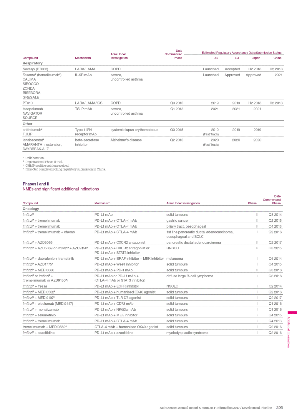 Date Commenced Phase Estimated Regulatory Acceptance Date/Submission Status Area Under Investigation Compound Mechanism US EU Japan China Respiratory Bevespi (PT003) LABA/LAMA COPD Launched Accepted H2 2018 H2 2018 Fasenra# (benralizumab#) CALIMA SIROCCO ZONDA BISEBORA GREGALE IL-5R mAb severe, uncontrolled asthma Launched Approved Approved 2021 PT010 LABA/LAMA/ICS COPD Q3 2015 2019 2019 H2 2018 H2 2018 tezepelumab NAVIGATOR SOURCE TSLP mAb severe, uncontrolled asthma Q1 2018 2021 2021 2021 Other anifrolumab# TULIP Type 1 IFN receptor mAb systemic lupus erythematosus Q3 2015 2019 (Fast Track) 2019 2019 lanabecestat# AMARANTH + extension, DAYBREAK-ALZ beta-secretase inhibitor Alzheimer’s disease Q2 2016 2020 (Fast Track) 2020 2020 # Collaboration. ¶ Registrational Phase II trial. 1 CHMP positive opinion received. 2 FibroGen completed rolling regulatory submission in China. Phases I and II NMEs and significant additional indications Date Commenced Phase Compound Mechanism Area Under Investigation Phase Oncology Imfinzi# PD-L1 mAb solid tumours II Q3 2014 Imfinzi# + tremelimumab PD-L1 mAb + CTLA-4 mAb gastric cancer II Q2 2015 Imfinzi# + tremelimumab PD-L1 mAb + CTLA-4 mAb biliary tract, oesophageal II Q4 2013 Imfinzi# + tremelimumab + chemo PD-L1 mAb + CTLA-4 mAb 1st line pancreatic ductal adenocarcinoma, oesophageal and SCLC I Q2 2016 Imfinzi# + AZD5069 PD-L1 mAb + CXCR2 antagonist pancreatic ductal adenocarcinoma II Q2 2017 Imfinzi# + AZD5069 or Imfinzi# + AZD9150# PD-L1 mAb + CXCR2 antagonist or PD-L1 mAb + STAT3 inhibitor HNSCC II Q3 2015 Imfinzi# + dabrafenib + trametinib PD-L1 mAb + BRAF inhibitor + MEK inhibitor melanoma I Q1 2014 Imfinzi# + AZD1775# PD-L1 mAb + Wee1 inhibitor solid tumours I Q4 2015 Imfinzi# + MEDI0680 PD-L1 mAb + PD-1 mAb solid tumours II Q3 2016 Imfinzi# or Imfinzi# + (tremelimumab or AZD9150#) PD-L1 mAb or PD-L1 mAb + (CTLA-4 mAb or STAT3 inhibitor) diffuse large B-cell lymphoma I Q3 2016 Imfinzi# + Iressa PD-L1 mAb + EGFR inhibitor NSCLC I Q2 2014 Imfinzi# + MEDI0562# PD-L1 mAb + humanised OX40 agonist solid tumours I Q2 2016 Imfinzi# + MEDI9197# PD-L1 mAb + TLR 7/8 agonist solid tumours I Q2 2017 Imfinzi# + oleclumab (MEDI9447) PD-L1 mAb + CD73 mAb solid tumours I Q1 2016 Imfinzi# + monalizumab PD-L1 mAb + NKG2a mAb solid tumours I Q1 2016 Imfinzi# + selumetinib PD-L1 mAb + MEK inhibitor solid tumours I Q4 2015 Imfinzi# + tremelimumab PD-L1 mAb + CTLA-4 mAb solid tumours I Q4 2013 tremelimumab + MEDI0562# CTLA-4 mAb + humanised OX40 agonist solid tumours I Q2 2016 Imfinzi# + azacitidine PD-L1 mAb + azacitidine myelodysplastic syndrome I Q2 2016 AstraZeneca Annual Report & Form 20-F Information 2017 / Development Pipeline 203 Additional Information