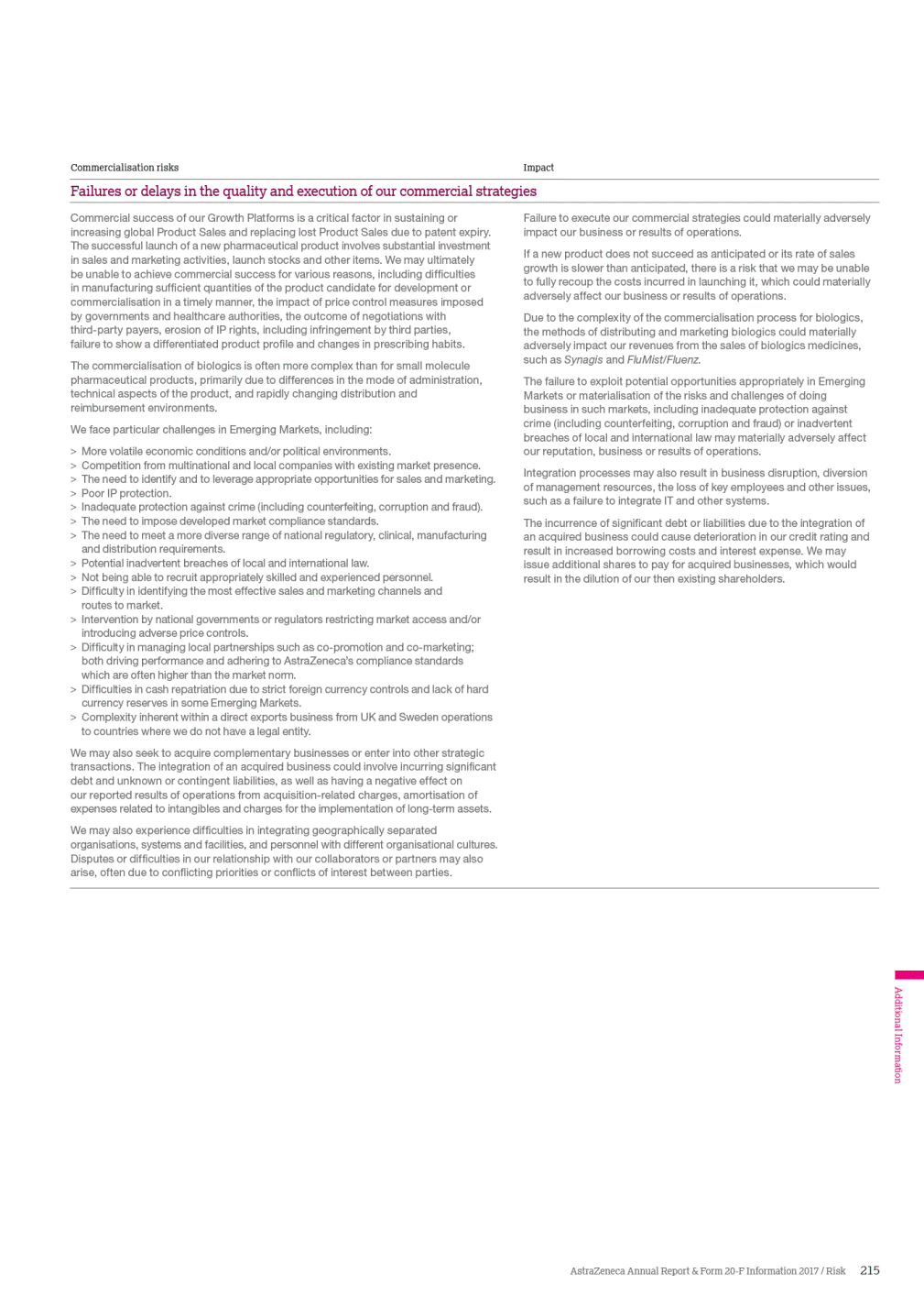 Commercialisation risks Impact Failures or delays in the quality and execution of our commercial strategies Commercial success of our Growth Platforms is a critical factor in sustaining or increasing global Product Sales and replacing lost Product Sales due to patent expiry. The successful launch of a new pharmaceutical product involves substantial investment in sales and marketing activities, launch stocks and other items. We may ultimately be unable to achieve commercial success for various reasons, including difficulties in manufacturing sufficient quantities of the product candidate for development or commercialisation in a timely manner, the impact of price control measures imposed by governments and healthcare authorities, the outcome of negotiations with third-party payers, erosion of IP rights, including infringement by third parties, failure to show a differentiated product profile and changes in prescribing habits. The commercialisation of biologics is often more complex than for small molecule pharmaceutical products, primarily due to differences in the mode of administration, technical aspects of the product, and rapidly changing distribution and reimbursement environments. We face particular challenges in Emerging Markets, including: > More volatile economic conditions and/or political environments. > Competition from multinational and local companies with existing market presence. > The need to identify and to leverage appropriate opportunities for sales and marketing. > Poor IP protection. > Inadequate protection against crime (including counterfeiting, corruption and fraud). > The need to impose developed market compliance standards. > The need to meet a more diverse range of national regulatory, clinical, manufacturing and distribution requirements. > Potential inadvertent breaches of local and international law. > Not being able to recruit appropriately skilled and experienced personnel. > Difficulty in identifying the most effective sales and marketing channels and routes to market. > Intervention by national governments or regulators restricting market access and/or introducing adverse price controls. > Difficulty in managing local partnerships such as co-promotion and co-marketing; both driving performance and adhering to AstraZeneca’s compliance standards which are often higher than the market norm. > Difficulties in cash repatriation due to strict foreign currency controls and lack of hard currency reserves in some Emerging Markets. > Complexity inherent within a direct exports business from UK and Sweden operations to countries where we do not have a legal entity. We may also seek to acquire complementary businesses or enter into other strategic transactions. The integration of an acquired business could involve incurring significant debt and unknown or contingent liabilities, as well as having a negative effect on our reported results of operations from acquisition-related charges, amortisation of expenses related to intangibles and charges for the implementation of long-term assets. We may also experience difficulties in integrating geographically separated organisations, systems and facilities, and personnel with different organisational cultures. Disputes or difficulties in our relationship with our collaborators or partners may also arise, often due to conflicting priorities or conflicts of interest between parties. Failure to execute our commercial strategies could materially adversely impact our business or results of operations. If a new product does not succeed as anticipated or its rate of sales growth is slower than anticipated, there is a risk that we may be unable to fully recoup the costs incurred in launching it, which could materially adversely affect our business or results of operations. Due to the complexity of the commercialisation process for biologics, the methods of distributing and marketing biologics could materially adversely impact our revenues from the sales of biologics medicines, such as Synagis and FluMist/Fluenz. The failure to exploit potential opportunities appropriately in Emerging Markets or materialisation of the risks and challenges of doing business in such markets, including inadequate protection against crime (including counterfeiting, corruption and fraud) or inadvertent breaches of local and international law may materially adversely affect our reputation, business or results of operations. Integration processes may also result in business disruption, diversion of management resources, the loss of key employees and other issues, such as a failure to integrate IT and other systems. The incurrence of significant debt or liabilities due to the integration of an acquired business could cause deterioration in our credit rating and result in increased borrowing costs and interest expense. We may issue additional shares to pay for acquired businesses, which would result in the dilution of our then existing shareholders. 215 AstraZeneca Annual Report & Form 20-F Information 2017 / Risk Additional Information