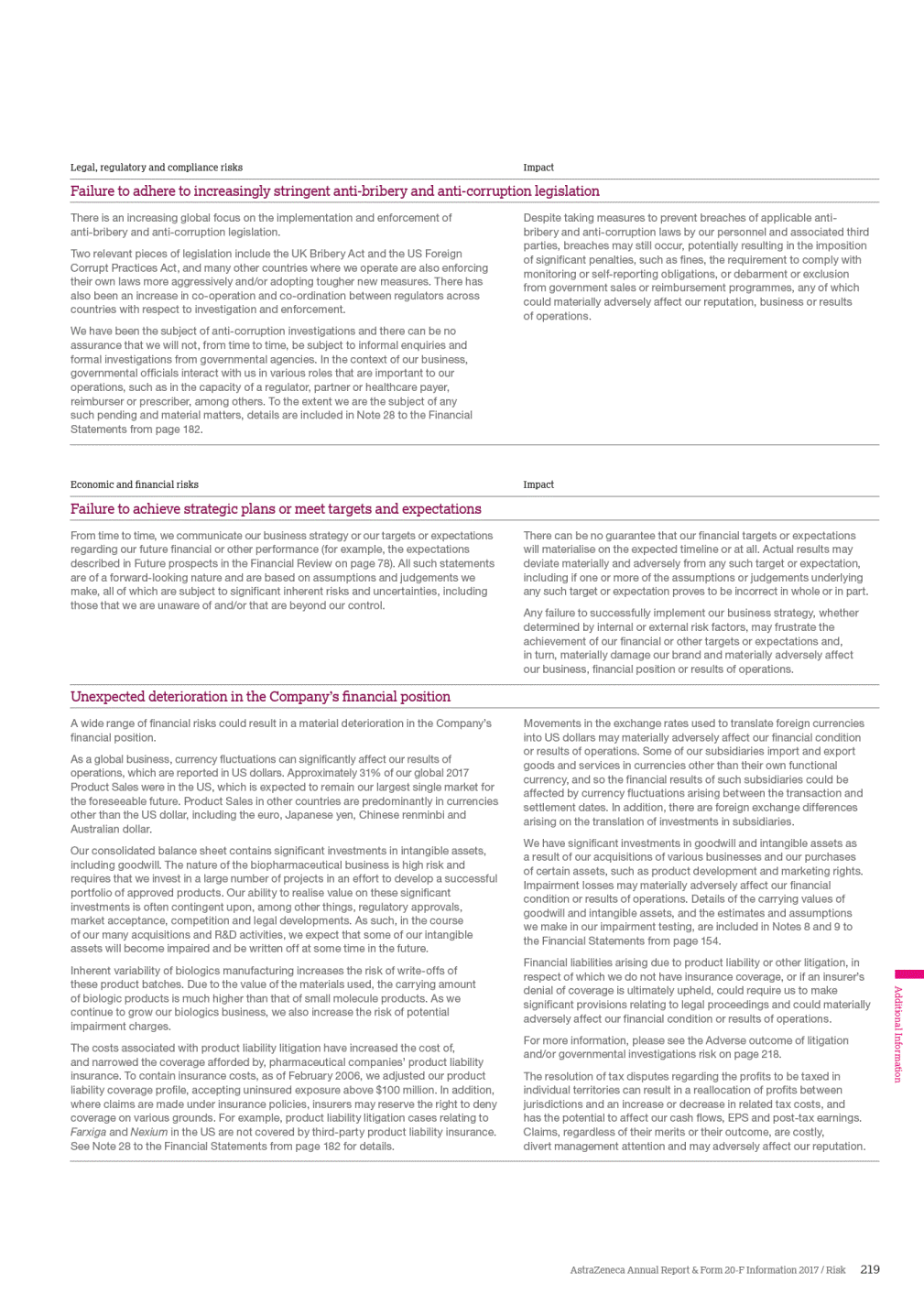 Legal, regulatory and compliance risks Impact Failure to adhere to increasingly stringent anti-bribery and anti-corruption legislation There is an increasing global focus on the implementation and enforcement of anti-bribery and anti-corruption legislation. Two relevant pieces of legislation include the UK Bribery Act and the US Foreign Corrupt Practices Act, and many other countries where we operate are also enforcing their own laws more aggressively and/or adopting tougher new measures. There has also been an increase in co-operation and co-ordination between regulators across countries with respect to investigation and enforcement. We have been the subject of anti-corruption investigations and there can be no assurance that we will not, from time to time, be subject to informal enquiries and formal investigations from governmental agencies. In the context of our business, governmental officials interact with us in various roles that are important to our operations, such as in the capacity of a regulator, partner or healthcare payer, reimburser or prescriber, among others. To the extent we are the subject of any such pending and material matters, details are included in Note 28 to the Financial Statements from page 182. Despite taking measures to prevent breaches of applicable anti-bribery and anti-corruption laws by our personnel and associated third parties, breaches may still occur, potentially resulting in the imposition of significant penalties, such as fines, the requirement to comply with monitoring or self-reporting obligations, or debarment or exclusion from government sales or reimbursement programmes, any of which could materially adversely affect our reputation, business or results of operations. Economic and financial risks Impact Failure to achieve strategic plans or meet targets and expectations From time to time, we communicate our business strategy or our targets or expectations regarding our future financial or other performance (for example, the expectations described in Future prospects in the Financial Review on page 78). All such statements are of a forward-looking nature and are based on assumptions and judgements we make, all of which are subject to significant inherent risks and uncertainties, including those that we are unaware of and/or that are beyond our control. There can be no guarantee that our financial targets or expectations will materialise on the expected timeline or at all. Actual results may deviate materially and adversely from any such target or expectation, including if one or more of the assumptions or judgements underlying any such target or expectation proves to be incorrect in whole or in part. Any failure to successfully implement our business strategy, whether determined by internal or external risk factors, may frustrate the achievement of our financial or other targets or expectations and, in turn, materially damage our brand and materially adversely affect our business, financial position or results of operations. Unexpected deterioration in the Company’s financial position A wide range of financial risks could result in a material deterioration in the Company’s financial position. As a global business, currency fluctuations can significantly affect our results of operations, which are reported in US dollars. Approximately 31% of our global 2017 Product Sales were in the US, which is expected to remain our largest single market for the foreseeable future. Product Sales in other countries are predominantly in currencies other than the US dollar, including the euro, Japanese yen, Chinese renminbi and Australian dollar. Our consolidated balance sheet contains significant investments in intangible assets, including goodwill. The nature of the biopharmaceutical business is high risk and requires that we invest in a large number of projects in an effort to develop a successful portfolio of approved products. Our ability to realise value on these significant investments is often contingent upon, among other things, regulatory approvals, market acceptance, competition and legal developments. As such, in the course of our many acquisitions and R&D activities, we expect that some of our intangible assets will become impaired and be written off at some time in the future. Inherent variability of biologics manufacturing increases the risk of write-offs of these product batches. Due to the value of the materials used, the carrying amount of biologic products is much higher than that of small molecule products. As we continue to grow our biologics business, we also increase the risk of potential impairment charges. The costs associated with product liability litigation have increased the cost of, and narrowed the coverage afforded by, pharmaceutical companies’ product liability insurance. To contain insurance costs, as of February 2006, we adjusted our product liability coverage profile, accepting uninsured exposure above $100 million. In addition, where claims are made under insurance policies, insurers may reserve the right to deny coverage on various grounds. For example, product liability litigation cases relating to Farxiga and Nexium in the US are not covered by third-party product liability insurance. See Note 28 to the Financial Statements from page 182 for details. Movements in the exchange rates used to translate foreign currencies into US dollars may materially adversely affect our financial condition or results of operations. Some of our subsidiaries import and export goods and services in currencies other than their own functional currency, and so the financial results of such subsidiaries could be affected by currency fluctuations arising between the transaction and settlement dates. In addition, there are foreign exchange differences arising on the translation of investments in subsidiaries. We have significant investments in goodwill and intangible assets as a result of our acquisitions of various businesses and our purchases o