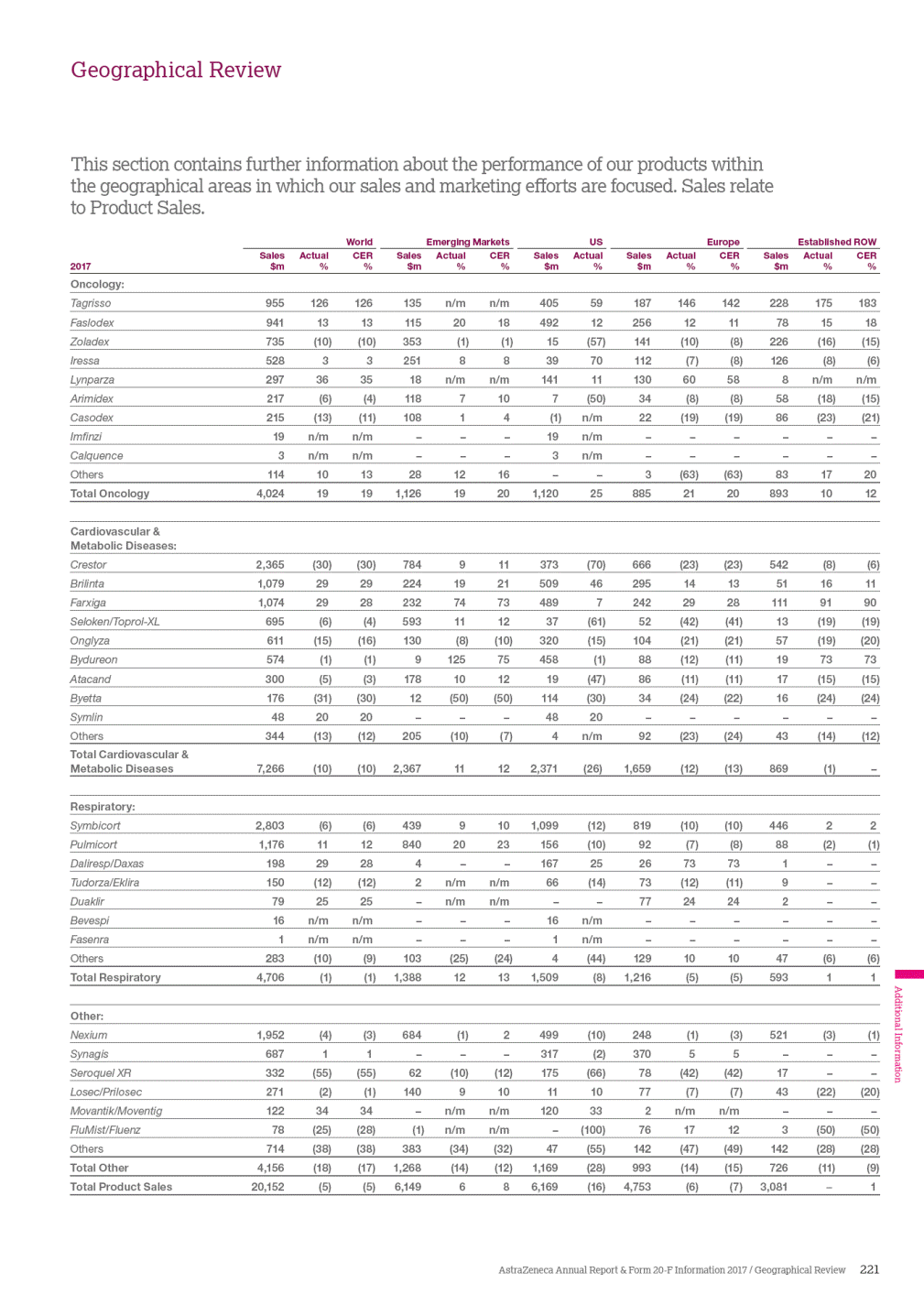 Geographical Review This section contains further information about the performance of our products within the geographical areas in which our sales and marketing efforts are focused. Sales relate to Product Sales. World Emerging Markets US Europe Established ROW Sales $m Actual % CER % Sales $m Actual % CER % Sales $m Actual % Sales $m Actual % CER % Sales $m Actual % CER % 2017 Oncology: Tagrisso 955 126 126 135 n/m n/m 405 59 187 146 142 228 175 183 Faslodex 941 13 13 115 20 18 492 12 256 12 11 78 15 18 Zoladex 735 (10) (10) 353 (1) (1) 15 (57) 141 (10) (8) 226 (16) (15) Iressa 528 3 3 251 8 8 39 70 112 (7) (8) 126 (8) (6) Lynparza 297 36 35 18 n/m n/m 141 11 130 60 58 8 n/m n/m Arimidex 217 (6) (4) 118 7 10 7 (50) 34 (8) (8) 58 (18) (15) Casodex 215 (13) (11) 108 1 4 (1) n/m 22 (19) (19) 86 (23) (21) Imfinzi 19 n/m n/m – – – 19 n/m – – – – – – Calquence 3 n/m n/m – – – 3 n/m – – – – – – Others 114 10 13 28 12 16 – – 3 (63) (63) 83 17 20 Total Oncology 4,024 19 19 1,126 19 20 1,120 25 885 21 20 893 10 12 Cardiovascular & Metabolic Diseases: Crestor 2,365 (30) (30) 784 9 11 373 (70) 666 (23) (23) 542 (8) (6) Brilinta 1,079 29 29 224 19 21 509 46 295 14 13 51 16 11 Farxiga 1,074 29 28 232 74 73 489 7 242 29 28 111 91 90 Seloken/Toprol-XL 695 (6) (4) 593 11 12 37 (61) 52 (42) (41) 13 (19) (19) Onglyza 611 (15) (16) 130 (8) (10) 320 (15) 104 (21) (21) 57 (19) (20) Bydureon 574 (1) (1) 9 125 75 458 (1) 88 (12) (11) 19 73 73 Atacand 300 (5) (3) 178 10 12 19 (47) 86 (11) (11) 17 (15) (15) Byetta 176 (31) (30) 12 (50) (50) 114 (30) 34 (24) (22) 16 (24) (24) Symlin 48 20 20 – – – 48 20 – – – – – – Others 344 (13) (12) 205 (10) (7) 4 n/m 92 (23) (24) 43 (14) (12) Total Cardiovascular & Metabolic Diseases 7,266 (10) (10) 2,367 11 12 2,371 (26) 1,659 (12) (13) 869 (1) – Respiratory: Symbicort 2,803 (6) (6) 439 9 10 1,099 (12) 819 (10) (10) 446 2 2 Pulmicort 1,176 11 12 840 20 23 156 (10) 92 (7) (8) 88 (2) (1) Daliresp/Daxas 198 29 28 4 – – 167 25 26 73 73 1 – – Tudorza/Eklira 150 (12) (12) 2 n/m n/m 66 (14) 73 (12) (11) 9 – – Duaklir 79 25 25 – n/m n/m – – 77 24 24 2 – – Bevespi 16 n/m n/m – – – 16 n/m – – – – – – Fasenra 1 n/m n/m – – – 1 n/m – – – – – – Others 283 (10) (9) 103 (25) (24) 4 (44) 129 10 10 47 (6) (6) Total Respiratory 4,706 (1) (1) 1,388 12 13 1,509 (8) 1,216 (5) (5) 593 1 1 Other: Nexium 1,952 (4) (3) 684 (1) 2 499 (10) 248 (1) (3) 521 (3) (1) Synagis 687 1 1 – – – 317 (2) 370 5 5 – – – Seroquel XR 332 (55) (55) 62 (10) (12) 175 (66) 78 (42) (42) 17 – – Losec/Prilosec 271 (2) (1) 140 9 10 11 10 77 (7) (7) 43 (22) (20) Movantik/Moventig 122 34 34 – n/m n/m 120 33 2 n/m n/m – – – FluMist/Fluenz 78 (25) (28) (1) n/m n/m – (100) 76 17 12 3 (50) (50) Others 714 (38) (38) 383 (34) (32) 47 (55) 142 (47) (49) 142 (28) (28) Total Other 4,156 (18) (17) 1,268 (14) (12) 1,169 (28) 993 (14) (15) 726 (11) (9) Total Product Sales 20,152 (5) (5) 6,149 6 8 6,169 (16) 4,753 (6) (7) 3,081 – 1 221 AstraZeneca Annual Report & Form 20-F Information 2017 / Geographical Review Additional Information