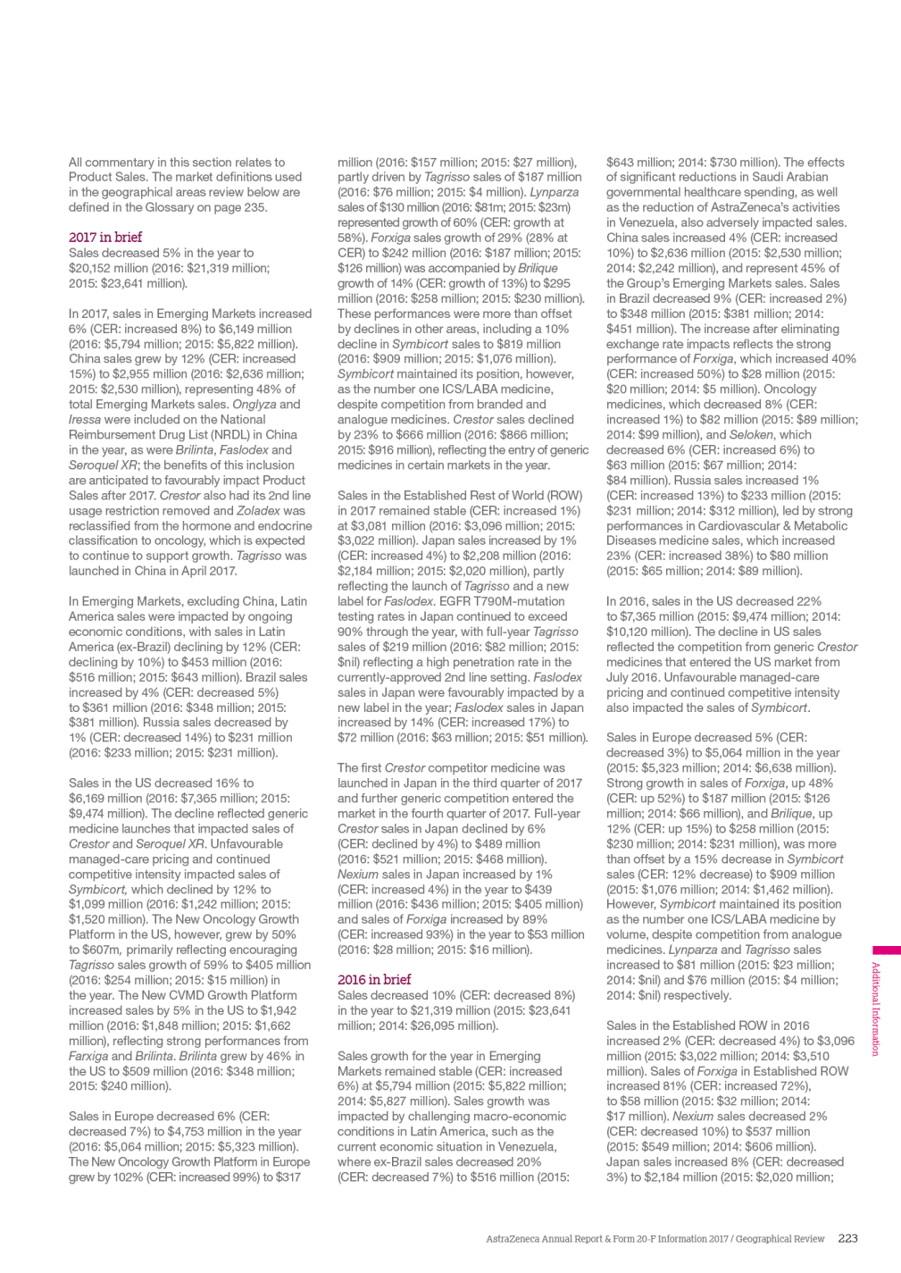 Geographical Review continued 2014: $2,227 million), reflecting the biennial price reduction effective from April 2016 of around 6% after eliminating the exchange rate impact. The CER percentage decline in Japan was partly mitigated by stable sales of Crestor of $521 million (2015: $468 million; 2014: $502 million) in the year. Since the launch of Tagrisso in Japan in March 2016, sales amounted to $82 million (2015 & 2014: $nil). Farxiga sales increased by 74% (CER: increased 73%) to $232 million (2016: $133 million; 2015: $73 million), reflecting ongoing launches and improved levels of patient access. In March 2017, Forxiga became the first SGLT2-inhibitor medicine to be approved in China. Tagrisso sales in the US were $405 million (2016: $254 million; 2015: $15 million) and grew by 59%, with a steady increase in epidermal growth factor receptor (EGFR) T790M-mutation testing rates. In September 2017, the US National Comprehensive Cancer Network clinical-practice guidelines were updated to include the use of Tagrisso in the 1st line treatment of patients with metastatic EGFR-mutated non-small cell lung cancer (NSCLC). The use of Tagrisso in this indication is not yet approved by the FDA. Onglyza sales in Emerging Markets declined by 8% (CER: decreased 10%) to $130 million (2016: $142 million; 2015: $159 million). Onglyza, however, entered the NRDL in China in the year, underpinning fourth quarter 2017 Emerging Markets sales growth. Sales by Region Emerging Markets Sales in Emerging Markets increased 6% (CER: increased 8%) to $6,149 million (2016: $5,794 million; 2015: $5,822 million). Iressa sales in the US increased by 70% to $39 million (2016: $23 million; 2015: $6 million). Respiratory Respiratory sales in Emerging Markets increased 12% (CER: increased 13%) to $1,388 million (2016: $1,243 million; 2015: $1,132 million). Sales of Lynparza grew by 11% in the year to $141 million (2016: $127 million; 2015: $70 million). First-half sales were adversely impacted by the introduction of competing poly ADP ribose polymerase (PARP) inhibitor medicines. A much-improved performance in the second half, however, reflected the launch of tablets for patients regardless of BRCA-mutation status, for the treatment of 2nd line ovarian cancer. By the end of November 2017, Lynparza was the leading PARP inhibitor in the US, measured by total prescription volumes. Oncology Oncology sales in the Emerging Markets increased 19% (CER: increased 20%) to $1,126 million (2016: $943 million; 2015: $943 million). Sales of Symbicort grew by 9% (CER: increased 10%) to $439 million (2016: $402 million; 2015: $394 million), partly reflecting growth in China of 13% (CER: increased 17%) to $177 million (2016: $156 million; 2015: $124 million) and in Latin America (ex-Brazil), where sales grew by 24% (CER: increased 30%) to $46 million (2016: $37 million; 2015: $42 million). Sales of Tagrisso were $135 million in the year (2016: $10 million; 2015: $nil). Sales of Iressa increased by 8% to $251 million (2016: $233 million; 2015: $272 million). China sales increased by 24% (CER: increased 28%) to $144 million (2016: $116 million; 2015: $146 million), reflecting an improvement in patient access following the conclusion of the national negotiation process in 2016; Iressa was subsequently included on the NRDL. Other Emerging Markets sales were adversely impacted by competition from branded and generic medicines, most notably in the Republic of Korea. Faslodex sales increased by 12% to $492 million (2016: $438 million; 2015: $356 million), mainly reflecting a continued strong uptake of the combination with palbociclib, a medicine approved for the treatment of hormone-receptor-positive (HR+) breast cancer. Pulmicort sales increased by 20% (CER: increased 23%) to $840 million (2016: $698 million; 2015: $609 million), reflecting strong underlying volume growth, with sales in China, Middle East and North Africa proving particularly encouraging. Usage in China continued to progress, with an increasing prevalence of acute COPD and paediatric asthma accompanied by continued investment by AstraZeneca in new hospital nebulisation centres by around 2,000 to 15,000. The sales of Imfinzi were $19 million (2016: $nil; 2015: $nil). Imfinzi launched in the US in May 2017. Imfinzi was approved under the FDA’s Accelerated Approval pathway and launched on the same day as a fast-to-market, limited commercial opportunity, indicated for the 2nd line treatment of patients with locally-advanced or metastatic urothelial carcinoma (bladder cancer). AstraZeneca is actively preparing for the potential launch of Imfinzi in locally-advanced, unresectable NSCLC in the first half of 2018, reflecting the FDA regulatory submission acceptance and the award of Priority Review status in the fourth quarter of 2017. Sales of Faslodex grew by 20% (CER: increased 18%) to $115 million (2016: $96 million; 2015: $87 million). In 2017, AstraZeneca received a label extension for Faslodex in Russia in the 1st line monotherapy setting, based on data from the FALCON trial. Russia sales grew by 29% in the year (CER: increased 14%) to $18 million (2016: $14 million; 2015: $9 million). Other Other sales in Emerging Markets decreased 14% (CER: decreased 12%) to $1,268 million (2016: $1,469 million; 2015: $1,627 million). Nexium sales declined by 1% (CER: increased 2%) to $684 million (2016: $690 million; 2015: $761 million). Sales of Zoladex declined by 1% to $353 million in the year (2016: $355 million; 2015: $345 million). US Sales in the US decreased 16% to $6,169 million (2016: $7,365 million; 2015: $9,474 million). The sales of Calquence were $3 million (2016 & 2015: $nil). Calquence delivered a promising performance in the number of new patient starts in previously-treated mantle cell lymphoma (MCL). The medicine was included within National Comprehensive Cancer Network guidelines from 15 November 2017. Cardiovascular & Metabolic Diseases Cardiovascular & Metabolic Diseas