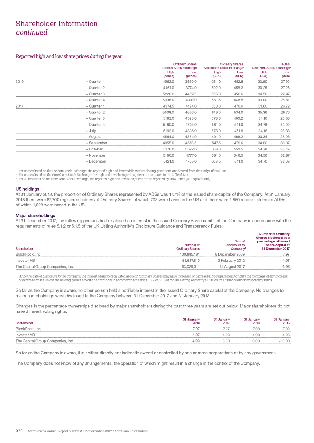 Shareholder Information continued Reported high and low share prices during the year Ordinary Shares London Stock Exchange1 Ordinary Shares Stockholm Stock Exchange2 ADRs New York Stock Exchange3 High (pence) Low (pence) High (SEK) Low (SEK) High (US$) Low (US$) 2016 – Quarter 1 4562.0 3890.0 584.0 452.8 33.90 27.95 – Quarter 2 4467.0 3774.0 592.0 458.2 30.25 27.26 – Quarter 3 5220.0 4469.5 556.0 456.6 34.50 29.97 – Quarter 4 5096.0 4007.0 581.5 448.5 33.00 25.81 2017 – Quarter 1 4974.5 4194.0 558.0 470.6 31.80 26.72 – Quarter 2 5508.0 4566.0 619.0 534.0 35.36 29.76 – Quarter 3 5192.0 4325.0 578.0 466.2 34.16 28.88 – Quarter 4 5180.0 4705.0 581.0 541.0 34.78 32.09 – July 5192.0 4325.0 578.0 471.8 34.16 28.88 – August 4564.0 4384.0 491.9 466.2 30.34 28.96 – September 4955.0 4573.5 547.5 479.6 34.00 30.07 – October 5176.0 5022.0 568.0 552.5 34.78 33.49 – November 5180.0 4777.0 581.0 546.5 34.56 32.87 – December 5121.0 4705.0 568.5 541.0 34.70 32.09 1 For shares listed on the London Stock Exchange, the reported high and low middle market closing quotations are derived from the Daily Official List. 2 For shares listed on the Stockholm Stock Exchange, the high and low closing sales prices are as stated in the Official List. 3 For ADRs listed on the New York Stock Exchange, the reported high and low sales prices are as reported by Dow Jones (ADR quotations). US holdings At 31 January 2018, the proportion of Ordinary Shares represented by ADSs was 17.7% of the issued share capital of the Company. At 31 January 2018 there were 87,700 registered holders of Ordinary Shares, of which 703 were based in the US and there were 1,850 record holders of ADRs, of which 1,828 were based in the US. Major shareholdings At 31 December 2017, the following persons had disclosed an interest in the issued Ordinary Share capital of the Company in accordance with the requirements of rules 5.1.2 or 5.1.5 of the UK Listing Authority’s Disclosure Guidance and Transparency Rules: Number of Ordinary Shares disclosed as a Date of disclosure to Company1 percentage of issued share capital at 31 December 2017 Number of Ordinary Shares Shareholder BlackRock, Inc. 100,885,181 8 December 2009 7.97 Investor AB 51,587,810 2 February 2012 4.07 The Capital Group Companies, Inc. 63,029,311 14 August 2017 4.98 1 Since the date of disclosure to the Company, the interest of any person listed above in Ordinary Shares may have increased or decreased. No requirement to notify the Company of any increase or decrease arises unless the holding passes a notifiable threshold in accordance with rules 5.1.2 or 5.1.5 of the UK Listing Authority’s Disclosure Guidance and Transparency Rules. So far as the Company is aware, no other person held a notifiable interest in the issued Ordinary Share capital of the Company. No changes to major shareholdings were disclosed to the Company between 31 December 2017 and 31 January 2018. Changes in the percentage ownerships disclosed by major shareholders during the past three years are set out below. Major shareholders do not have different voting rights. 31 January 2018 31 January 2017 31 January 2016 31 January 2015 Shareholder BlackRock, Inc. 7.97 7.97 7.98 7.99 Investor AB 4.07 4.08 4.08 4.08 The Capital Group Companies, Inc. 4.98 3.00 3.00 < 3.00 So far as the Company is aware, it is neither directly nor indirectly owned or controlled by one or more corporations or by any government. The Company does not know of any arrangements, the operation of which might result in a change in the control of the Company. 230 AstraZeneca Annual Report & Form 20-F Information 2017 / Additional Information