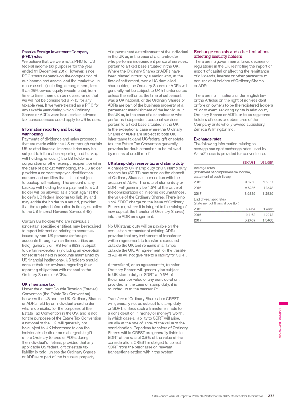 Exchange controls and other limitations affecting security holders There are no governmental laws, decrees or regulations in the UK restricting the import or export of capital or affecting the remittance of dividends, interest or other payments to non-resident holders of Ordinary Shares or ADRs. Passive Foreign Investment Company (PFIC) rules We believe that we were not a PFIC for US federal income tax purposes for the year ended 31 December 2017. However, since PFIC status depends on the composition of our income and assets, and the market value of our assets (including, among others, less than 25% owned equity investments), from time to time, there can be no assurance that we will not be considered a PFIC for any taxable year. If we were treated as a PFIC for any taxable year during which Ordinary Shares or ADRs were held, certain adverse tax consequences could apply to US holders. of a permanent establishment of the individual in the UK or, in the case of a shareholder who performs independent personal services, pertain to a fixed base situated in the UK. Where the Ordinary Shares or ADRs have been placed in trust by a settlor who, at the time of settlement, was a US domiciled shareholder, the Ordinary Shares or ADRs will generally not be subject to UK inheritance tax unless the settlor, at the time of settlement, was a UK national, or the Ordinary Shares or ADRs are part of the business property of a permanent establishment of the individual in the UK or, in the case of a shareholder who performs independent personal services, pertain to a fixed base situated in the UK. In the exceptional case where the Ordinary Shares or ADRs are subject to both UK inheritance tax and US federal gift or estate tax, the Estate Tax Convention generally provides for double taxation to be relieved by means of credit relief. There are no limitations under English law or the Articles on the right of non-resident or foreign owners to be the registered holders of, or to exercise voting rights in relation to, Ordinary Shares or ADRs or to be registered holders of notes or debentures of the Company or its wholly-owned subsidiary, Zeneca Wilmington Inc. Information reporting and backup withholding Payments of dividends and sales proceeds that are made within the US or through certain US-related financial intermediaries may be subject to information reporting and backup withholding, unless: (i) the US holder is a corporation or other exempt recipient; or (ii) in the case of backup withholding, the US holder provides a correct taxpayer identification number and certifies that it is not subject to backup withholding. The amount of any backup withholding from a payment to a US holder will be allowed as a credit against the holder’s US federal income tax liability and may entitle the holder to a refund, provided that the required information is timely supplied to the US Internal Revenue Service (IRS). Exchange rates The following information relating to average and spot exchange rates used by AstraZeneca is provided for convenience: UK stamp duty reserve tax and stamp duty A charge to UK stamp duty or UK stamp duty reserve tax (SDRT) may arise on the deposit of Ordinary Shares in connection with the creation of ADRs. The rate of stamp duty or SDRT will generally be 1.5% of the value of the consideration or, in some circumstances, the value of the Ordinary Shares. There is no 1.5% SDRT charge on the issue of Ordinary Shares (or, where it is integral to the raising of new capital, the transfer of Ordinary Shares) into the ADR arrangement. SEK/US$ US$/GBP Average rates (statement of comprehensive income, statement of cash flows) 2015 8.3950 1.5357 2016 8.5286 1.3673 2017 8.5835 1.2835 End of year spot rates (statement of financial position) 2015 8.4114 1.4816 2016 9.1162 1.2272 2017 8.2467 1.3468 Certain US holders who are individuals (or certain specified entities), may be required to report information relating to securities issued by non-US persons (or foreign accounts through which the securities are held), generally on IRS Form 8938, subject to certain exceptions (including an exception for securities held in accounts maintained by US financial institutions). US holders should consult their tax advisers regarding their reporting obligations with respect to the Ordinary Shares or ADRs. No UK stamp duty will be payable on the acquisition or transfer of existing ADRs provided that any instrument of transfer or written agreement to transfer is executed outside the UK and remains at all times outside the UK. An agreement for the transfer of ADRs will not give rise to a liability for SDRT. A transfer of, or an agreement to, transfer Ordinary Shares will generally be subject to UK stamp duty or SDRT at 0.5% of the amount or value of any consideration, provided, in the case of stamp duty, it is rounded up to the nearest £5. UK inheritance tax Under the current Double Taxation (Estates) Convention (the Estate Tax Convention) between the US and the UK, Ordinary Shares or ADRs held by an individual shareholder who is domiciled for the purposes of the Estate Tax Convention in the US, and is not for the purposes of the Estate Tax Convention a national of the UK, will generally not be subject to UK inheritance tax on the individual’s death or on a chargeable gift of the Ordinary Shares or ADRs during the individual’s lifetime, provided that any applicable US federal gift or estate tax liability is paid, unless the Ordinary Shares or ADRs are part of the business property Transfers of Ordinary Shares into CREST will generally not be subject to stamp duty or SDRT, unless such a transfer is made for a consideration in money or money’s worth, in which case a liability to SDRT will arise, usually at the rate of 0.5% of the value of the consideration. Paperless transfers of Ordinary Shares within CREST are generally liable to SDRT at the rate of 0.5% of the value of the consideration. CREST is obliged to collect SDRT from t