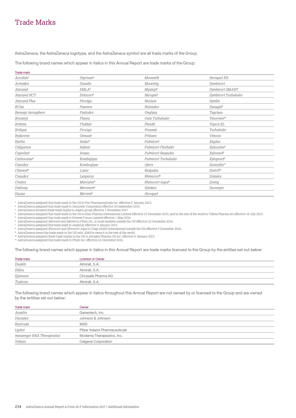 Trade Marks AstraZeneca, the AstraZeneca logotype, and the AstraZeneca symbol are all trade marks of the Group. The following brand names which appear in italics in this Annual Report are trade marks of the Group: Trade mark Accolate1 Diprivan3 Movantik Seroquel XR Arimidex Duzallo Moventig Symbicort Atacand EMLA3 Myalept7 Symbicort SMART Atacand HCT Entocort4 Naropin3 Symbicort Turbuhaler Atacand Plus Farxiga Nexium Symlin BCise Fasenra Nolvadex Synagis9 Bevespi Aerosphere Faslodex Onglyza Tagrisso Bricanyl Fluenz Oxis Turbuhaler Tenormin10 Brilinta FluMist Plendil Toprol-XL Brilique Forxiga Pressair Turbuhaler Bydureon Genuair Prilosec Vimovo Byetta Imdur5 Pulmicort Xigduo Calquence Imfinzi Pulmicort Flexhaler Xylocaine3 Caprelsa2 Iressa Pulmicort Respules Xylocard3 Carbocaine3 Kombiglyze Pulmicort Turbuhaler Xyloproct3 Casodex Komboglyze Qtern Zavicefta11 Citanest3 Losec Respules Zestril10 Cosudex Lynparza Rhinocort8 Zoladex Crestor Marcaine3 Rhinocort Aqua8 Zomig Daliresp Meronem6 Seloken Zurampic Daxas Merrem6 Seroquel 1 AstraZeneca assigned this trade mark in the US to Par Pharmaceuticals Inc. effective 5 January 2015. 2 AstraZeneca assigned this trade mark to Genzyme Corporation effective 30 September 2015. 3 AstraZeneca divested these trade marks to Aspen group effective 1 November 2017. 4 AstraZeneca assigned this trade mark in the US to Elan Pharma International Limited effective 15 December 2015, and in the rest of the world to Tillots Pharma AG effective 16 July 2015. 5 AstraZeneca assigned this trade mark to Everest Future Limited effective 1 May 2016. 6 AstraZeneca assigned Meronem and Merrem to Pfizer Inc. in most markets outside the US effective 23 December 2016. 7 AstraZeneca assigned this trade mark to Aegerion effective 9 January 2015. 8 AstraZeneca assigned Rhinocort and Rhinocort Aqua to Cilag GmbH International outside the US effective 5 December 2016. 9 AstraZeneca owns this trade mark in the US only. AbbVie owns it in the rest of the world. 10 AstraZeneca assigned these trade marks in the US to Alvogen Pharma US Inc. effective 9 January 2015. 11 AstraZeneca assigned this trade mark to Pfizer Inc. effective 23 December 2016. The following brand names which appear in italics in this Annual Report are trade marks licensed to the Group by the entities set out below: Trade mark Licensor or Owner Duaklir Almirall, S.A. Eklira Almirall, S.A. Epanova Chrysalis Pharma AG Tudorza Almirall, S.A. The following brand names which appear in italics throughout this Annual Report are not owned by or licensed to the Group and are owned by the entities set out below: Trade mark Owner Avastin Genentech, Inc. Darzalex Johnson & Johnson Keytruda MSD Lipitor Pfizer Ireland Pharmaceuticals messenger RNA Therapeutics Moderna Therapeutics, Inc. Vidaza Celgene Corporation 234 AstraZeneca Annual Report & Form 20-F Information 2017 / Additional Information
