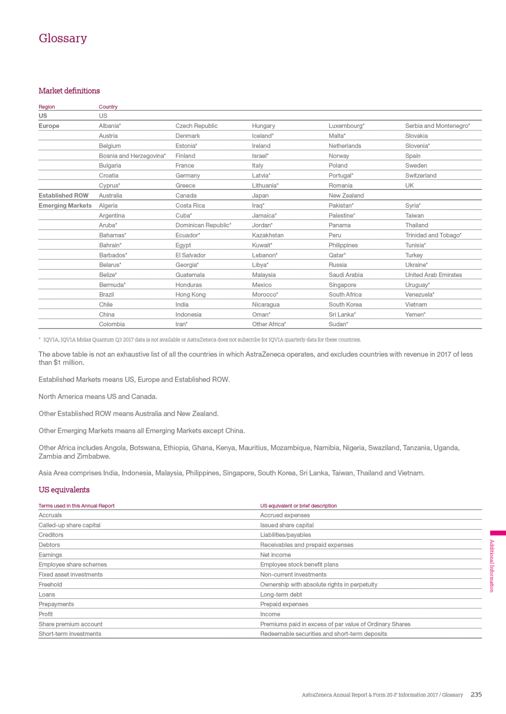 Glossary Market definitions Region Country US US Europe Albania* Czech Republic Hungary Luxembourg* Serbia and Montenegro* Austria Denmark Iceland* Malta* Slovakia Belgium Estonia* Ireland Netherlands Slovenia* Bosnia and Herzegovina* Finland Israel* Norway Spain Bulgaria France Italy Poland Sweden Croatia Germany Latvia* Portugal* Switzerland Cyprus* Greece Lithuania* Romania UK Established ROW Australia Canada Japan New Zealand Emerging Markets Algeria Costa Rica Iraq* Pakistan* Syria* Argentina Cuba* Jamaica* Palestine* Taiwan Aruba* Dominican Republic* Jordan* Panama Thailand Bahamas* Ecuador* Kazakhstan Peru Trinidad and Tobago* Bahrain* Egypt Kuwait* Philippines Tunisia* Barbados* El Salvador Lebanon* Qatar* Turkey Belarus* Georgia* Libya* Russia Ukraine* Belize* Guatemala Malaysia Saudi Arabia United Arab Emirates Bermuda* Honduras Mexico Singapore Uruguay* Brazil Hong Kong Morocco* South Africa Venezuela* Chile India Nicaragua South Korea Vietnam China Indonesia Oman* Sri Lanka* Yemen* Colombia Iran* Other Africa* Sudan* * IQVIA, IQVIA Midas Quantum Q3 2017 data is not available or AstraZeneca does not subscribe for IQVIA quarterly data for these countries. The above table is not an exhaustive list of all the countries in which AstraZeneca operates, and excludes countries with revenue in 2017 of less than $1 million. Established Markets means US, Europe and Established ROW. North America means US and Canada. Other Established ROW means Australia and New Zealand. Other Emerging Markets means all Emerging Markets except China. Other Africa includes Angola, Botswana, Ethiopia, Ghana, Kenya, Mauritius, Mozambique, Namibia, Nigeria, Swaziland, Tanzania, Uganda, Zambia and Zimbabwe. Asia Area comprises India, Indonesia, Malaysia, Philippines, Singapore, South Korea, Sri Lanka, Taiwan, Thailand and Vietnam. US equivalents Terms used in this Annual Report US equivalent or brief description Accruals Accrued expenses Called-up share capital Issued share capital Creditors Liabilities/payables Debtors Receivables and prepaid expenses Earnings Net income Employee share schemes Employee stock benefit plans Fixed asset investments Non-current investments Freehold Ownership with absolute rights in perpetuity Loans Long-term debt Prepayments Prepaid expenses Profit Income Share premium account Premiums paid in excess of par value of Ordinary Shares Short-term investments Redeemable securities and short-term deposits 235 AstraZeneca Annual Report & Form 20-F Information 2017 / Glossary Additional Information