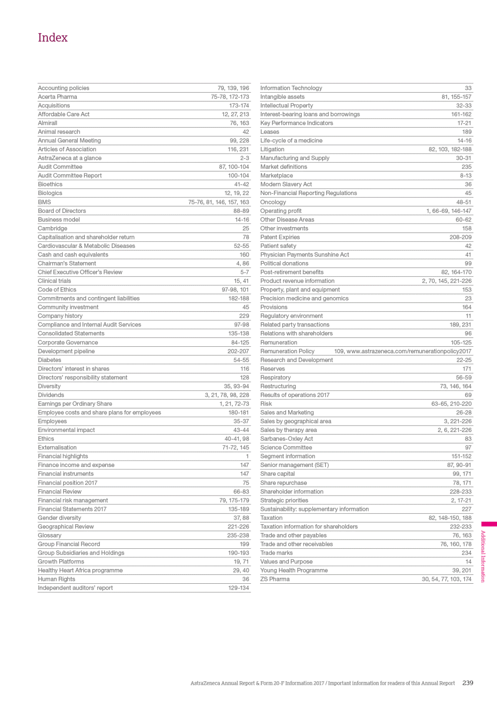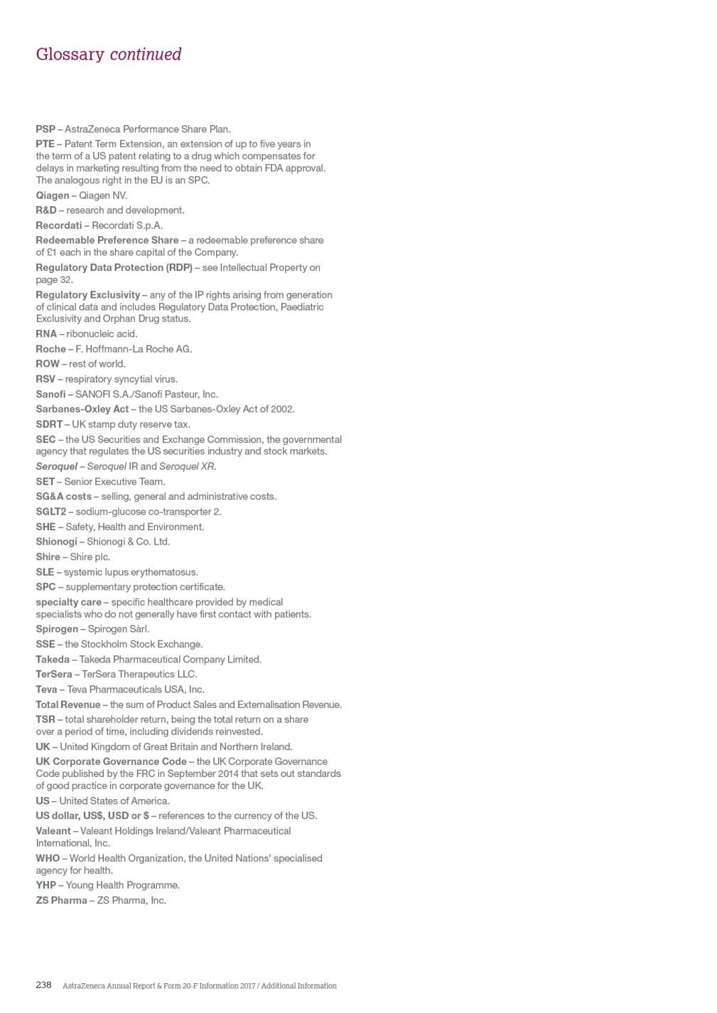 Glossary continued PSP – AstraZeneca Performance Share Plan. PTE – Patent Term Extension, an extension of up to five years in the term of a US patent relating to a drug which compensates for delays in marketing resulting from the need to obtain FDA approval. The analogous right in the EU is an SPC. Qiagen – Qiagen NV. R&D – research and development. Recordati – Recordati S.p.A. Redeemable Preference Share – a redeemable preference share of £1 each in the share capital of the Company. Regulatory Data Protection (RDP) – see Intellectual Property on page 32. Regulatory Exclusivity – any of the IP rights arising from generation of clinical data and includes Regulatory Data Protection, Paediatric Exclusivity and Orphan Drug status. RNA – ribonucleic acid. Roche – F. Hoffmann-La Roche AG. ROW – rest of world. RSV – respiratory syncytial virus. Sanofi – SANOFI S.A./Sanofi Pasteur, Inc. Sarbanes-Oxley Act – the US Sarbanes-Oxley Act of 2002. SDRT – UK stamp duty reserve tax. SEC – the US Securities and Exchange Commission, the governmental agency that regulates the US securities industry and stock markets. Seroquel – Seroquel IR and Seroquel XR. SET – Senior Executive Team. SG&A costs – selling, general and administrative costs. SGLT2 – sodium-glucose co-transporter 2. SHE – Safety, Health and Environment. Shionogi – Shionogi & Co. Ltd. Shire – Shire plc. SLE – systemic lupus erythematosus. SPC – supplementary protection certificate. specialty care – specific healthcare provided by medical specialists who do not generally have first contact with patients. Spirogen – Spirogen Sàrl. SSE – the Stockholm Stock Exchange. Takeda – Takeda Pharmaceutical Company Limited. TerSera – TerSera Therapeutics LLC. Teva – Teva Pharmaceuticals USA, Inc. Total Revenue – the sum of Product Sales and Externalisation Revenue. TSR – total shareholder return, being the total return on a share over a period of time, including dividends reinvested. UK – United Kingdom of Great Britain and Northern Ireland. UK Corporate Governance Code – the UK Corporate Governance Code published by the FRC in September 2014 that sets out standards of good practice in corporate governance for the UK. US – United States of America. US dollar, US$, USD or $ – references to the currency of the US. Valeant – Valeant Holdings Ireland/Valeant Pharmaceutical International, Inc. WHO – World Health Organization, the United Nations’ specialised agency for health. YHP – Young Health Programme. ZS Pharma – ZS Pharma, Inc. 238 AstraZeneca Annual Report & Form 20-F Information 2017 / Additional Information
