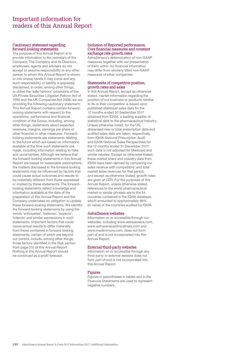 Important information for readers of this Annual Report Cautionary statement regarding forward-looking statements The purpose of this Annual Report is to provide information to the members of the Company. The Company and its Directors, employees, agents and advisers do not accept or assume responsibility to any other person to whom this Annual Report is shown or into whose hands it may come and any such responsibility or liability is expressly disclaimed. In order, among other things, to utilise the ‘safe harbour’ provisions of the US Private Securities Litigation Reform Act of 1995 and the UK Companies Act 2006, we are providing the following cautionary statement: This Annual Report contains certain forward-looking statements with respect to the operations, performance and financial condition of the Group, including, among other things, statements about expected revenues, margins, earnings per share or other financial or other measures. Forward-looking statements are statements relating to the future which are based on information available at the time such statements are made, including information relating to risks and uncertainties. Although we believe that the forward-looking statements in this Annual Report are based on reasonable assumptions, the matters discussed in the forward-looking statements may be influenced by factors that could cause actual outcomes and results to be materially different from those expressed or implied by these statements. The forward-looking statements reflect knowledge and information available at the date of the preparation of this Annual Report and the Company undertakes no obligation to update these forward-looking statements. We identify the forward-looking statements by using the words ‘anticipates’, ‘believes’, ‘expects’, ‘intends’ and similar expressions in such statements. Important factors that could cause actual results to differ materially from those contained in forward-looking statements, certain of which are beyond our control, include, among other things, those factors identified in the Risk section from page 210 of this Annual Report. Nothing in this Annual Report should be construed as a profit forecast. Inclusion of Reported performance, Core financial measures and constant exchange rate growth rates AstraZeneca’s determination of non-GAAP measures together with our presentation of them within our financial information may differ from similarly titled non-GAAP measures of other companies. Statements of competitive position, growth rates and sales In this Annual Report, except as otherwise stated, market information regarding the position of our business or products relative to its or their competition is based upon published statistical sales data for the 12 months ended 30 September 2017 obtained from IQVIA, a leading supplier of statistical data to the pharmaceutical industry. Unless otherwise noted, for the US, dispensed new or total prescription data and audited sales data are taken, respectively, from IQVIA National Prescription Audit and IQVIA National Sales Perspectives for the 12 months ended 31 December 2017; such data is not adjusted for Medicaid and similar rebates. Except as otherwise stated, these market share and industry data from IQVIA have been derived by comparing our sales revenue with competitors’ and total market sales revenues for that period, and except as otherwise stated, growth rates are given at CER. For the purposes of this Annual Report, unless otherwise stated, references to the world pharmaceutical market or similar phrases are to the 54 countries contained in the IQVIA database, which amounted to approximately 96% (in value) of the countries audited by IQVIA. AstraZeneca websites Information on or accessible through our websites, including www.astrazeneca.com, www.astrazenecaclinicaltrials.com and www.medimmune.com, does not form part of and is not incorporated into this Annual Report. External/third-party websites Information on or accessible through any third-party or external website does not form part of and is not incorporated into this Annual Report. Figures Figures in parentheses in tables and in the Financial Statements are used to represent negative numbers. 240 AstraZeneca Annual Report & Form 20-F Information 2017 / Additional Information