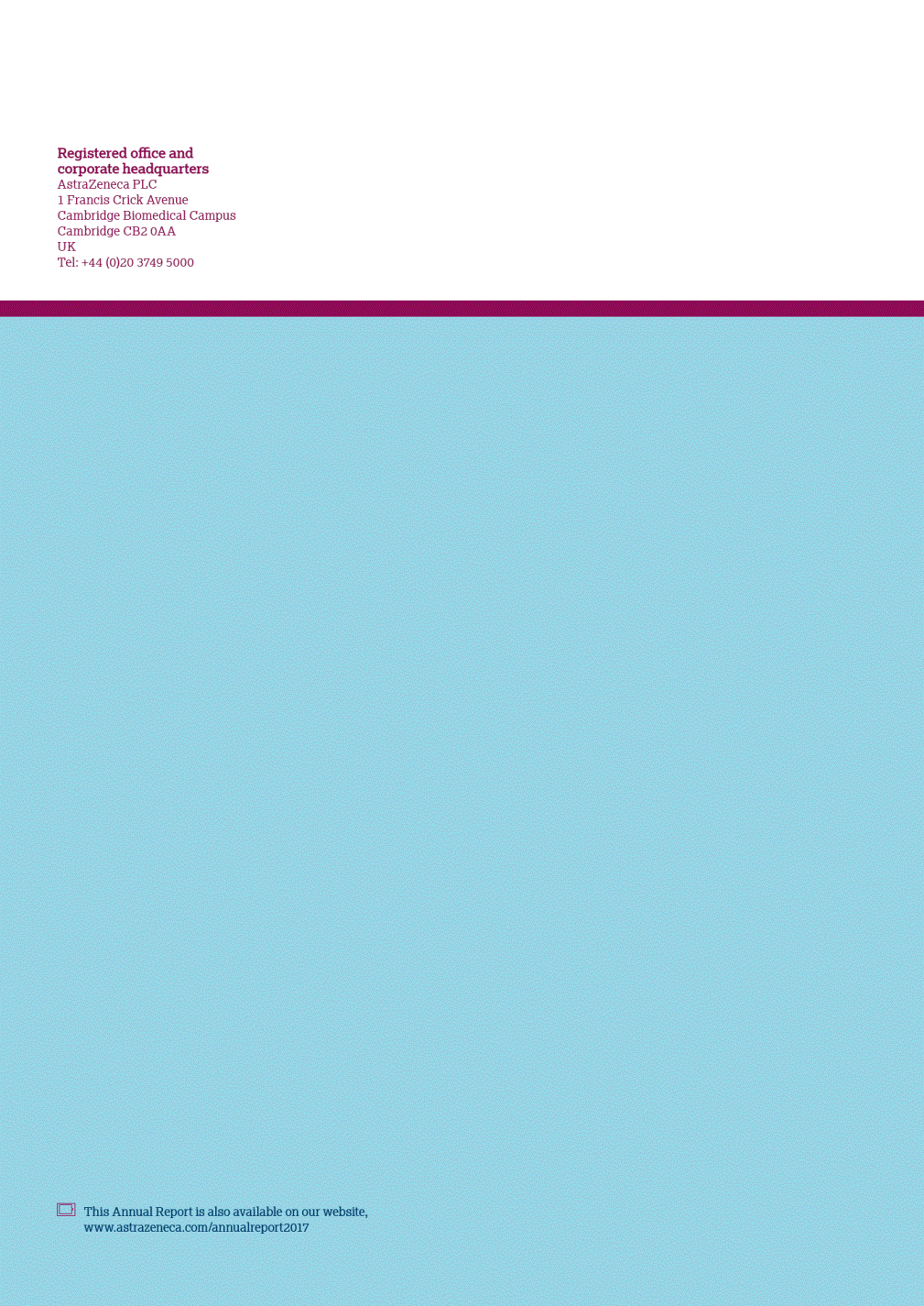 Registered office and corporate headquarters AstraZeneca PLC 1 Francis Crick Avenue Cambridge Biomedical Campus Cambridge CB2 0AA UK Tel: +44 (0)20 3749 5000 This Annual Report is also available on our website, www.astrazeneca.com/annualreport2017