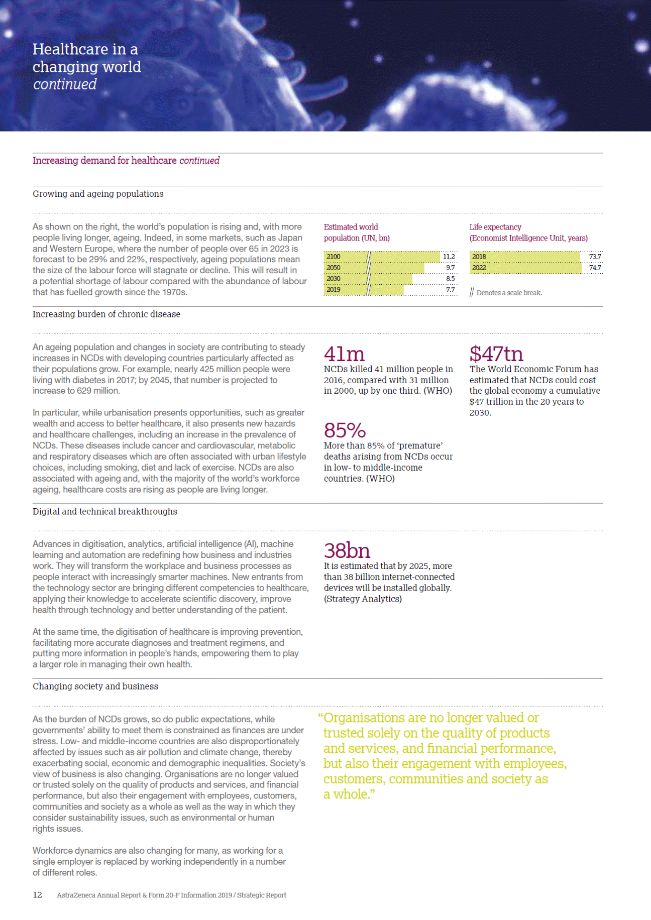 Healthcare in a changing world continued Increasing demand for healthcare continued Growing and ageing populations As shown on the right, the world’s population is rising and, with more people living longer, ageing. Indeed, in some markets, such as Japan and Western Europe, where the number of people over 65 in 2023 is forecast to be 29% and 22%, respectively, ageing populations mean the size of the labour force will stagnate or decline. This will result in a potential shortage of labour compared with the abundance of labour that has fuelled growth since the 1970s. Estimated world population (UN, bn) Life expectancy (Economist Intelligence Unit, years) Denotes a scale break. Increasing burden of chronic disease An ageing population and changes in society are contributing to steady increases in NCDs with developing countries particularly affected as their populations grow. For example, nearly 425 million people were living with diabetes in 2017; by 2045, that number is projected to increase to 629 million. 41m NCDs killed 41 million people in 2016, compared with 31 million in 2000, up by one third. (WHO) $47tn The World Economic Forum has estimated that NCDs could cost the global economy a cumulative $47 trillion in the 20 years to 2030. In particular, while urbanisation presents opportunities, such as greater wealth and access to better healthcare, it also presents new hazards and healthcare challenges, including an increase in the prevalence of NCDs. These diseases include cancer and cardiovascular, metabolic and respiratory diseases which are often associated with urban lifestyle choices, including smoking, diet and lack of exercise. NCDs are also associated with ageing and, with the majority of the world’s workforce ageing, healthcare costs are rising as people are living longer. 85% More than 85% of ‘premature’ deaths arising from NCDs occur in low-to middle-income countries. (WHO) Digital and technical breakthroughs Advances in digitisation, analytics, artificial intelligence (AI), machine learning and automation are redefining how business and industries work. They will transform the workplace and business processes as people interact with increasingly smarter machines. New entrants from the technology sector are bringing different competencies to healthcare, applying their knowledge to accelerate scientific discovery, improve health through technology and better understanding of the patient. 38bn It is estimated that by 2025, more than 38 billion internet-connected devices will be installed globally. (Strategy Analytics) At the same time, the digitisation of healthcare is improving prevention, facilitating more accurate diagnoses and treatment regimens, and putting more information in people’s hands, empowering them to play a larger role in managing their own health. Changing society and business “Organisations are no longer valued or trusted solely on the quality of products and services, and financial performance, but also their engagement with employees, customers, communities and society as a whole.” As the burden of NCDs grows, so do public expectations, while governments’ ability to meet them is constrained as finances are under stress. Low-and middle-income countries are also disproportionately affected by issues such as air pollution and climate change, thereby exacerbating social, economic and demographic inequalities. Society’s view of business is also changing. Organisations are no longer valued or trusted solely on the quality of products and services, and financial performance, but also their engagement with employees, customers, communities and society as a whole as well as the way in which they consider sustainability issues, such as environmental or human rights issues. Workforce dynamics are also changing for many, as working for a single employer is replaced by working independently in a number of different roles. 12 AstraZeneca Annual Report & Form 20-F Information 2019 / Strategic Report 2018 73.7 2022 74.7 2100 11.2 2050 9.7 2030 8.5 2019 7.7