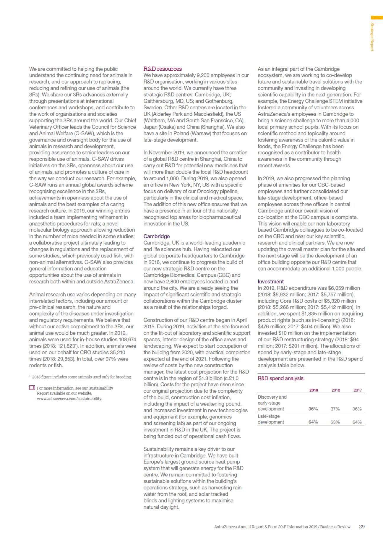R&D resources We have approximately 9,200 employees in our R&D organisation, working in various sites around the world. We currently have three strategic R&D centres: Cambridge, UK; Gaithersburg, MD, US; and Gothenburg, Sweden. Other R&D centres are located in the UK (Alderley Park and Macclesfield), the US (Waltham, MA and South San Franscico, CA), Japan (Osaka) and China (Shanghai). We also have a site in Poland (Warsaw) that focuses on late-stage development. We are committed to helping the public understand the continuing need for animals in research, and our approach to replacing, reducing and refining our use of animals (the 3Rs). We share our 3Rs advances externally through presentations at international conferences and workshops, and contribute to the work of organisations and societies supporting the 3Rs around the world. Our Chief Veterinary Officer leads the Council for Science and Animal Welfare (C-SAW), which is the governance and oversight body for the use of animals in research and development, providing assurance to senior leaders on our responsible use of animals. C-SAW drives initiatives on the 3Rs, openness about our use of animals, and promotes a culture of care in the way we conduct our research. For example, C-SAW runs an annual global awards scheme recognising excellence in the 3Rs, achievements in openness about the use of animals and the best examples of a caring research culture. In 2019, our winning entries included a team implementing refinement in anaesthetic procedures for rats; a novel molecular biology approach allowing reduction in the number of mice needed in some studies; a collaborative project ultimately leading to changes in regulations and the replacement of some studies, which previously used fish, with non-animal alternatives. C-SAW also provides general information and education opportunities about the use of animals in research both within and outside AstraZeneca. As an integral part of the Cambridge ecosystem, we are working to co-develop future and sustainable travel solutions with the community and investing in developing scientific capability in the next generation. For example, the Energy Challenge STEM initiative fostered a community of volunteers across AstraZeneca’s employees in Cambridge to bring a science challenge to more than 4,000 local primary school pupils. With its focus on scientific method and topicality around fostering awareness of the calorific value in foods, the Energy Challenge has been recognised as a contributor to health awareness in the community through recent awards. In November 2019, we announced the creation of a global R&D centre in Shanghai, China to carry out R&D for potential new medicines that will more than double the local R&D headcount to around 1,000. During 2019, we also opened an office in New York, NY, US with a specific focus on delivery of our Oncology pipeline, particularly in the clinical and medical space. The addition of this new office ensures that we have a presence in all four of the nationally-recognised top areas for biopharmaceutical innovation in the US. In 2019, we also progressed the planning phase of amenities for our CBC-based employees and further consolidated our late-stage development, office-based employees across three offices in central Cambridge until our overall vision of co-location at the CBC campus is complete. This vision will enable our non-laboratory based Cambridge colleagues to be co-located on the CBC and near our key scientific, research and clinical partners. We are now updating the overall master plan for the site and the next stage will be the development of an office building opposite our R&D centre that can accommodate an additional 1,000 people. Cambridge Cambridge, UK is a world-leading academic and life sciences hub. Having relocated our global corporate headquarters to Cambridge in 2016, we continue to progress the build of our new strategic R&D centre on the Cambridge Biomedical Campus (CBC) and now have 2,800 employees located in and around the city. We are already seeing the impact of significant scientific and strategic collaborations within the Cambridge cluster as a result of the relationships forged. Investment In 2019, R&D expenditure was $6,059 million (2018: $5,932 million; 2017: $5,757 million), including Core R&D costs of $5,320 million (2018: $5,266 million; 2017: $5,412 million). In addition, we spent $1,835 million on acquiring product rights (such as in-licensing) (2018: $476 million; 2017: $404 million). We also invested $10 million on the implementation of our R&D restructuring strategy (2018: $94 million; 2017: $201 million). The allocations of spend by early-stage and late-stage development are presented in the R&D spend analysis table below. Animal research use varies depending on many interrelated factors, including our amount of pre-clinical research, the nature and complexity of the diseases under investigation and regulatory requirements. We believe that without our active commitment to the 3Rs, our animal use would be much greater. In 2019, animals were used for in-house studies 108,674 times (2018: 121,8231). In addition, animals were used on our behalf for CRO studies 35,210 times (2018: 29,853). In total, over 97% were rodents or fish. Construction of our R&D centre began in April 2015. During 2019, activities at the site focused on the fit-out of laboratory and scientific support spaces, interior design of the office areas and landscaping. We expect to start occupation of the building from 2020, with practical completion expected at the end of 2021. Following the review of costs by the new construction manager, the latest cost projection for the R&D centre is in the region of $1.3 billion (c.£1.0 billion). Costs for the project have risen since our original projection due to the complexity of the build, construction cost inflation, including the impact of a weakening pound, and increased investment in new technologies and equi