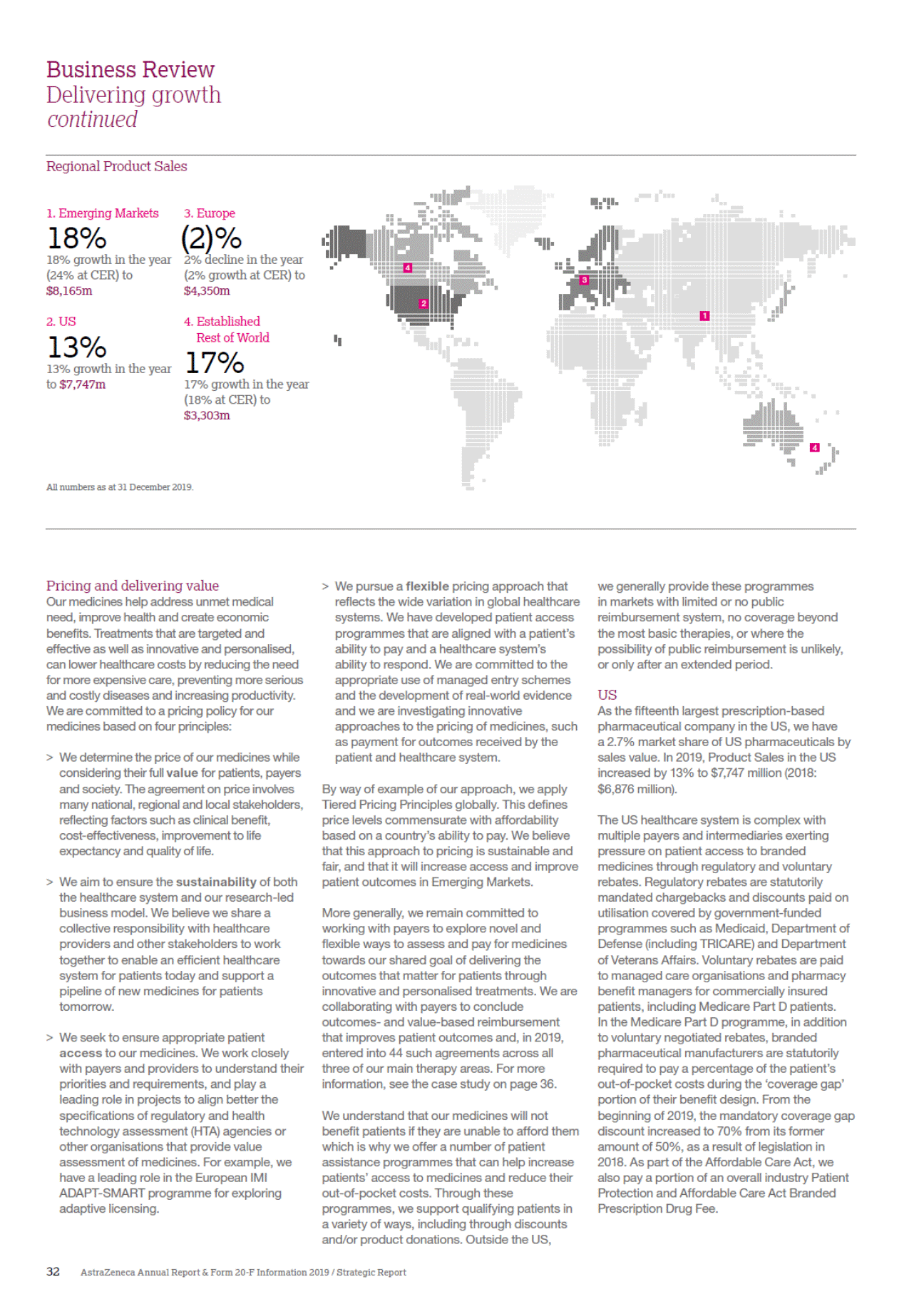 Business Review Delivering growth continued Regional Product Sales 1. Emerging Markets 3. Europe 18% 18% growth in the year (24% at CER) to $8,165m (2)% 2% decline in the year (2% growth at CER) to $4,350m 4 3 2 1 2. US 4. Established Rest of World 13% 13% growth in the year to $7,747m 17% 17% growth in the year (18% at CER) to $3,303m 4 All numbers as at 31 December 2019. Pricing and delivering value Our medicines help address unmet medical need, improve health and create economic benefits. Treatments that are targeted and effective as well as innovative and personalised, can lower healthcare costs by reducing the need for more expensive care, preventing more serious and costly diseases and increasing productivity. We are committed to a pricing policy for our medicines based on four principles: > We pursue a flexible pricing approach that reflects the wide variation in global healthcare systems. We have developed patient access programmes that are aligned with a patient’s ability to pay and a healthcare system’s ability to respond. We are committed to the appropriate use of managed entry schemes and the development of real-world evidence and we are investigating innovative approaches to the pricing of medicines, such as payment for outcomes received by the patient and healthcare system. we generally provide these programmes in markets with limited or no public reimbursement system, no coverage beyond the most basic therapies, or where the possibility of public reimbursement is unlikely, or only after an extended period. US As the fifteenth largest prescription-based pharmaceutical company in the US, we have a 2.7% market share of US pharmaceuticals by sales value. In 2019, Product Sales in the US increased by 13% to $7,747 million (2018: $6,876 million). > We determine the price of our medicines while considering their full value for patients, payers and society. The agreement on price involves many national, regional and local stakeholders, reflecting factors such as clinical benefit, cost-effectiveness, improvement to life expectancy and quality of life. By way of example of our approach, we apply Tiered Pricing Principles globally. This defines price levels commensurate with affordability based on a country’s ability to pay. We believe that this approach to pricing is sustainable and fair, and that it will increase access and improve patient outcomes in Emerging Markets. The US healthcare system is complex with multiple payers and intermediaries exerting pressure on patient access to branded medicines through regulatory and voluntary rebates. Regulatory rebates are statutorily mandated chargebacks and discounts paid on utilisation covered by government-funded programmes such as Medicaid, Department of Defense (including TRICARE) and Department of Veterans Affairs. Voluntary rebates are paid to managed care organisations and pharmacy benefit managers for commercially insured patients, including Medicare Part D patients. In the Medicare Part D programme, in addition to voluntary negotiated rebates, branded pharmaceutical manufacturers are statutorily required to pay a percentage of the patient’s out-of-pocket costs during the ‘coverage gap’ portion of their benefit design. From the beginning of 2019, the mandatory coverage gap discount increased to 70% from its former amount of 50%, as a result of legislation in 2018. As part of the Affordable Care Act, we also pay a portion of an overall industry Patient Protection and Affordable Care Act Branded Prescription Drug Fee. > We aim to ensure the sustainability of both the healthcare system and our research-led business model. We believe we share a collective responsibility with healthcare providers and other stakeholders to work together to enable an efficient healthcare system for patients today and support a pipeline of new medicines for patients tomorrow. More generally, we remain committed to working with payers to explore novel and flexible ways to assess and pay for medicines towards our shared goal of delivering the outcomes that matter for patients through innovative and personalised treatments. We are collaborating with payers to conclude outcomes-and value-based reimbursement that improves patient outcomes and, in 2019, entered into 44 such agreements across all three of our main therapy areas. For more information, see the case study on page 36. > We seek to ensure appropriate patient access to our medicines. We work closely with payers and providers to understand their priorities and requirements, and play a leading role in projects to align better the specifications of regulatory and health technology assessment (HTA) agencies or other organisations that provide value assessment of medicines. For example, we have a leading role in the European IMI ADAPT-SMART programme for exploring adaptive licensing. We understand that our medicines will not benefit patients if they are unable to afford them which is why we offer a number of patient assistance programmes that can help increase patients’ access to medicines and reduce their out-of-pocket costs. Through these programmes, we support qualifying patients in a variety of ways, including through discounts and/or product donations. Outside the US, 32 AstraZeneca Annual Report & Form 20-F Information 2019 / Strategic Report