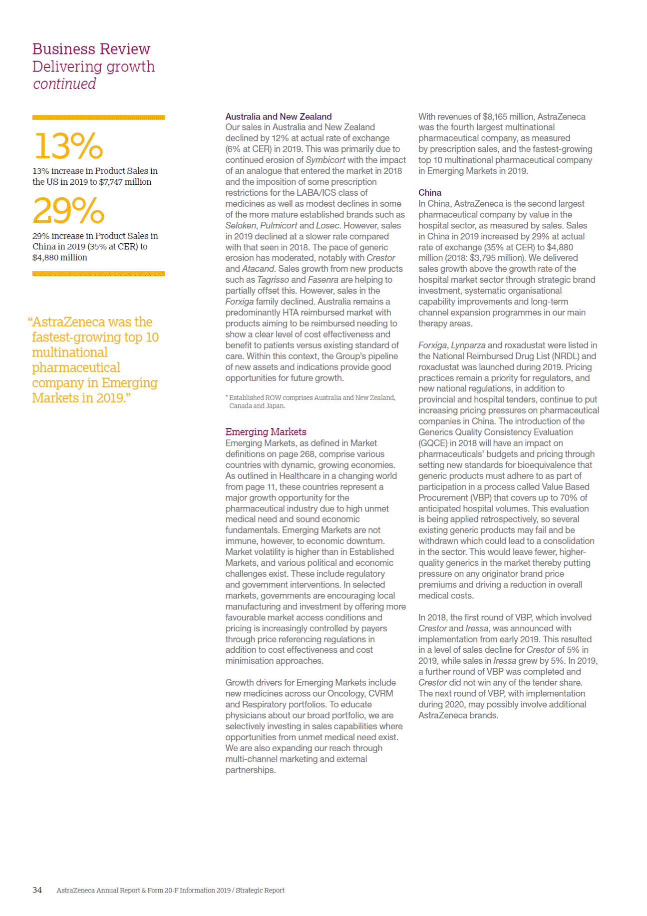 Business Review Delivering growth continued Australia and New Zealand Our sales in Australia and New Zealand declined by 12% at actual rate of exchange (6% at CER) in 2019. This was primarily due to continued erosion of Symbicort with the impact of an analogue that entered the market in 2018 and the imposition of some prescription restrictions for the LABA/ICS class of medicines as well as modest declines in some of the more mature established brands such as Seloken, Pulmicort and Losec. However, sales in 2019 declined at a slower rate compared with that seen in 2018. The pace of generic erosion has moderated, notably with Crestor and Atacand. Sales growth from new products such as Tagrisso and Fasenra are helping to partially offset this. However, sales in the Forxiga family declined. Australia remains a predominantly HTA reimbursed market with products aiming to be reimbursed needing to show a clear level of cost effectiveness and benefit to patients versus existing standard of care. Within this context, the Group’s pipeline of new assets and indications provide good opportunities for future growth. With revenues of $8,165 million, AstraZeneca was the fourth largest multinational pharmaceutical company, as measured by prescription sales, and the fastest-growing top 10 multinational pharmaceutical company in Emerging Markets in 2019. 13% 13% increase in Product Sales in the US in 2019 to $7,747 million 29% 29% increase in Product Sales in China in 2019 (35% at CER) to $4,880 million China In China, AstraZeneca is the second largest pharmaceutical company by value in the hospital sector, as measured by sales. Sales in China in 2019 increased by 29% at actual rate of exchange (35% at CER) to $4,880 million (2018: $3,795 million). We delivered sales growth above the growth rate of the hospital market sector through strategic brand investment, systematic organisational capability improvements and long-term channel expansion programmes in our main therapy areas. “AstraZeneca was the fastest-growing top 10 multinational pharmaceutical company in Emerging Markets in 2019.” Forxiga, Lynparza and roxadustat were listed in the National Reimbursed Drug List (NRDL) and roxadustat was launched during 2019. Pricing practices remain a priority for regulators, and new national regulations, in addition to provincial and hospital tenders, continue to put increasing pricing pressures on pharmaceutical companies in China. The introduction of the Generics Quality Consistency Evaluation (GQCE) in 2018 will have an impact on pharmaceuticals’ budgets and pricing through setting new standards for bioequivalence that generic products must adhere to as part of participation in a process called Value Based Procurement (VBP) that covers up to 70% of anticipated hospital volumes. This evaluation is being applied retrospectively, so several existing generic products may fail and be withdrawn which could lead to a consolidation in the sector. This would leave fewer, higher-quality generics in the market thereby putting pressure on any originator brand price premiums and driving a reduction in overall medical costs. * Established ROW comprises Australia and New Zealand, Canada and Japan. Emerging Markets Emerging Markets, as defined in Market definitions on page 268, comprise various countries with dynamic, growing economies. As outlined in Healthcare in a changing world from page 11, these countries represent a major growth opportunity for the pharmaceutical industry due to high unmet medical need and sound economic fundamentals. Emerging Markets are not immune, however, to economic downturn. Market volatility is higher than in Established Markets, and various political and economic challenges exist. These include regulatory and government interventions. In selected markets, governments are encouraging local manufacturing and investment by offering more favourable market access conditions and pricing is increasingly controlled by payers through price referencing regulations in addition to cost effectiveness and cost minimisation approaches. In 2018, the first round of VBP, which involved Crestor and Iressa, was announced with implementation from early 2019. This resulted in a level of sales decline for Crestor of 5% in 2019, while sales in Iressa grew by 5%. In 2019, a further round of VBP was completed and Crestor did not win any of the tender share. The next round of VBP, with implementation during 2020, may possibly involve additional AstraZeneca brands. Growth drivers for Emerging Markets include new medicines across our Oncology, CVRM and Respiratory portfolios. To educate physicians about our broad portfolio, we are selectively investing in sales capabilities where opportunities from unmet medical need exist. We are also expanding our reach through multi-channel marketing and external partnerships. 34 AstraZeneca Annual Report & Form 20-F Information 2019 / Strategic Report