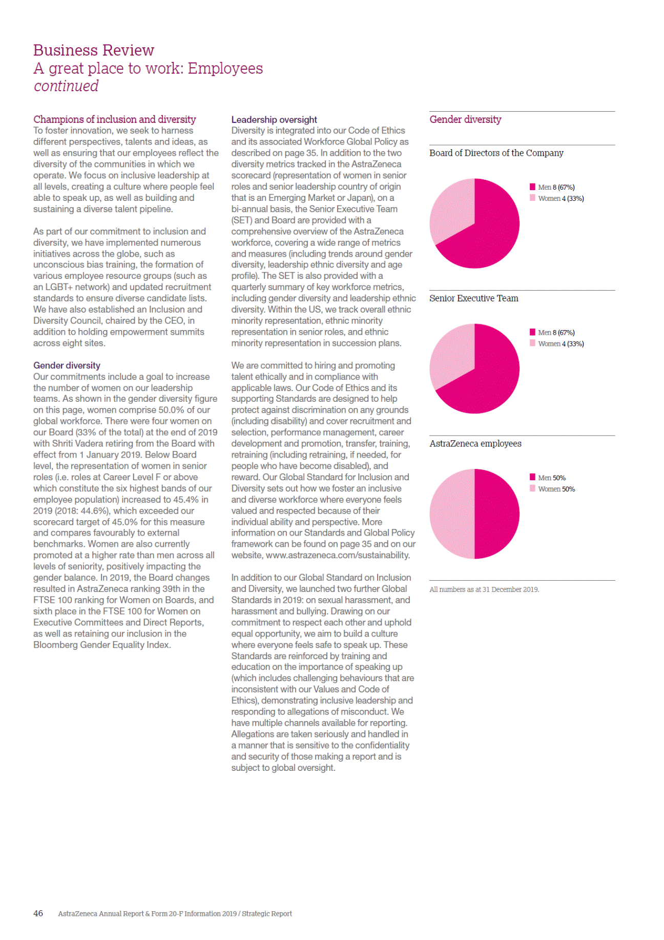 Business Review A great place to work: Employees continued Champions of inclusion and diversity To foster innovation, we seek to harness different perspectives, talents and ideas, as well as ensuring that our employees reflect the diversity of the communities in which we operate. We focus on inclusive leadership at all levels, creating a culture where people feel able to speak up, as well as building and sustaining a diverse talent pipeline. Leadership oversight Diversity is integrated into our Code of Ethics and its associated Workforce Global Policy as described on page 35. In addition to the two diversity metrics tracked in the AstraZeneca scorecard (representation of women in senior roles and senior leadership country of origin that is an Emerging Market or Japan), on a bi-annual basis, the Senior Executive Team (SET) and Board are provided with a comprehensive overview of the AstraZeneca workforce, covering a wide range of metrics and measures (including trends around gender diversity, leadership ethnic diversity and age profile). The SET is also provided with a quarterly summary of key workforce metrics, including gender diversity and leadership ethnic diversity. Within the US, we track overall ethnic minority representation, ethnic minority representation in senior roles, and ethnic minority representation in succession plans. Gender diversity Board of Directors of the Company Men 8 (67%) Women 4 (33%) As part of our commitment to inclusion and diversity, we have implemented numerous initiatives across the globe, such as unconscious bias training, the formation of various employee resource groups (such as an LGBT+ network) and updated recruitment standards to ensure diverse candidate lists. We have also established an Inclusion and Diversity Council, chaired by the CEO, in addition to holding empowerment summits across eight sites. Senior Executive Team Men 8 (67%) Women 4 (33%) Gender diversity Our commitments include a goal to increase the number of women on our leadership teams. As shown in the gender diversity figure on this page, women comprise 50.0% of our global workforce. There were four women on our Board (33% of the total) at the end of 2019 with Shriti Vadera retiring from the Board with effect from 1 January 2019. Below Board level, the representation of women in senior roles (i.e. roles at Career Level F or above which constitute the six highest bands of our employee population) increased to 45.4% in 2019 (2018: 44.6%), which exceeded our scorecard target of 45.0% for this measure and compares favourably to external benchmarks. Women are also currently promoted at a higher rate than men across all levels of seniority, positively impacting the gender balance. In 2019, the Board changes resulted in AstraZeneca ranking 39th in the FTSE 100 ranking for Women on Boards, and sixth place in the FTSE 100 for Women on Executive Committees and Direct Reports, as well as retaining our inclusion in the Bloomberg Gender Equality Index. We are committed to hiring and promoting talent ethically and in compliance with applicable laws. Our Code of Ethics and its supporting Standards are designed to help protect against discrimination on any grounds (including disability) and cover recruitment and selection, performance management, career development and promotion, transfer, training, retraining (including retraining, if needed, for people who have become disabled), and reward. Our Global Standard for Inclusion and Diversity sets out how we foster an inclusive and diverse workforce where everyone feels valued and respected because of their individual ability and perspective. More information on our Standards and Global Policy framework can be found on page 35 and on our website, www.astrazeneca.com/sustainability. AstraZeneca employees Men 50% Women 50% In addition to our Global Standard on Inclusion and Diversity, we launched two further Global Standards in 2019: on sexual harassment, and harassment and bullying. Drawing on our commitment to respect each other and uphold equal opportunity, we aim to build a culture where everyone feels safe to speak up. These Standards are reinforced by training and education on the importance of speaking up (which includes challenging behaviours that are inconsistent with our Values and Code of Ethics), demonstrating inclusive leadership and responding to allegations of misconduct. We have multiple channels available for reporting. Allegations are taken seriously and handled in a manner that is sensitive to the confidentiality and security of those making a report and is subject to global oversight. All numbers as at 31 December 2019. 46 AstraZeneca Annual Report & Form 20-F Information 2019 / Strategic Report