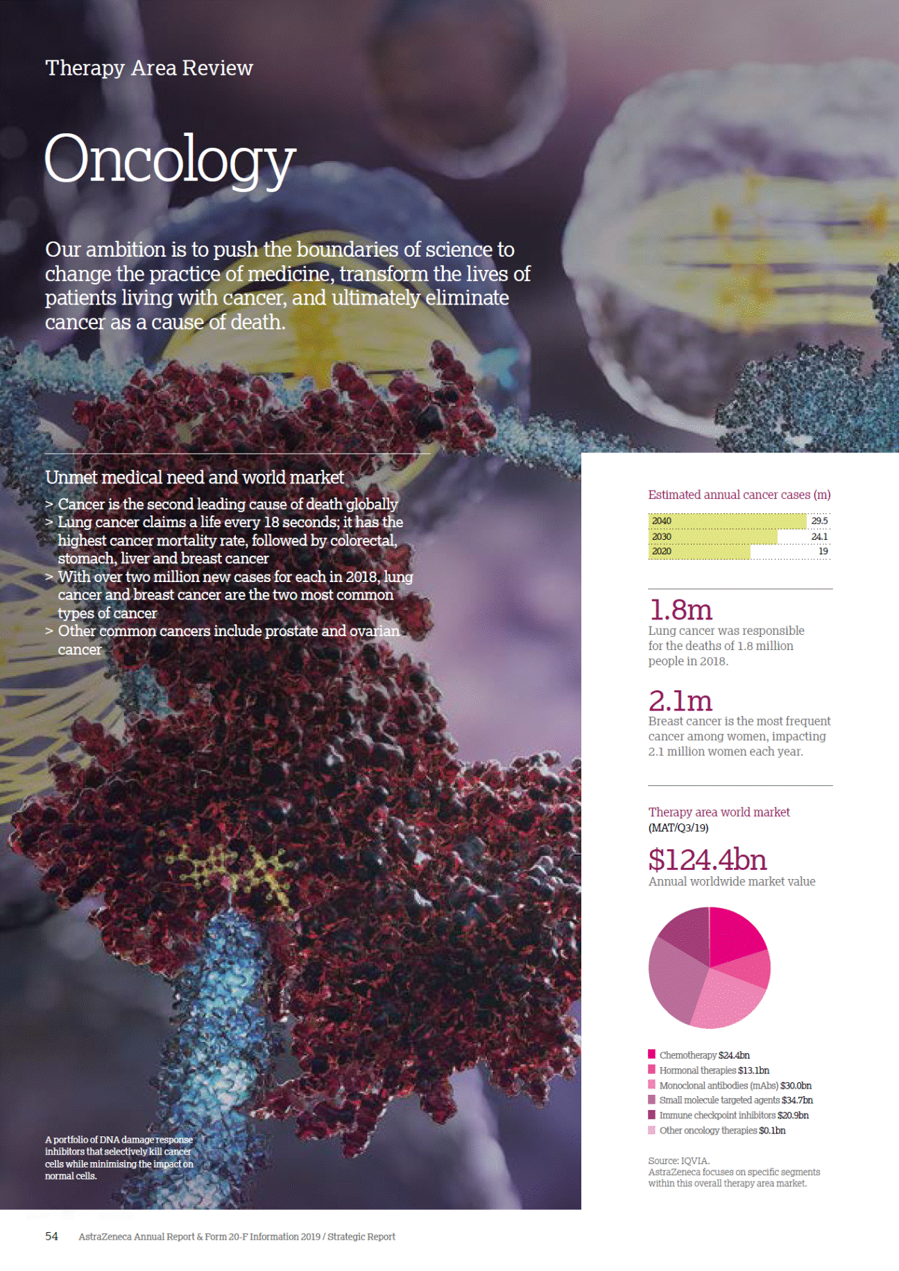 Phase III trial of any PARP inhibitor in this disease where there is a critical unmet medical need. Calquence and haematology Calquence is our irreversible oral Bruton’s tyrosine kinase (BTK) inhibitor. It was approved for the treatment of MCL in the US in 2017. unresectable and/or metastatic breast cancer. In October 2019, the FDA accepted the BLA application for Enhertu and granted Priority Review and, in December 2019, Enhertu received Accelerated Approval by the FDA for the treatment of adult patients with unresectable or metastatic HER2-positive breast cancer who have received two or more prior anti-HER2 based regimens in the metastatic setting. Detailed results of the DESTINY-Breast01 trial demonstrated an overall response rate of 60.9% and a median PFS of 16.4 months, based upon a median duration of follow-up of 11.1 months. Results from the POLO trial showed a statistically significant and clinically meaningful improvement in PFS, where Lynparza nearly doubled the time patients with gBRCAm metastatic pancreatic cancer lived without disease progression or death to a median of 7.4 months compared with 3.8 months on placebo. Based on these results, Lynparza has now been approved in the US for the maintenance treatment of adult patients with deleterious or suspected deleterious gBRCAm metastatic pancreatic cancer whose disease has not progressed on at least 16 weeks of a 1st-line platinum-based chemotherapy regimen. In November 2019, the FDA approved Calquence for adult patients with CLL or small lymphocytic lymphoma (SLL). The US approval was granted under the FDA’s Real-Time Oncology Review and the newly established Project Orbis programme which provides a framework for concurrent submission and review of oncology medicines among international partners. The FDA, the Australian Therapeutic Goods Administration, and Health Canada collaborated on this review and approval for CLL in Australia and Canada followed shortly after. Approval was based on positive results from the interim analyses of two Phase III clinical trials – ASCEND and ELEVATE-TN. The ASCEND trial compared Calquence with rituximab combined with delalisib or bendamustine in patients with relapsed or refractory CLL and the ELEVATE-TN trial evaluated the safety and efficacy of Calquence alone or in combination with obinutuzumab compared with chlorambucil in combination with obinutuzumab in patients with previously untreated CLL. Together, the trials showed that Calquence in combination with obinutuzumab or as a monotherapy significantly reduced the relative risk of disease progression or death versus the comparator arms in both 1st-line and relapsed or refractory CLL. Across both trials, the safety and tolerability of Calquence were consistent with its established profile. The use of antibody-drug conjugates (ADCs) is a clinically validated, highly potent approach that selectively targets cancer cells by combining innovative antibody engineering capabilities with cytotoxic drug molecules, to attack and kill the tumour while minimising toxicity to the patient. The Phase III PROfound trial of Lynparza in men with metastatic castration-resistant prostate cancer (mCRPC) showed a statistically significant and clinically meaningful improvement in radiographic PFS with Lynparza versus enzalutamide or abiraterone in men with mCRPC whose tumours harbour mutations in one of 15 potential HRR genes, including BRCA1, BRCA2 and ATM. The potential benefits of Lynparza in mCRPC will continue to be tested in the Phase III PROpel trial that will assess the combination of Lynparza with abiraterone in 1st-line mCRPC. We are also progressing with the development of our early stage ADC pipeline – MEDI7247 in haematological malignancies and solid tumours and MEDI2228 in multiple myeloma. Established portfolio and biosimilars In 2019, our established oncology brands – Faslodex, Zoladex and Iressa – performed well, with growth in Zoladex and moderate sales decreases of Faslodex and Iressa. Faslodex showed a slower decline than expected, largely led by growth in combination use with CDK4/6 inhibitors and slower generic competition in the EU. Decline in the second half of the year was primarily driven by generic competition in the US. Progress across the DDR pipeline Our DDR pipeline continues to expand and progress: > AZD7648, a potent and selective DNA-PK inhibitor which could be an innovative new way to target alternative DDR dependencies. > Adavosertib (AZD1775), our WEE1 inhibitor continues in Phase II development for ovarian and other solid tumours in combination with Lynparza, in combination with chemotherapy, and as a monotherapy. > Ceralasertib (AZD6738), an ataxia telangiectasia and Rad3-related (ATR) serine/threonine protein kinase inhibitor is being evaluated in Phase I/II trials in solid tumours and haematological malignancies as monotherapy and in combination with other targeted therapies, including Lynparza in triple negative breast cancer. It is also being investigated in combination with Calquence in CLL, and in combination with radiation therapy and chemotherapy. > AZD2811 an aurora kinase B inhibitor in development as monotherapy in Phase II in SCLC and acute myeloid leukaemia. > AZD1390, a blood-brain barrier penetrant inhibitor of ATM is in Phase I for brain tumours. There was also progress made in our haematology early-phase clinical programme, with AZD5991 (an MCL1 inhibitor), AZD4753 (a CDK9 inhibitor) and AZD0466 (a dual inhibitor of Bcl2 and Bcl-xL), all being investigated as part of our cell death programme, as well as ADCs, MEDI7247 and MEDI2228. In addition, the BTK and STAT3 combination is being explored in Phase I trials with Calquence and danvatirsen (AZD9150), a STAT3 ASO. Iressa sales continued to decline due to generic entries in select markets, the uptake of Tagrisso in 1st-line EGFRm advanced NSCLC, and the pricing impact on Iressa from centralised procurement in China. Zoladex double-digit growth wa