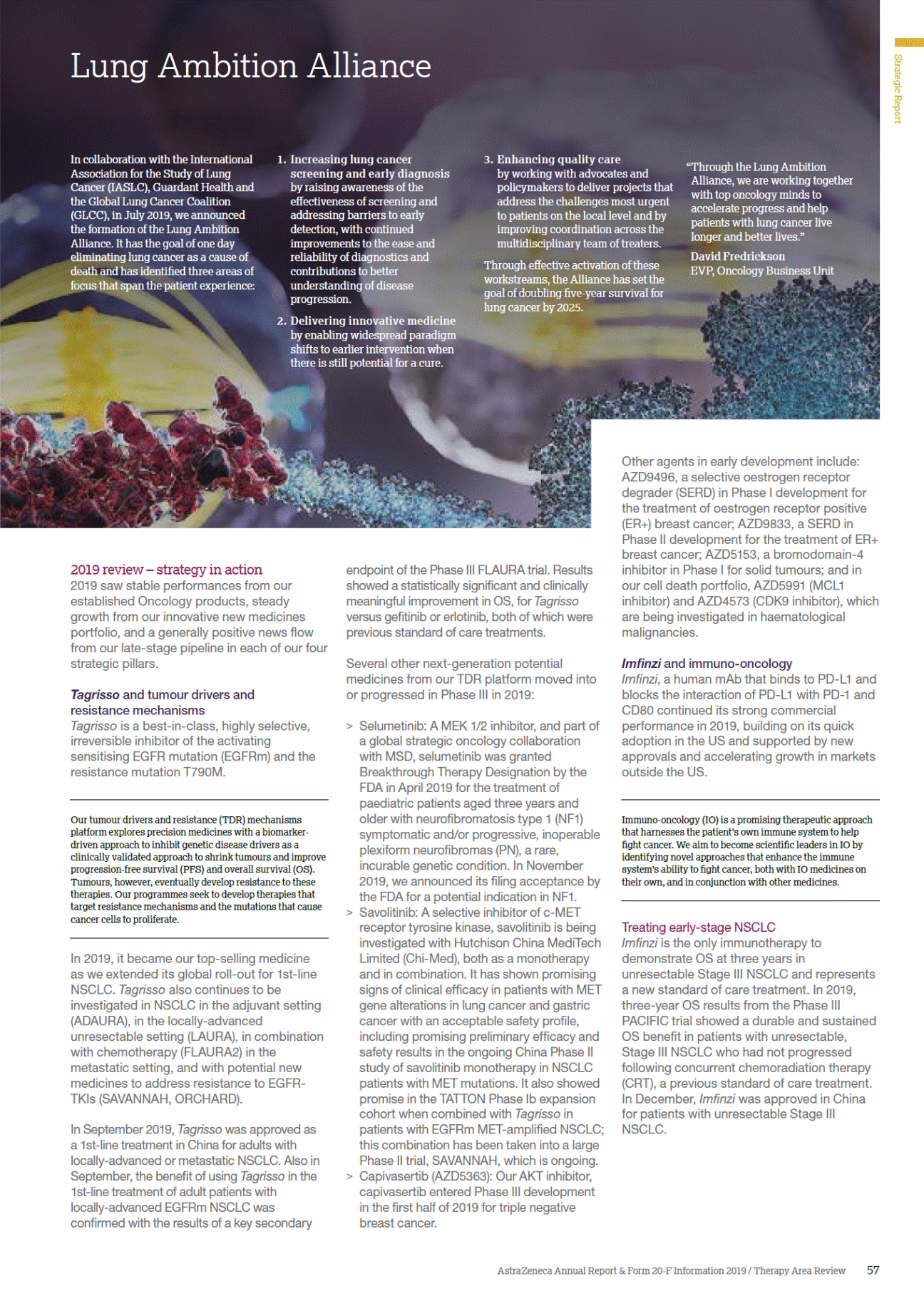 Lung Ambition Alliance In collaboration with the International Association for the Study of Lung Cancer (IASLC), Guardant Health and the Global Lung Cancer Coalition (GLCC), in July 2019, we announced the formation of the Lung Ambition Alliance. It has the goal of one day eliminating lung cancer as a cause of death and has identified three areas of focus that span the patient experience: 1. Increasing lung cancer screening and early diagnosis by raising awareness of the effectiveness of screening and addressing barriers to early detection, with continued improvements to the ease and reliability of diagnostics and contributions to better understanding of disease progression. 2. Delivering innovative medicine by enabling widespread paradigm shifts to earlier intervention when there is still potential for a cure. 3. Enhancing quality care by working with advocates and policymakers to deliver projects that address the challenges most urgent to patients on the local level and by improving coordination across the multidisciplinary team of treaters. Through effective activation of these workstreams, the Alliance has set the goal of doubling five-year survival for lung cancer by 2025. “Through the Lung Ambition Alliance, we are working together with top oncology minds to accelerate progress and help patients with lung cancer live longer and better lives.” David Fredrickson EVP, Oncology Business Unit Other agents in early development include: AZD9496, a selective oestrogen receptor degrader (SERD) in Phase I development for the treatment of oestrogen receptor positive (ER+) breast cancer; AZD9833, a SERD in Phase II development for the treatment of ER+ breast cancer; AZD5153, a bromodomain-4 inhibitor in Phase I for solid tumours; and in our cell death portfolio, AZD5991 (MCL1 inhibitor) and AZD4573 (CDK9 inhibitor), which are being investigated in haematological malignancies. 2019 review – strategy in action 2019 saw stable performances from our established Oncology products, steady growth from our innovative new medicines portfolio, and a generally positive news flow from our late-stage pipeline in each of our four strategic pillars. endpoint of the Phase III FLAURA trial. Results showed a statistically significant and clinically meaningful improvement in OS, for Tagrisso versus gefitinib or erlotinib, both of which were previous standard of care treatments. Several other next-generation potential medicines from our TDR platform moved into or progressed in Phase III in 2019: Imfinzi and immuno-oncology Imfinzi, a human mAb that binds to PD-L1 and blocks the interaction of PD-L1 with PD-1 and CD80 continued its strong commercial performance in 2019, building on its quick adoption in the US and supported by new approvals and accelerating growth in markets outside the US. Tagrisso and tumour drivers and resistance mechanisms Tagrisso is a best-in-class, highly selective, irreversible inhibitor of the activating sensitising EGFR mutation (EGFRm) and the resistance mutation T790M. > Selumetinib: A MEK 1/2 inhibitor, and part of a global strategic oncology collaboration with MSD, selumetinib was granted Breakthrough Therapy Designation by the FDA in April 2019 for the treatment of paediatric patients aged three years and older with neurofibromatosis type 1 (NF1) symptomatic and/or progressive, inoperable plexiform neurofibromas (PN), a rare, incurable genetic condition. In November 2019, we announced its filing acceptance by the FDA for a potential indication in NF1. > Savolitinib: A selective inhibitor of c-MET receptor tyrosine kinase, savolitinib is being investigated with Hutchison China MediTech Limited (Chi-Med), both as a monotherapy and in combination. It has shown promising signs of clinical efficacy in patients with MET gene alterations in lung cancer and gastric cancer with an acceptable safety profile, including promising preliminary efficacy and safety results in the ongoing China Phase II study of savolitinib monotherapy in NSCLC patients with MET mutations. It also showed promise in the TATTON Phase Ib expansion cohort when combined with Tagrisso in patients with EGFRm MET-amplified NSCLC; this combination has been taken into a large Phase II trial, SAVANNAH, which is ongoing. > Capivasertib (AZD5363): Our AKT inhibitor, capivasertib entered Phase III development in the first half of 2019 for triple negative breast cancer. Our tumour drivers and resistance (TDR) mechanisms platform explores precision medicines with a biomarker-driven approach to inhibit genetic disease drivers as a clinically validated approach to shrink tumours and improve progression-free survival (PFS) and overall survival (OS). Tumours, however, eventually develop resistance to these therapies. Our programmes seek to develop therapies that target resistance mechanisms and the mutations that cause cancer cells to proliferate. Immuno-oncology (IO) is a promising therapeutic approach that harnesses the patient’s own immune system to help fight cancer. We aim to become scientific leaders in IO by identifying novel approaches that enhance the immune system’s ability to fight cancer, both with IO medicines on their own, and in conjunction with other medicines. Treating early-stage NSCLC Imfinzi is the only immunotherapy to demonstrate OS at three years in unresectable Stage III NSCLC and represents a new standard of care treatment. In 2019, three-year OS results from the Phase III PACIFIC trial showed a durable and sustained OS benefit in patients with unresectable, Stage III NSCLC who had not progressed following concurrent chemoradiation therapy (CRT), a previous standard of care treatment. In December, Imfinzi was approved in China for patients with unresectable Stage III NSCLC. In 2019, it became our top-selling medicine as we extended its global roll-out for 1st-line NSCLC. Tagrisso also continues to be investigated in NSCLC in the adjuvant setting (ADAURA), in the locally-advanced unresectable setting (L