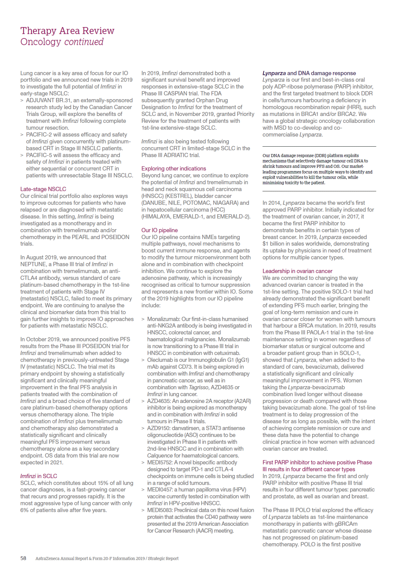 Therapy Area Review Oncology continued Lung cancer is a key area of focus for our IO portfolio and we announced new trials in 2019 to investigate the full potential of Imfinzi in early-stage NSCLC: > ADJUVANT BR.31, an externally-sponsored research study led by the Canadian Cancer Trials Group, will explore the benefits of treatment with Imfinzi following complete tumour resection. > PACIFIC-2 will assess efficacy and safety of Imfinzi given concurrently with platinum-based CRT in Stage III NSCLC patients. > PACIFIC-5 will assess the efficacy and safety of Imfinzi in patients treated with either sequential or concurrent CRT in patients with unresectable Stage III NSCLC. In 2019, Imfinzi demonstrated both a significant survival benefit and improved responses in extensive-stage SCLC in the Phase III CASPIAN trial. The FDA subsequently granted Orphan Drug Designation to Imfinzi for the treatment of SCLC and, in November 2019, granted Priority Review for the treatment of patients with 1st-line extensive-stage SCLC. Lynparza and DNA damage response Lynparza is our first and best-in-class oral poly ADP-ribose polymerase (PARP) inhibitor, and the first targeted treatment to block DDR in cells/tumours harbouring a deficiency in homologous recombination repair (HRR), such as mutations in BRCA1 and/or BRCA2. We have a global strategic oncology collaboration with MSD to co-develop and co-commercialise Lynparza. Imfinzi is also being tested following concurrent CRT in limited-stage SCLC in the Phase III ADRIATIC trial. Our DNA damage response (DDR) platform exploits mechanisms that selectively damage tumour cell DNA to shrink tumours and improve PFS and OS. Our market-leading programmes focus on multiple ways to identify and exploit vulnerabilities to kill the tumour cells, while minimising toxicity to the patient. Exploring other indications Beyond lung cancer, we continue to explore the potential of Imfinzi and tremelimumab in head and neck squamous cell carcinoma (HNSCC) (KESTREL), bladder cancer (DANUBE, NILE, POTOMAC, NIAGARA) and in hepatocellular carcinoma (HCC) (HIMALAYA, EMERALD-1, and EMERALD-2). Late-stage NSCLC Our clinical trial portfolio also explores ways to improve outcomes for patients who have relapsed or are diagnosed with metastatic disease. In this setting, Imfinzi is being investigated as a monotherapy and in combination with tremelimumab and/or chemotherapy in the PEARL and POSEIDON trials. In 2014, Lynparza became the world’s first approved PARP inhibitor. Initially indicated for the treatment of ovarian cancer, in 2017, it became the first PARP inhibitor to demonstrate benefits in certain types of breast cancer. In 2019, Lynparza exceeded $1 billion in sales worldwide, demonstrating its uptake by physicians in need of treatment options for multiple cancer types. Our IO pipeline Our IO pipeline contains NMEs targeting multiple pathways, novel mechanisms to boost current immune response, and agents to modify the tumour microenvironment both alone and in combination with checkpoint inhibition. We continue to explore the adenosine pathway, which is increasingly recognised as critical to tumour suppression and represents a new frontier within IO. Some of the 2019 highlights from our IO pipeline include: In August 2019, we announced that NEPTUNE, a Phase III trial of Imfinzi in combination with tremelimumab, an anti-CTLA4 antibody, versus standard of care platinum-based chemotherapy in the 1st-line treatment of patients with Stage IV (metastatic) NSCLC, failed to meet its primary endpoint. We are continuing to analyse the clinical and biomarker data from this trial to gain further insights to improve IO approaches for patients with metastatic NSCLC. Leadership in ovarian cancer We are committed to changing the way advanced ovarian cancer is treated in the 1st-line setting. The positive SOLO-1 trial had already demonstrated the significant benefit of extending PFS much earlier, bringing the goal of long-term remission and cure in ovarian cancer closer for women with tumours that harbour a BRCA mutation. In 2019, results from the Phase III PAOLA-1 trial in the 1st-line maintenance setting in women regardless of biomarker status or surgical outcome and a broader patient group than in SOLO-1, showed that Lynparza, when added to the standard of care, bevacizumab, delivered a statistically significant and clinically meaningful improvement in PFS. Women taking the Lynparza-bevacizumab combination lived longer without disease progression or death compared with those taking bevacizumab alone. The goal of 1st-line treatment is to delay progression of the disease for as long as possible, with the intent of achieving complete remission or cure and these data have the potential to change clinical practice in how women with advanced ovarian cancer are treated. > Monalizumab: Our first-in-class humanised anti-NKG2A antibody is being investigated in HNSCC, colorectal cancer, and haematological malignancies. Monalizumab is now transitioning to a Phase III trial in HNSCC in combination with cetuximab. > Oleclumab is our Immunoglobulin G1 (IgG1) mAb against CD73. It is being explored in combination with Imfinzi and chemotherapy in pancreatic cancer, as well as in combination with Tagrisso, AZD4635 or Imfinzi in lung cancer. > AZD4635: An adenosine 2A receptor (A2AR) inhibitor is being explored as monotherapy and in combination with Imfinzi in solid tumours in Phase II trials. > AZD9150: danvatirsen, a STAT3 antisense oligonucleotide (ASO) continues to be investigated in Phase II in patients with 2nd-line HNSCC and in combination with Calquence for haematological cancers. > MEDI5752: A novel bispecific antibody designed to target PD-1 and CTLA-4 checkpoints on immune cells is being studied in a range of solid tumours. > MEDI0457: a human papilloma virus (HPV) vaccine currently tested in combination with Imfinzi in HPV-positive HNSCC. > MEDI5083: Preclinical data on this novel fusion protein that ac