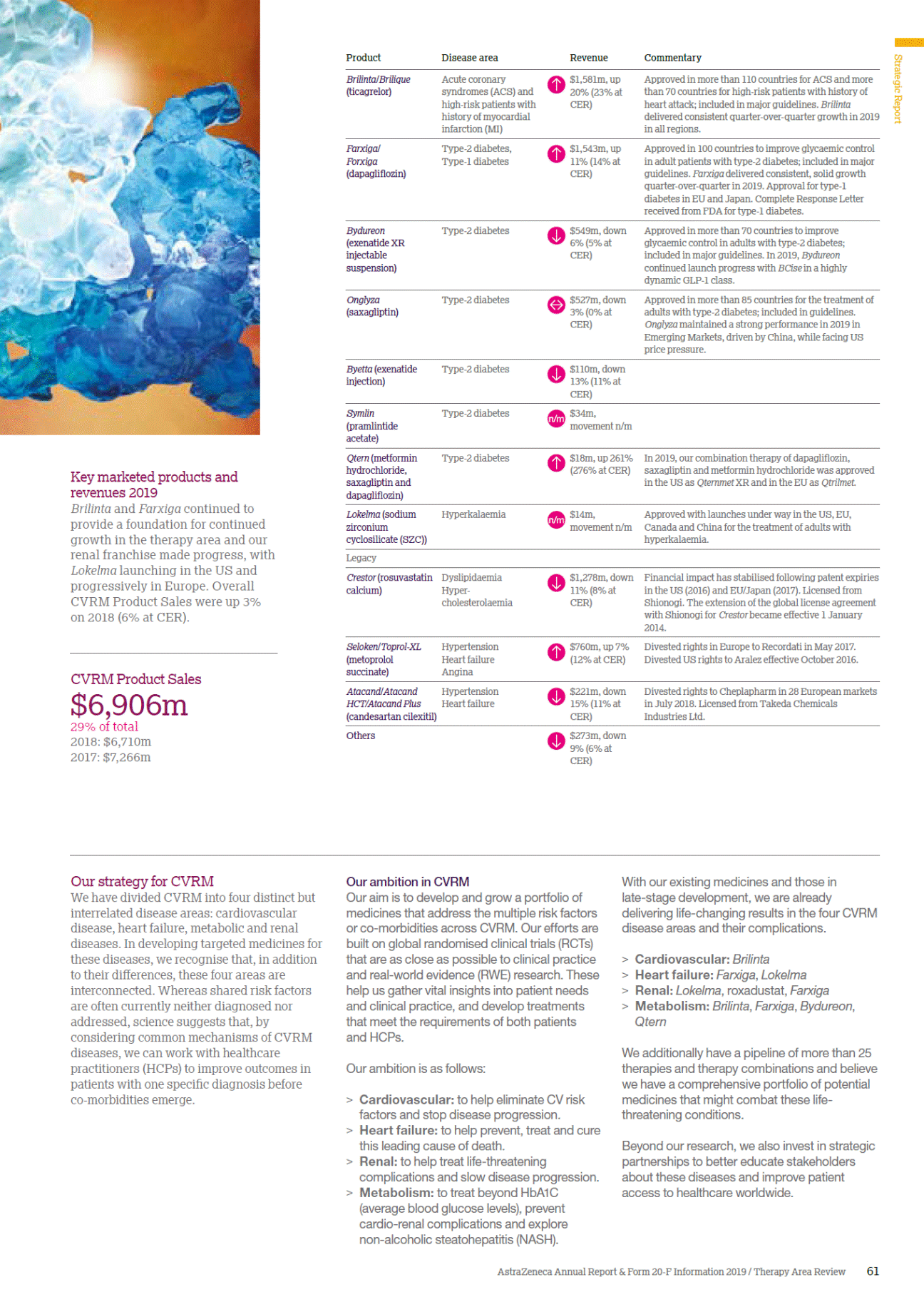 Product Disease area Revenue Commentary Brilinta/Brilique (ticagrelor) Acute coronary syndromes (ACS) and high-risk patients with history of myocardial infarction (MI) $1,581m, up 20% (23% at CER) Approved in more than 110 countries for ACS and more than 70 countries for high-risk patients with history of heart attack; included in major guidelines. Brilinta delivered consistent quarter-over-quarter growth in 2019 in all regions. Farxiga/ Forxiga (dapagliflozin) Type-2 diabetes, Type-1 diabetes $1,543m, up 11% (14% at CER) Approved in 100 countries to improve glycaemic control in adult patients with type-2 diabetes; included in major guidelines. Farxiga delivered consistent, solid growth quarter-over-quarter in 2019. Approval for type-1 diabetes in EU and Japan. Complete Response Letter received from FDA for type-1 diabetes. Bydureon (exenatide XR injectable suspension) Type-2 diabetes $549m, down 6% (5% at CER) Approved in more than 70 countries to improve glycaemic control in adults with type-2 diabetes; included in major guidelines. In 2019, Bydureon continued launch progress with BCise in a highly dynamic GLP-1 class. Onglyza (saxagliptin) Type-2 diabetes $527m, down 3% (0% at CER) Approved in more than 85 countries for the treatment of adults with type-2 diabetes; included in guidelines. Onglyza maintained a strong performance in 2019 in Emerging Markets, driven by China, while facing US price pressure. Byetta (exenatide injection) Type-2 diabetes $110m, down 13% (11% at CER) Symlin (pramlintide acetate) Type-2 diabetes $34m, movement n/m Qtern (metformin hydrochloride, saxagliptin and dapagliflozin) Type-2 diabetes $18m, up 261% (276% at CER) In 2019, our combination therapy of dapagliflozin, saxagliptin and metformin hydrochloride was approved in the US as Qternmet XR and in the EU as Qtrilmet. Key marketed products and revenues 2019 Brilinta and Farxiga continued to provide a foundation for continued growth in the therapy area and our renal franchise made progress, with Lokelma launching in the US and progressively in Europe. Overall CVRM Product Sales were up 3% on 2018 (6% at CER). Lokelma (sodium zirconium cyclosilicate (SZC)) Hyperkalaemia $14m, movement n/m Approved with launches under way in the US, EU, Canada and China for the treatment of adults with hyperkalaemia. Legacy Crestor (rosuvastatin calcium) Dyslipidaemia Hyper-cholesterolaemia $1,278m, down 11% (8% at CER) Financial impact has stabilised following patent expiries in the US (2016) and EU/Japan (2017). Licensed from Shionogi. The extension of the global license agreement with Shionogi for Crestor became effective 1 January 2014. Seloken/Toprol-XL (metoprolol succinate) Hypertension Heart failure Angina $760m, up 7% (12% at CER) Divested rights in Europe to Recordati in May 2017. Divested US rights to Aralez effective October 2016. CVRM Product Sales $6,906m 29% of total 2018: $6,710m 2017: $7,266m Atacand/Atacand HCT/Atacand Plus (candesartan cilexitil) Hypertension Heart failure $221m, down 15% (11% at CER) Divested rights to Cheplapharm in 28 European markets in July 2018. Licensed from Takeda Chemicals Industries Ltd. Others $273m, down 9% (6% at CER) Our strategy for CVRM We have divided CVRM into four distinct but interrelated disease areas: cardiovascular disease, heart failure, metabolic and renal diseases. In developing targeted medicines for these diseases, we recognise that, in addition to their differences, these four areas are interconnected. Whereas shared risk factors are often currently neither diagnosed nor addressed, science suggests that, by considering common mechanisms of CVRM diseases, we can work with healthcare practitioners (HCPs) to improve outcomes in patients with one specific diagnosis before co-morbidities emerge. Our ambition in CVRM Our aim is to develop and grow a portfolio of medicines that address the multiple risk factors or co-morbidities across CVRM. Our efforts are built on global randomised clinical trials (RCTs) that are as close as possible to clinical practice and real-world evidence (RWE) research. These help us gather vital insights into patient needs and clinical practice, and develop treatments that meet the requirements of both patients and HCPs. With our existing medicines and those in late-stage development, we are already delivering life-changing results in the four CVRM disease areas and their complications. > Cardiovascular: Brilinta > Heart failure: Farxiga, Lokelma > Renal: Lokelma, roxadustat, Farxiga > Metabolism: Brilinta, Farxiga, Bydureon, Qtern We additionally have a pipeline of more than 25 therapies and therapy combinations and believe we have a comprehensive portfolio of potential medicines that might combat these life-threatening conditions. Our ambition is as follows: > Cardiovascular: to help eliminate CV risk factors and stop disease progression. > Heart failure: to help prevent, treat and cure this leading cause of death. > Renal: to help treat life-threatening complications and slow disease progression. > Metabolism: to treat beyond HbA1C (average blood glucose levels), prevent cardio-renal complications and explore non-alcoholic steatohepatitis (NASH). Beyond our research, we also invest in strategic partnerships to better educate stakeholders about these diseases and improve patient access to healthcare worldwide. 61 AstraZeneca Annual Report & Form 20-F Information 2019 / Therapy Area Review Strategic Report