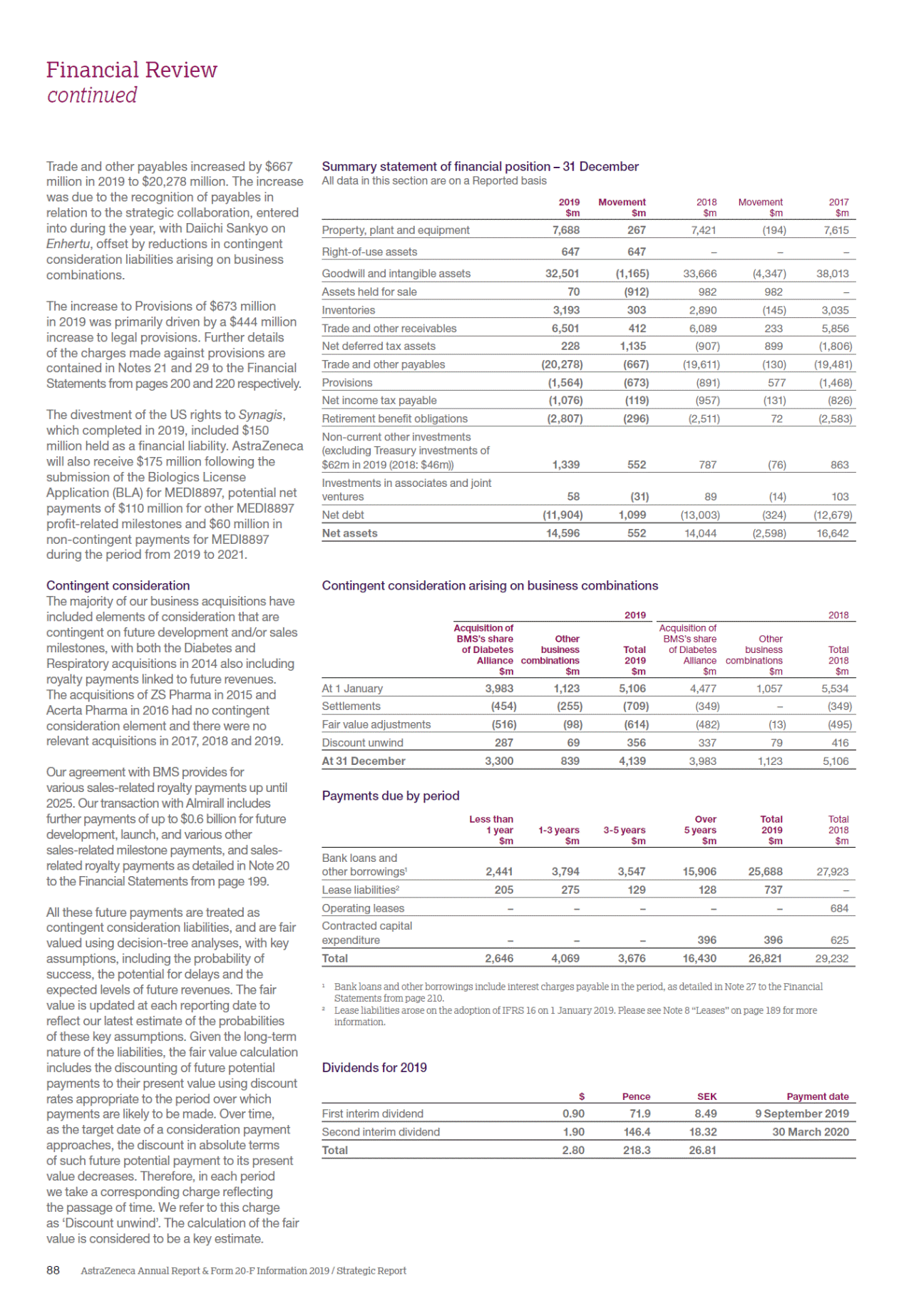 Financial Review continued Trade and other payables increased by $667 million in 2019 to $20,278 million. The increase was due to the recognition of payables in relation to the strategic collaboration, entered into during the year, with Daiichi Sankyo on Enhertu, offset by reductions in contingent consideration liabilities arising on business combinations. Summary statement of financial position – 31 December All data in this section are on a Reported basis 2019 $m Movement $m 2018 $m Movement $m 2017 $m Property, plant and equipment 7,688 267 7,421 (194) 7,615 Right-of-use assets 647 647 – – – Goodwill and intangible assets 32,501 (1,165) 33,666 (4,347) 38,013 Assets held for sale 70 (912) 982 982 – The increase to Provisions of $673 million in 2019 was primarily driven by a $444 million increase to legal provisions. Further details of the charges made against provisions are contained in Notes 21 and 29 to the Financial Statements from pages 200 and 220 respectively. Inventories 3,193 303 2,890 (145) 3,035 Trade and other receivables 6,501 412 6,089 233 5,856 Net deferred tax assets 228 1,135 (907) 899 (1,806) Trade and other payables (20,278) (667) (19,611) (130) (19,481) Provisions (1,564) (673) (891) 577 (1,468) Net income tax payable (1,076) (119) (957) (131) (826) The divestment of the US rights to Synagis, which completed in 2019, included $150 million held as a financial liability. AstraZeneca will also receive $175 million following the submission of the Biologics License Application (BLA) for MEDI8897, potential net payments of $110 million for other MEDI8897 profit-related milestones and $60 million in non-contingent payments for MEDI8897 during the period from 2019 to 2021. Retirement benefit obligations (2,807) (296) (2,511) 72 (2,583) Non-current other investments (excluding Treasury investments of $62m in 2019 (2018: $46m)) 1,339 552 787 (76) 863 Investments in associates and joint ventures 58 (31) 89 (14) 103 Net debt (11,904) 1,099 (13,003) (324) (12,679) Net assets 14,596 552 14,044 (2,598) 16,642 Contingent consideration The majority of our business acquisitions have included elements of consideration that are contingent on future development and/or sales milestones, with both the Diabetes and Respiratory acquisitions in 2014 also including royalty payments linked to future revenues. The acquisitions of ZS Pharma in 2015 and Acerta Pharma in 2016 had no contingent consideration element and there were no relevant acquisitions in 2017, 2018 and 2019. Contingent consideration arising on business combinations 2019 2018 Acquisition of BMS’s share of Diabetes Acquisition of BMS’s share of Diabetes Alliance $m Other business Other business combinations $m Total 2019 $m Total 2018 $m Alliance combinations $m $m At 1 January 3,983 1,123 5,106 4,477 1,057 5,534 Settlements (454) (255) (709) (349) – (349) Fair value adjustments (516) (98) (614) (482) (13) (495) Discount unwind 287 69 356 337 79 416 At 31 December 3,300 839 4,139 3,983 1,123 5,106 Our agreement with BMS provides for various sales-related royalty payments up until 2025. Our transaction with Almirall includes further payments of up to $0.6 billion for future development, launch, and various other sales-related milestone payments, and sales-related royalty payments as detailed in Note 20 to the Financial Statements from page 199. Payments due by period Less than 1 year $m Over 5 years $m Total 2019 $m Total 2018 $m 1-3 years $m 3-5 years $m Bank loans and other borrowings1 2,441 3,794 3,547 15,906 25,688 27,923 Lease liabilities2 205 275 129 128 737 – Operating leases – – – – – 684 All these future payments are treated as contingent consideration liabilities, and are fair valued using decision-tree analyses, with key assumptions, including the probability of success, the potential for delays and the expected levels of future revenues. The fair value is updated at each reporting date to reflect our latest estimate of the probabilities of these key assumptions. Given the long-term nature of the liabilities, the fair value calculation includes the discounting of future potential payments to their present value using discount rates appropriate to the period over which payments are likely to be made. Over time, as the target date of a consideration payment approaches, the discount in absolute terms of such future potential payment to its present value decreases. Therefore, in each period we take a corresponding charge reflecting the passage of time. We refer to this charge as ‘Discount unwind’. The calculation of the fair value is considered to be a key estimate. Contracted capital expenditure – – – 396 396 625 Total 2,646 4,069 3,676 16,430 26,821 29,232 1 B ank loans and other borrowings include interest charges payable in the period, as detailed in Note 27 to the Financial Statements from page 210. 2 L ease liabilities arose on the adoption of IFRS 16 on 1 January 2019. Please see Note 8 “Leases” on page 189 for more information. Dividends for 2019 $ Pence SEK Payment date First interim dividend 0.90 71.9 8.49 9 September 2019 Second interim dividend 1.90 146.4 18.32 30 March 2020 Total 2.80 218.3 26.81 88 AstraZeneca Annual Report & Form 20-F Information 2019 / Strategic Report