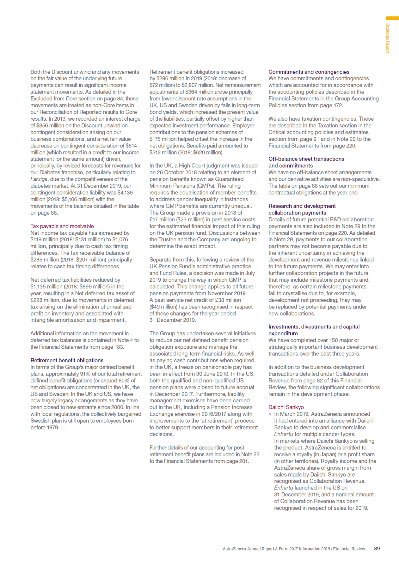 Both the Discount unwind and any movements on the fair value of the underlying future payments can result in significant income statement movements. As detailed in the Excluded from Core section on page 84, these movements are treated as non-Core items in our Reconciliation of Reported results to Core results. In 2019, we recorded an interest charge of $356 million on the Discount unwind on contingent consideration arising on our business combinations, and a net fair value decrease on contingent consideration of $614 million (which resulted in a credit to our income statement for the same amount) driven, principally, by revised forecasts for revenues for our Diabetes franchise, particularly relating to Farxiga, due to the competitiveness of the diabetes market. At 31 December 2019, our contingent consideration liability was $4,139 million (2018: $5,106 million) with the movements of the balance detailed in the table on page 88. Retirement benefit obligations increased by $296 million in 2019 (2018: decrease of $72 million) to $2,807 million. Net remeasurement adjustments of $364 million arose principally from lower discount rate assumptions in the UK, US and Sweden driven by falls in long-term bond yields, which increased the present value of the liabilities, partially offset by higher than expected investment performance. Employer contributions to the pension schemes of $175 million helped offset the increase in the net obligations. Benefits paid amounted to $512 million (2018: $620 million). Commitments and contingencies We have commitments and contingencies which are accounted for in accordance with the accounting policies described in the Financial Statements in the Group Accounting Policies section from page 172. We also have taxation contingencies. These are described in the Taxation section in the Critical accounting policies and estimates section from page 91 and in Note 29 to the Financial Statements from page 220. Off-balance sheet transactions and commitments We have no off-balance sheet arrangements and our derivative activities are non-speculative. The table on page 88 sets out our minimum contractual obligations at the year end. In the UK, a High Court judgment was issued on 26 October 2018 relating to an element of pension benefits known as Guaranteed Minimum Pensions (GMPs). The ruling requires the equalisation of member benefits to address gender inequality in instances where GMP benefits are currently unequal. The Group made a provision in 2018 of £17 million ($23 million) in past service costs for the estimated financial impact of this ruling on the UK pension fund. Discussions between the Trustee and the Company are ongoing to determine the exact impact. Research and development collaboration payments Details of future potential R&D collaboration payments are also included in Note 29 to the Financial Statements on page 220. As detailed in Note 29, payments to our collaboration partners may not become payable due to the inherent uncertainty in achieving the development and revenue milestones linked to the future payments. We may enter into further collaboration projects in the future that may include milestone payments and, therefore, as certain milestone payments fail to crystallise due to, for example, development not proceeding, they may be replaced by potential payments under new collaborations. Tax payable and receivable Net income tax payable has increased by $119 million (2018: $131 million) to $1,076 million, principally due to cash tax timing differences. The tax receivable balance of $285 million (2018: $207 million) principally relates to cash tax timing differences. Separate from this, following a review of the UK Pension Fund’s administrative practice and Fund Rules, a decision was made in July 2019 to change the way in which GMP is calculated. This change applies to all future pension payments from November 2019. A past service net credit of £38 million ($49 million) has been recognised in respect of these changes for the year ended 31 December 2019. Net deferred tax liabilities reduced by $1,135 million (2018: $899 million) in the year, resulting in a Net deferred tax asset of $228 million, due to movements in deferred tax arising on the elimination of unrealised profit on inventory and associated with intangible amortisation and impairment. Investments, divestments and capital expenditure We have completed over 150 major or strategically important business development transactions over the past three years. Additional information on the movement in deferred tax balances is contained in Note 4 to the Financial Statements from page 183. The Group has undertaken several initiatives to reduce our net defined benefit pension obligation exposure and manage the associated long-term financial risks. As well as paying cash contributions when required, in the UK, a freeze on pensionable pay has been in effect from 30 June 2010. In the US, both the qualified and non-qualified US pension plans were closed to future accrual in December 2017. Furthermore, liability management exercises have been carried out in the UK, including a Pension Increase Exchange exercise in 2016/2017 along with improvements to the ‘at retirement’ process to better support members in their retirement decisions. Retirement benefit obligations In terms of the Group’s major defined benefit plans, approximately 91% of our total retirement defined benefit obligations (or around 80% of net obligations) are concentrated in the UK, the US and Sweden. In the UK and US, we have now largely legacy arrangements as they have been closed to new entrants since 2000. In line with local regulations, the collectively bargained Swedish plan is still open to employees born before 1979. In addition to the business development transactions detailed under Collaboration Revenue from page 82 of this Financial Review, the following significant collaborations remain in the development phase: Daiichi Sankyo >