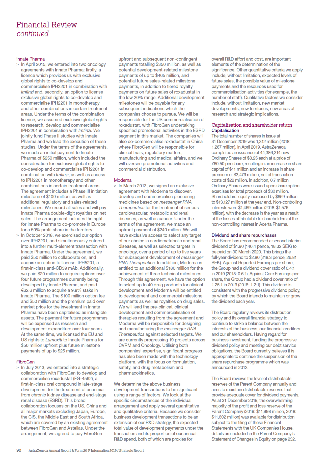 Financial Review continued Innate Pharma > In April 2015, we entered into two oncology agreements with Innate Pharma: firstly, a licence which provides us with exclusive global rights to co-develop and commercialise IPH2201 in combination with Imfinzi and, secondly, an option to license exclusive global rights to co-develop and commercialise IPH2201 in monotherapy and other combinations in certain treatment areas. Under the terms of the combination licence, we assumed exclusive global rights to research, develop and commercialise IPH2201 in combination with Imfinzi. We jointly fund Phase II studies with Innate Pharma and we lead the execution of these studies. Under the terms of the agreements, we made an initial payment to Innate Pharma of $250 million, which included the consideration for exclusive global rights to co-develop and commercialise IPH2201 in combination with Imfinzi, as well as access to IPH2201 in monotherapy and other combinations in certain treatment areas. The agreement includes a Phase III initiation milestone of $100 million, as well as additional regulatory and sales-related milestones. We record all sales and will pay Innate Pharma double-digit royalties on net sales. The arrangement includes the right for Innate Pharma to co-promote in Europe for a 50% profit share in the territory. > In October 2018, we exercised our option over IPH2201, and simultaneously entered into a further multi-element transaction with Innate Pharma. Under the agreement, we paid $50 million to collaborate on, and acquire an option to license, IPH5201, a first-in-class anti-CD39 mAb. Additionally, we paid $20 million to acquire options over four future programmes currently being developed by Innate Pharma, and paid €62.6 million to acquire a 9.8% stake in Innate Pharma. The $100 million option fee and $50 million and the premium paid over market price for the investment in Innate Pharma have been capitalised as intangible assets. The payment for future programmes will be expensed as research and development expenditure over four years. At the same time, we licensed the EU and US rights to Lumoxiti to Innate Pharma for $50 million upfront plus future milestone payments of up to $25 million. upfront and subsequent non-contingent payments totalling $350 million, as well as potential development-related milestone payments of up to $465 million, and potential future sales-related milestone payments, in addition to tiered royalty payments on future sales of roxadustat in the low 20% range. Additional development milestones will be payable for any subsequent indications which the companies choose to pursue. We will be responsible for the US commercialisation of roxadustat, with FibroGen undertaking specified promotional activities in the ESRD segment in this market. The companies will also co-commercialise roxadustat in China where FibroGen will be responsible for clinical trials, regulatory matters, manufacturing and medical affairs, and we will oversee promotional activities and commercial distribution. overall R&D effort and cost, are important elements of the determination of the significance. Other quantitative criteria we apply include, without limitation, expected levels of future sales, the possible value of milestone payments and the resources used for commercialisation activities (for example, the number of staff). Qualitative factors we consider include, without limitation, new market developments, new territories, new areas of research and strategic implications. Capitalisation and shareholder return Capitalisation The total number of shares in issue at 31 December 2019 was 1,312 million (2018: 1,267 million). In April 2019, AstraZeneca completed an issuance of 44,386,214 new Ordinary Shares of $0.25 each at a price of £60.50 per share, resulting in an increase in share capital of $11 million and an increase in share premium of $3,479 million, net of transaction costs of $22 million. In addition, 0.7 million Ordinary Shares were issued upon share option exercises for total proceeds of $32 million. Shareholders’ equity increased by $659 million to $13,127 million at the year end. Non-controlling interests were $1,469 million (2018: $1,576 million), with the decrease in the year as a result of the losses attributable to shareholders of the non-controlling interest in Acerta Pharma. Moderna > In March 2013, we signed an exclusive agreement with Moderna to discover, develop and commercialise pioneering medicines based on messenger RNA Therapeutics for the treatment of serious cardiovascular, metabolic and renal diseases, as well as cancer. Under the terms of the agreement, we made an upfront payment of $240 million. We will have exclusive access to select any target of our choice in cardiometabolic and renal diseases, as well as selected targets in oncology, over a period of up to five years for subsequent development of messenger RNA Therapeutics. In addition, Moderna is entitled to an additional $180 million for the achievement of three technical milestones. Through this agreement, we have the option to select up to 40 drug products for clinical development and Moderna will be entitled to development and commercial milestone payments as well as royalties on drug sales. We will lead the pre-clinical, clinical development and commercialisation of therapies resulting from the agreement and Moderna will be responsible for designing and manufacturing the messenger RNA Therapeutics against selected targets. We are currently progressing 19 projects across CVRM and Oncology. Utilising both companies’ expertise, significant progress has also been made with the technology platform, with the focus on formulation, safety, and drug metabolism and pharmacokinetics. Dividend and share repurchases The Board has recommended a second interim dividend of $1.90 (146.4 pence, 18.32 SEK) to be paid on 30 March 2020. This brings the full-year dividend to $2.80 (218.3 pence, 26.81 SEK). Against Reported 