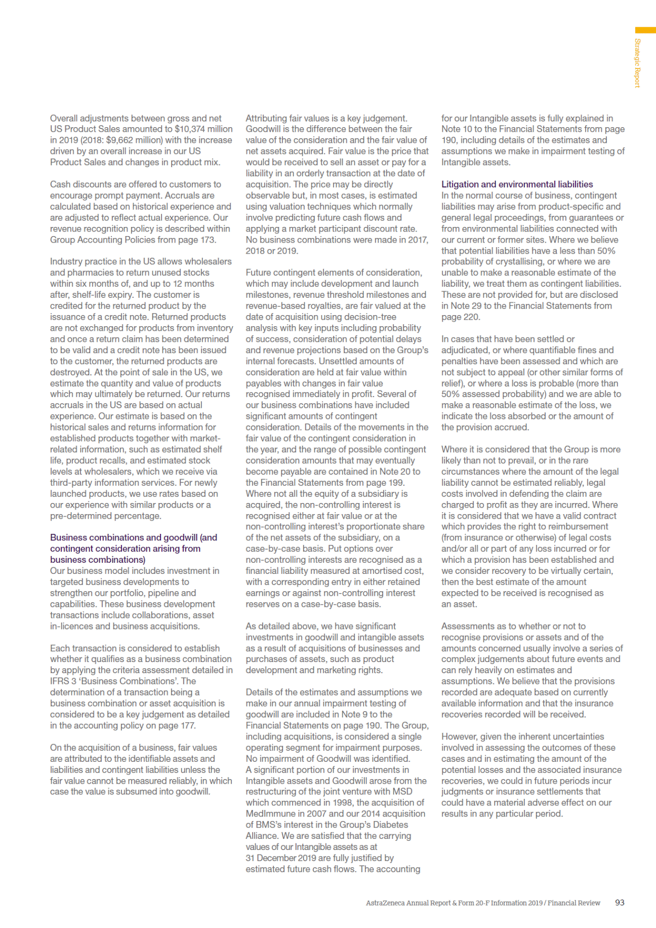 Overall adjustments between gross and net US Product Sales amounted to $10,374 million in 2019 (2018: $9,662 million) with the increase driven by an overall increase in our US Product Sales and changes in product mix. Attributing fair values is a key judgement. Goodwill is the difference between the fair value of the consideration and the fair value of net assets acquired. Fair value is the price that would be received to sell an asset or pay for a liability in an orderly transaction at the date of acquisition. The price may be directly observable but, in most cases, is estimated using valuation techniques which normally involve predicting future cash flows and applying a market participant discount rate. No business combinations were made in 2017, 2018 or 2019. for our Intangible assets is fully explained in Note 10 to the Financial Statements from page 190, including details of the estimates and assumptions we make in impairment testing of Intangible assets. Cash discounts are offered to customers to encourage prompt payment. Accruals are calculated based on historical experience and are adjusted to reflect actual experience. Our revenue recognition policy is described within Group Accounting Policies from page 173. Litigation and environmental liabilities In the normal course of business, contingent liabilities may arise from product-specific and general legal proceedings, from guarantees or from environmental liabilities connected with our current or former sites. Where we believe that potential liabilities have a less than 50% probability of crystallising, or where we are unable to make a reasonable estimate of the liability, we treat them as contingent liabilities. These are not provided for, but are disclosed in Note 29 to the Financial Statements from page 220. Industry practice in the US allows wholesalers and pharmacies to return unused stocks within six months of, and up to 12 months after, shelf-life expiry. The customer is credited for the returned product by the issuance of a credit note. Returned products are not exchanged for products from inventory and once a return claim has been determined to be valid and a credit note has been issued to the customer, the returned products are destroyed. At the point of sale in the US, we estimate the quantity and value of products which may ultimately be returned. Our returns accruals in the US are based on actual experience. Our estimate is based on the historical sales and returns information for established products together with market-related information, such as estimated shelf life, product recalls, and estimated stock levels at wholesalers, which we receive via third-party information services. For newly launched products, we use rates based on our experience with similar products or a pre-determined percentage. Future contingent elements of consideration, which may include development and launch milestones, revenue threshold milestones and revenue-based royalties, are fair valued at the date of acquisition using decision-tree analysis with key inputs including probability of success, consideration of potential delays and revenue projections based on the Group’s internal forecasts. Unsettled amounts of consideration are held at fair value within payables with changes in fair value recognised immediately in profit. Several of our business combinations have included significant amounts of contingent consideration. Details of the movements in the fair value of the contingent consideration in the year, and the range of possible contingent consideration amounts that may eventually become payable are contained in Note 20 to the Financial Statements from page 199. Where not all the equity of a subsidiary is acquired, the non-controlling interest is recognised either at fair value or at the non-controlling interest’s proportionate share of the net assets of the subsidiary, on a case-by-case basis. Put options over non-controlling interests are recognised as a financial liability measured at amortised cost, with a corresponding entry in either retained earnings or against non-controlling interest reserves on a case-by-case basis. In cases that have been settled or adjudicated, or where quantifiable fines and penalties have been assessed and which are not subject to appeal (or other similar forms of relief), or where a loss is probable (more than 50% assessed probability) and we are able to make a reasonable estimate of the loss, we indicate the loss absorbed or the amount of the provision accrued. Where it is considered that the Group is more likely than not to prevail, or in the rare circumstances where the amount of the legal liability cannot be estimated reliably, legal costs involved in defending the claim are charged to profit as they are incurred. Where it is considered that we have a valid contract which provides the right to reimbursement (from insurance or otherwise) of legal costs and/or all or part of any loss incurred or for which a provision has been established and we consider recovery to be virtually certain, then the best estimate of the amount expected to be received is recognised as an asset. Business combinations and goodwill (and contingent consideration arising from business combinations) Our business model includes investment in targeted business developments to strengthen our portfolio, pipeline and capabilities. These business development transactions include collaborations, asset in-licences and business acquisitions. As detailed above, we have significant investments in goodwill and intangible assets as a result of acquisitions of businesses and purchases of assets, such as product development and marketing rights. Assessments as to whether or not to recognise provisions or assets and of the amounts concerned usually involve a series of complex judgements about future events and can rely heavily on estimates and assumptions. We believe that the provisions recorded are adequate based on currently available 
