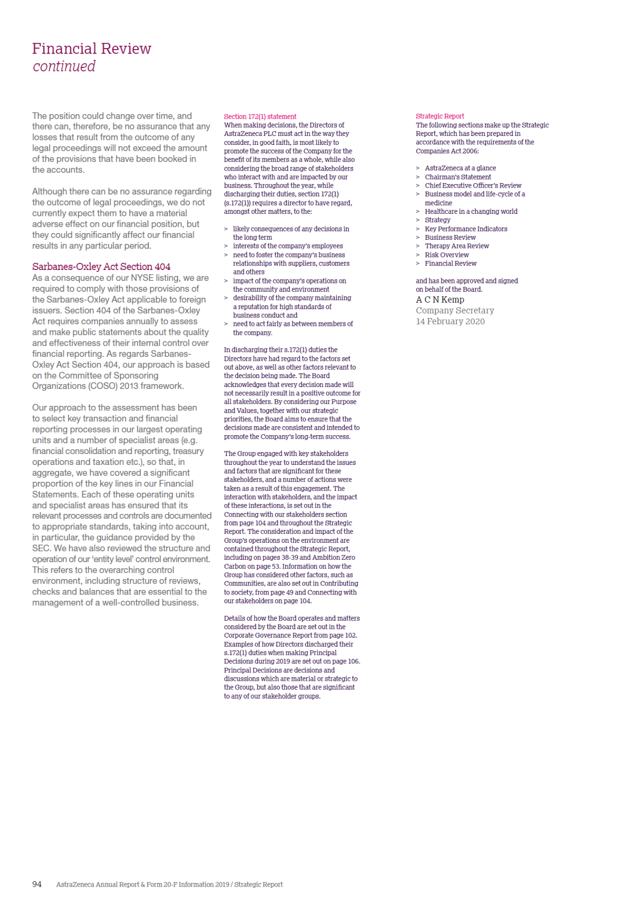 Financial Review continued The position could change over time, and there can, therefore, be no assurance that any losses that result from the outcome of any legal proceedings will not exceed the amount of the provisions that have been booked in the accounts. Section 172(1) statement When making decisions, the Directors of AstraZeneca PLC must act in the way they consider, in good faith, is most likely to promote the success of the Company for the benefit of its members as a whole, while also considering the broad range of stakeholders who interact with and are impacted by our business. Throughout the year, while discharging their duties, section 172(1) (s.172(1)) requires a director to have regard, amongst other matters, to the: Strategic Report The following sections make up the Strategic Report, which has been prepared in accordance with the requirements of the Companies Act 2006: > > > > AstraZeneca at a glance Chairman’s Statement Chief Executive Officer’s Review Business model and life-cycle of a medicine Healthcare in a changing world Strategy Key Performance Indicators Business Review Therapy Area Review Risk Overview Financial Review Although there can be no assurance regarding the outcome of legal proceedings, we do not currently expect them to have a material adverse effect on our financial position, but they could significantly affect our financial results in any particular period. > > > > > > > > likely consequences of any decisions in the long term interests of the company’s employees need to foster the company’s business relationships with suppliers, customers and others impact of the company’s operations on the community and environment desirability of the company maintaining a reputation for high standards of business conduct and need to act fairly as between members of the company. > > Sarbanes-Oxley Act Section 404 As a consequence of our NYSE listing, we are required to comply with those provisions of the Sarbanes-Oxley Act applicable to foreign issuers. Section 404 of the Sarbanes-Oxley Act requires companies annually to assess and make public statements about the quality and effectiveness of their internal control over financial reporting. As regards Sarbanes-Oxley Act Section 404, our approach is based on the Committee of Sponsoring Organizations (COSO) 2013 framework. > and has been approved and signed on behalf of the Board. A C N Kemp Company Secretary 14 February 2020 > > In discharging their s.172(1) duties the Directors have had regard to the factors set out above, as well as other factors relevant to the decision being made. The Board acknowledges that every decision made will not necessarily result in a positive outcome for all stakeholders. By considering our Purpose and Values, together with our strategic priorities, the Board aims to ensure that the decisions made are consistent and intended to promote the Company’s long-term success. Our approach to the assessment has been to select key transaction and financial reporting processes in our largest operating units and a number of specialist areas (e.g. financial consolidation and reporting, treasury operations and taxation etc.), so that, in aggregate, we have covered a significant proportion of the key lines in our Financial Statements. Each of these operating units and specialist areas has ensured that its relevant processes and controls are documented to appropriate standards, taking into account, in particular, the guidance provided by the SEC. We have also reviewed the structure and operation of our ‘entity level’ control environment. This refers to the overarching control environment, including structure of reviews, checks and balances that are essential to the management of a well-controlled business. The Group engaged with key stakeholders throughout the year to understand the issues and factors that are significant for these stakeholders, and a number of actions were taken as a result of this engagement. The interaction with stakeholders, and the impact of these interactions, is set out in the Connecting with our stakeholders section from page 104 and throughout the Strategic Report. The consideration and impact of the Group’s operations on the environment are contained throughout the Strategic Report, including on pages 38-39 and Ambition Zero Carbon on page 53. Information on how the Group has considered other factors, such as Communities, are also set out in Contributing to society, from page 49 and Connecting with our stakeholders on page 104. Details of how the Board operates and matters considered by the Board are set out in the Corporate Governance Report from page 102. Examples of how Directors discharged their s.172(1) duties when making Principal Decisions during 2019 are set out on page 106. Principal Decisions are decisions and discussions which are material or strategic to the Group, but also those that are significant to any of our stakeholder groups. 94 AstraZeneca Annual Report & Form 20-F Information 2019 / Strategic Report