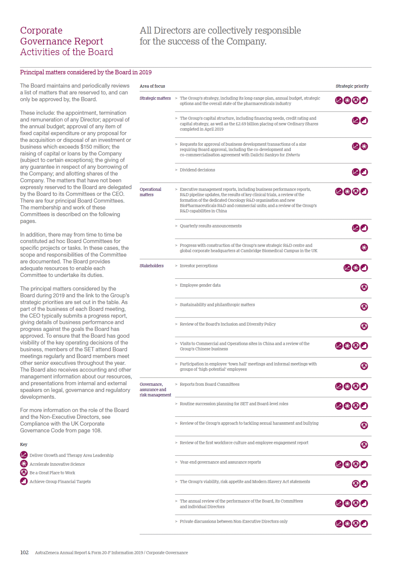 Corporate Governance Overview Delivery How our governance supports the delivery of our strategy All Directors are collectively responsible for the success of the Group. The Non-Executive Directors exercise independent, objective judgement in respect of Board decisions, and scrutinise and challenge management. They also have various responsibilities concerning the integrity of financial information, internal controls and risk management. The Board is responsible for setting our strategy and policies, overseeing risk and corporate governance, and monitoring progress towards meeting our objectives and annual plans. It is accountable to our shareholders for the proper conduct of the business and our long-term success, and seeks to represent the interests of all stakeholders. The Board conducts an annual review of the Group’s overall strategy. The CEO, CFO and Senior Executive Team (SET) take the lead in developing our strategy, which is then reviewed, constructively challenged and approved by the Board. Governance structure The Board has delegated some of its powers to the CEO and operates with the assistance of four Committees: In addition to the SET, we have two senior-level governance bodies: Attendance in 2019 Board Committee membership and meeting attendance in 2019 Nomination and Governance Name Board Audit Remuneration Science Board or Committee Chairman Geneviève Berger 5(7) 2(2) The Board held seven meetings in 2019, including its usual annual strategy review. Five took place in London, UK; one was held at AstraZeneca’s facilities in Shanghai and Wuxi, China; and one was held as a teleconference/ videoconference call. Philip Broadley 7(7) 6(6) 5(5) 4(4) Graham Chipchase 7(7) 5(5) 5(5) Michel Demaré – appointed 1 September 2019 3(3) 2(2) Deborah DiSanzo 7(7) 6(6) Marc Dunoyer 7(7) Leif Johansson 7(7) 5(5) 5(5) The Board is currently scheduled to meet six times in 2020 and will meet at such other times as may be required to conduct business. Rudy Markham – retired 26 April 2019 3(3) 3(3) 1(1) 3(3) Sheri McCoy 7(7) 6(6) 5(5) Tony Mok 7(7) 2(2) Nazneen Rahman 7(7) 5(5) 2(2) Pascal Soriot 7(7) Marcus Wallenberg 6(7) 2(2) Note: number in brackets denotes number of meetings during the year that Board members were entitled to attend. For more information, see Changes to the composition of the Board and its Committees for the year ended 31 December 2019 on page 98. For more information on attendance at Board and Committee meetings, see Role of Non-Executive Directors on page 110. 97 AstraZeneca Annual Report & Form 20-F Information 2019 / Corporate Governance Corporate Governance Late Stage Portfolio Committee Page 100 Early Stage Portfolio Committee Page 100 Senior Executive Team (SET) Details of our SET on pages 100 and 101 Science Committee Report from page 113 Remuneration Committee Report from page 125 Nomination and Governance Committee Report from page 114 Audit Committee Report from page 116 Board Corporate Governance Report from page 102