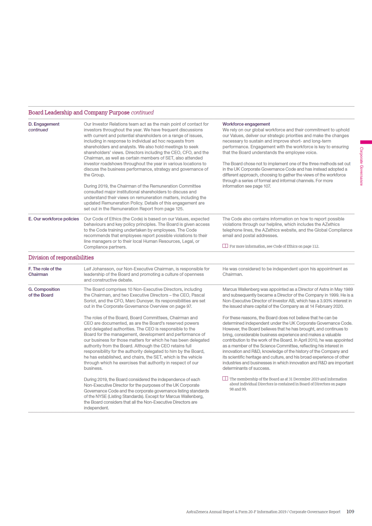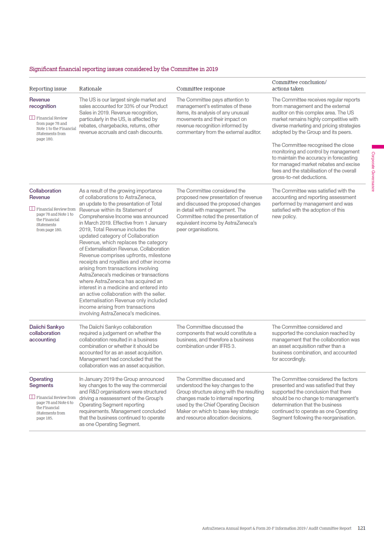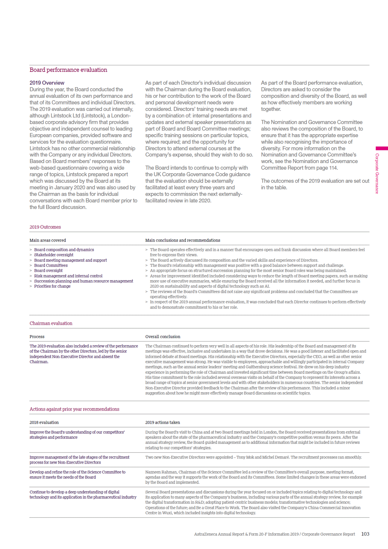Chairman’s Introduction Good corporate governance is a prerequisite for a well-run company and this Corporate Governance Report reflects the new regulations which encourage transparency in governance reporting and enhance understanding of how AstraZeneca is managed. “Transparency is another essential element in any well-run company. It is integral to the way AstraZeneca operates.” An engaged Board If good corporate governance is at the heart of a well-run company, it requires talented and committed Directors, like those we have at AstraZeneca, to bring it to life in the way they carry out their responsibilities. We were therefore delighted when Michel Demaré joined the Board as a Director in September. He has a great deal of industrial, financial and board-level experience across a range of sectors, including science and technology, that is enabling him to contribute well to the work of our Board and Audit Committee. Greater transparency Transparency is another essential element in any well-run company. It is integral to the way AstraZeneca operates – including the operation of the Board and its sub-committees. I would therefore urge you to explore the sections in this Corporate Governance Report that describe how the Board operates in a manner that encourages open and frank discussion, as well as how we engage with and consider the views of stakeholders and, in particular, how we engage with our talented workforce. In April 2019, to fund the upfront payment and near-term milestone payments under the transaction, repay a bond that was falling due, as well as for other corporate purposes, we raised approximately $3.5 billion through a placing of new Ordinary Shares in the Company. Our decision to fund the transaction with equity is in line with our capital allocation priorities which are to invest in the business, maintain a progressive dividend and retain a strong investment grade credit rating. It is also in line with our strategy of investing in assets with growth potential. Collaboration with Daiichi Sankyo and share placing In March 2019, we announced that we had entered into a global development and commercialisation collaboration agreement with Daiichi Sankyo for Enhertu. Enhertu is a proprietary antibody-drug conjugate which, in December, received accelerated approval in the US for the treatment of adult patients with HER2-positive breast cancer. We believe it could become a transformative new medicine in a number of other cancers. Appreciation In closing, I would like to thank all the Directors for their contribution to the Board’s deliberations and, more broadly, thank Pascal, Marc and the entire AstraZeneca team for their efforts which resulted in a year of innovation for patients in 2019, with the promise of more to come. Earlier in the year, Rudy Markham retired at our AGM after ten years on the Board. He had been an exceptional Director, latterly acting as our senior independent Non-Executive Director and chairing the Audit Committee. Graham Chipchase took over as senior independent Non-Executive Director at the start of 2019, while Philip Broadley succeeded Rudy as Chairman of the Audit Committee. I am grateful to them both, and to Nazneen Rahman who chairs the Science Committee, for taking on and discharging so ably these important additional responsibilities. Leif Johansson Chairman 96 AstraZeneca Annual Report & Form 20-F Information 2019 / Corporate Governance