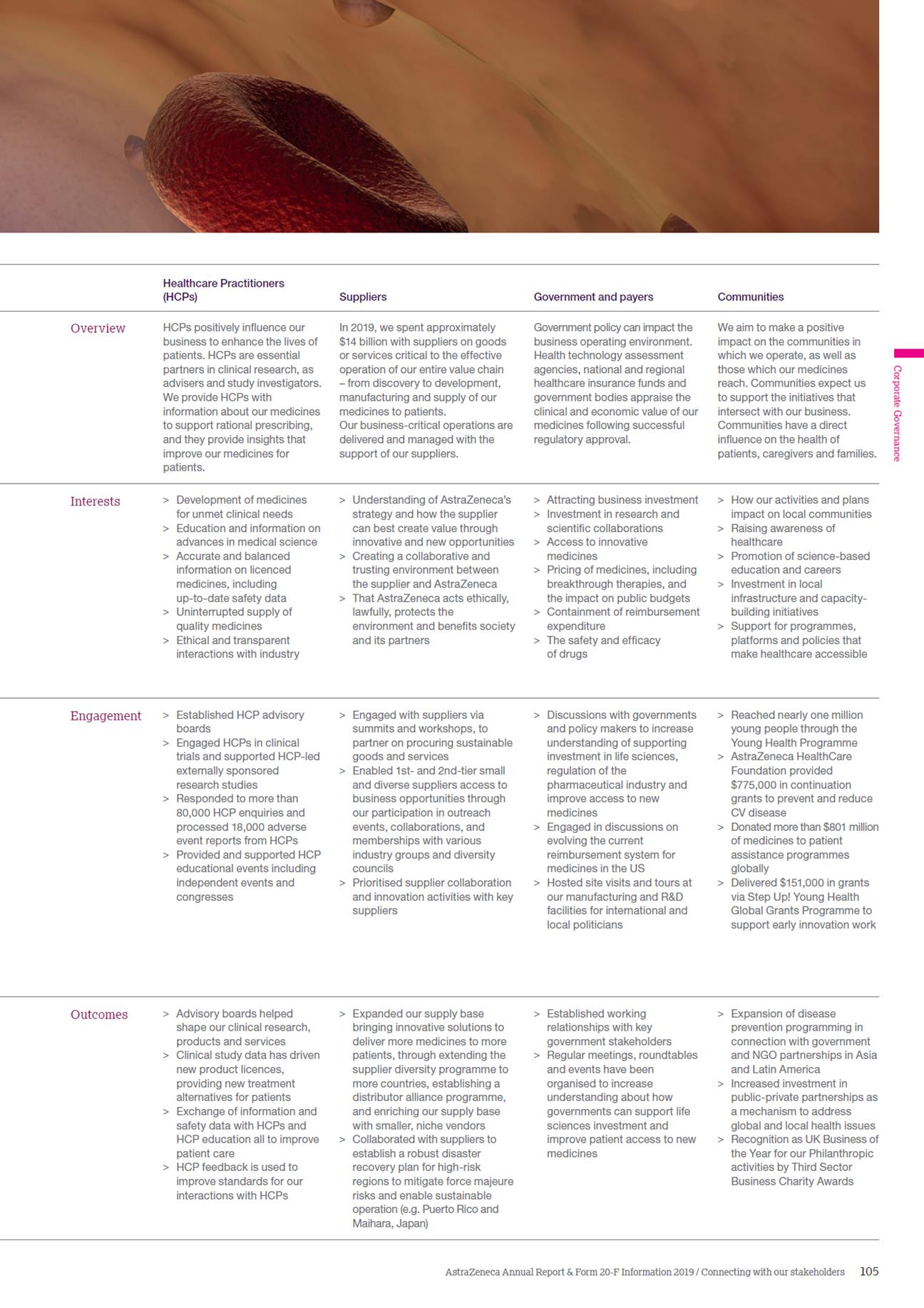 Sustainability Benchmarking and assurance Recognition of our work in sustainability BV We want to be valued and trusted by our stakeholders as a source of great medicines over the long term. We deliver our business strategy in a way that broadens access to our medicines, minimises the environmental footprint of our products and processes, and ensures that ethics and transparency underpin everything we do. DJSI > Named in the Dow Jones Sustainability World and Europe Indices > Attained industry-best scores for: Environmental Reporting, Labour Practice Indicators, Health Outcome Contribution and Social Reporting Governance Sustainability governance frames how we operate. Geneviève Berger, a Non-Executive Director, oversees the implementation of our sustainability matters on behalf of the Board of Directors. Our ambition is to be a leader in sustainability by delivering the strategy from the materiality assessment carried out in 2018 and as outlined in our Sustainability Report. Katarina Ageborg is responsible for the global strategy, and performance measures are tracked by the SET on the quarterly Company Scorecard. FTSE4Good > Named as a FTSE4Good Index series constituent, which is designed to measure the performance of companies demonstrating strong Environmental, Social and Governance (ESG) practices CDP > Water A List – among the top 1.5% of companies participating in CDP’s water security programme for our commitment to transparency around environmental risks and demonstration of sustainable water management > Climate change A List – in recognition of our strategy and actions to reduce emissions and mitigate climate change ISAE3000 Assured > Bureau Veritas has provided independent external assurance to a limited level in accordance with the International Standard on Assurance Engagements 3000 (ISAE3000), and in accordance with ISAE3410 Assurance Engagements on Greenhouse Gas Statements for the sustainability information contained within this Annual Report and Form 20-F Our Sustainability Advisory Board comprises five SET members and four external sustainability experts. It provided guidance on strategic direction, recommendations for opportunities, and insights and feedback twice in 2019. Throughout the year, we engaged with employees and external stakeholders, including investors, Ministries of Health, NGOs, patients and suppliers. For more information, see Sustainability: supplementary information on page 266 and the letter of assurance available on www.astrazeneca.com/sustainability. Our approach Our approach is aligned with our Purpose and business strategy, allowing us to maximise the benefit for our patients, our business, broader society and the planet. As outlined below, we have a global strategy that integrates sustainability practices throughout our operations. In 2019, we put into operation our updated approach based on a structured sustainability materiality assessment that engaged external and internal stakeholders. We measure our progress through annual and long-term targets, and sustainability-related occurrences are incorporated into publicly released quarterly results for investors. We recognise the connection between enterprise risk management and sustainability management. Enterprise risk management helped inform the sustainability materiality assessment and we have better aligned our risk and sustainability classifications. Sustainability is considered throughout our quarterly risk reviews. We show performance in our Sustainability Data Summary. Expanded discussion about our sustainability journey is in our 2019 Sustainability Report. Learn more on our website, www.astrazeneca.com/sustainability. 51 AstraZeneca Annual Report & Form 20-F Information 2019 / Business Review Strategic Report