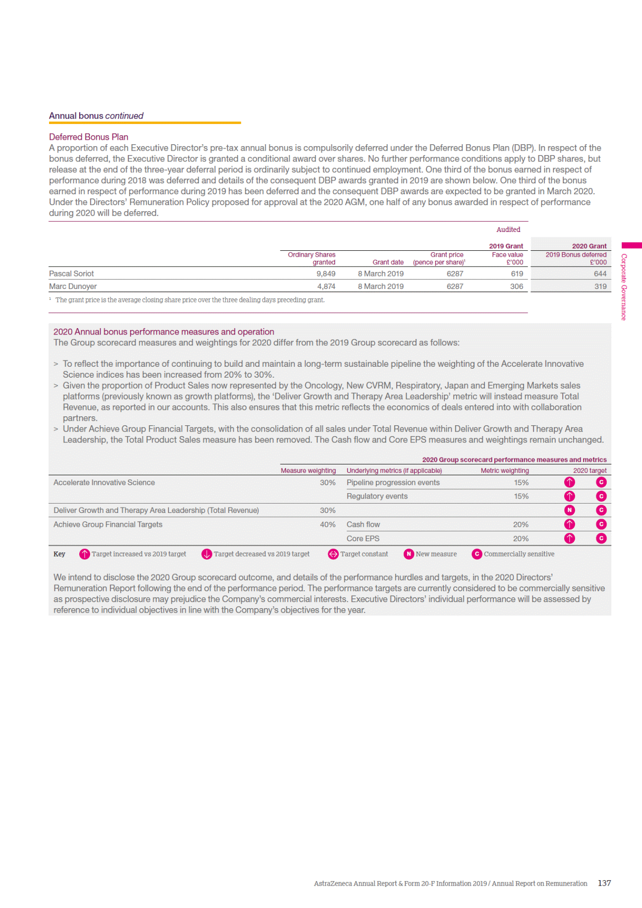 disclosing sensitive commercial information at the individual KPI level. These changes are explained in more detail throughout this section and more information can be found in the Directors’ Remuneration Report from page 125. Any variances between the KPI and values used in determining remuneration are explained in the Directors’ Remuneration Report from page 125. KPI key New in 2019 Used for remuneration of Executive Directors Denotes a scale break. Key Performance Indicators Accelerate Innovative Science The Accelerate Innovative Science KPIs measure the performance of the pipeline. Pipeline progression events (Phase II NME starts/progressions and Phase III investment decisions) measure innovation and sustainability. Regulatory events demonstrate the advancement of this innovation to patients and the value to the Group. Pipeline progression events 22 Regulatory events 63 1 17 against our Group scorecard for determining annual bonus. 1 37 against our Group scorecard for determining annual bonus. By measuring both Phase II and Phase III pipeline progressions, we are focused on both near-term and longer-term delivery. Phase II NME starts ensure the ongoing robustness and future stability of the pipeline (and reflect the outcome of nearer-term strategic investment decisions). Phase III investments measure assets that will deliver nearer-term value (and reflect the outcome of longer-term strategic investment decisions). NME Phase II starts/progressions NME or LCM project regulatory submissions in major markets 35 8 1 6 against our Group scorecard for determining annual bonus. 1 14 against our Group scorecard for determining annual bonus. 2 24 for determining annual bonus. 3 13 for determining annual bonus. Submissions and approvals metrics demonstrate the advancement of this innovation through filing and approval in our four major markets (US, EU, Japan and China). Phase III investment decisions NME and major LCM regional approvals 28 14 1 11 against our Group scorecard for determining annual bonus. 1 23 against our Group scorecard for determining annual bonus. “In 2019, we had 22 pipeline progressions, and an average of 24 progressions in each of the last four years.” Changes to KPIs in 2019 The totals of Pipeline progression and Regulatory events are new KPIs as outlined in Our KPIs and remuneration above. The former is a total of NME Phase II starts/progressions and Phase III investment decisions. The latter represents the total of NME or LCM regulatory submissions and approvals. Innovative science from page 25; Therapy Area Review from page 54; Development Pipeline from page 238. 21 AstraZeneca Annual Report & Form 20-F Information 2019 / Key Performance Indicators Strategic Report 2019 281 2018 23 2017 19 2019 141 2018 19 2017 9 2019 351 2018 282 2017 183 2019 81 2018 9 2017 14 2019 631 2018 51 2017 37 2019 22¹ 2018 28 2017 23