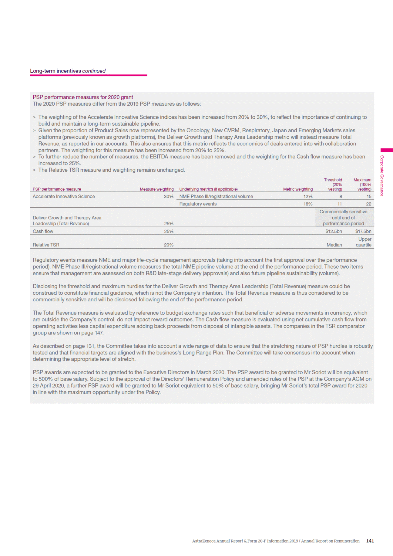 Chairman’s Statement In the first full year of our return to Product Sales growth, we made good progress in line with our strategy. We anticipate 2020 to be another year of progress. “Looking ahead, …we will maintain our focus on executing a strategy centred on science and patients.” 2019 performance and what’s next With Product Sales in 2019 up by 12% (15% at CER), we delivered a year of strong revenue growth. Good progress was also made with a pipeline that produced an extensive number of regulatory approvals and data readouts. Of course, seeking to lead and push the boundaries of science means that sometimes we do not succeed and our results in 2019 reflect an intangible asset impairment following the closure of the Phase III STRENGTH trial for Epanova due to its low likelihood of demonstrating a benefit to patients. Success will come to those companies able to grasp the opportunities offered and overcome the challenges faced. The Board and I are encouraged by AstraZeneca’s re-emergence as a science leader, and how it is embracing those opportunities and driving change in the industry. $2.80 Full-year dividend of $2.80 per share Nowhere is change more evident than in the US, where we are working with policymakers to ensure patients continue to have access to the medicines they need. We are actively supporting solutions that provide access and affordability while continuing to support scientific innovation. These include efforts to reform the system of rebates, ensuring patients are benefiting from the discounts we provide and the broader implementation of value-based reimbursement models. Broad-based progress AstraZeneca’s financial performance in 2019 reflected a year of innovation for patients. Results from our New Medicines1 and Emerging Markets accompanied positive news for patients and growing sales in all three of our therapy areas. This balance across our medicines and regions is matched by a balance across primary and specialty care treatments, which, together with our healthy pipeline of candidate medicines, forms a firm foundation for what we believe will be growth in the coming years. So far as 2020 is concerned, we anticipate another year of progress for AstraZeneca with continued focus on improving operating leverage and cash generation. In light of this, the Board reaffirmed its commitment to the progressive dividend policy; with a second interim dividend of $1.90 per share taking the unchanged full-year dividend per share to $2.80. Working with stakeholders We are only able to achieve this because of the strong team Pascal has assembled at AstraZeneca. But driving change only happens as a result of engaging successfully with a wide range of stakeholders beyond our shareholders – employees and patients, healthcare providers and governments, suppliers and the communities in which we operate. We report on how we do that in the Corporate Governance Report from page 104 and I have seen this with my own eyes when representing AstraZeneca across the world. Our outlook for 2020 reflects our assessment of the Covid-19 virus outbreak and assumes an unfavourable impact lasting up to a few months. Responding to a changing world Our return to Product Sales growth also reflects our success in responding to a changing world. It is a world of economic growth and increasing wealth, of a growing and ageing global population and challenged by an increasing burden of chronic and non-communicable diseases. Looking ahead, and as we reinforce our commitment to achieving our long-term climate change and decarbonisation targets, we will maintain our focus on executing a strategy centred on science and patients. Leading in sustainability Leading in science means we have a responsibility to take a lead in applying the science to the world in which we live. It is why I am proud of our Ambition Zero Carbon strategy announced at the World Economic Forum in January 2020 to eliminate emissions by 2025 and be carbon negative across the entire value chain by 2030. It is also a world of pricing pressures and of strong competition in which unparalleled scientific and technological advances are transforming both the pharmaceutical sector and people’s ability to manage their own health. Leif Johansson Chairman 4 AstraZeneca Annual Report & Form 20-F Information 2019 / Strategic Report