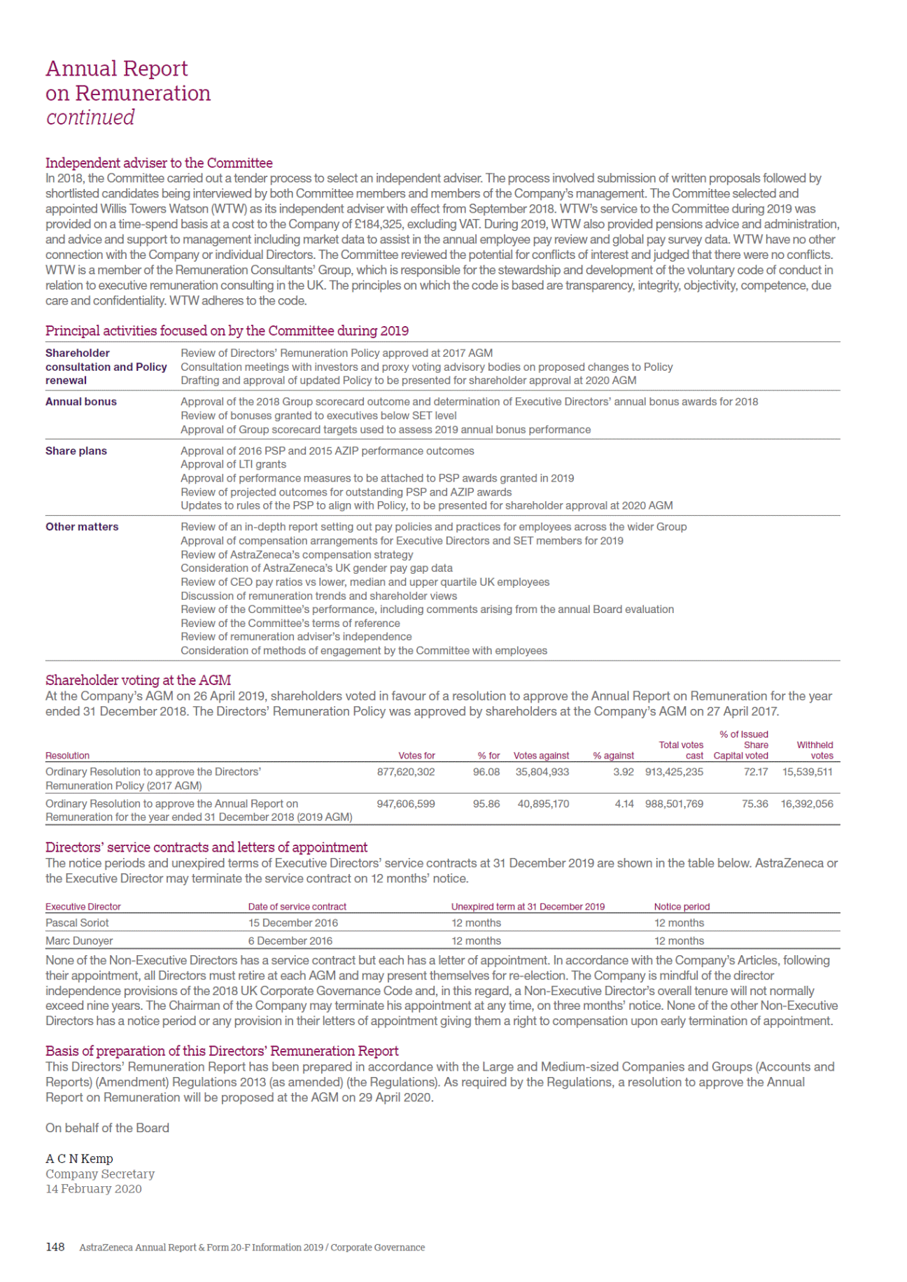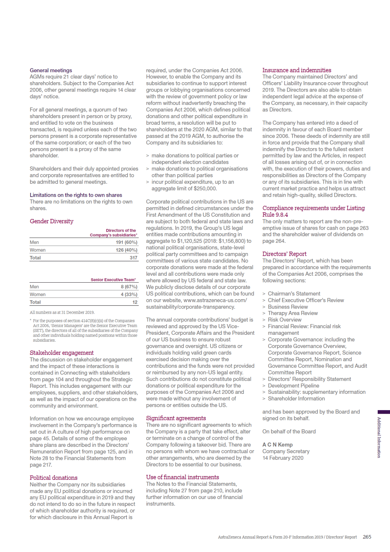Insurance and indemnities The Company maintained Directors’ and Officers’ Liability Insurance cover throughout 2019. The Directors are also able to obtain independent legal advice at the expense of the Company, as necessary, in their capacity as Directors. General meetings AGMs require 21 clear days’ notice to shareholders. Subject to the Companies Act 2006, other general meetings require 14 clear days’ notice. required, under the Companies Act 2006. However, to enable the Company and its subsidiaries to continue to support interest groups or lobbying organisations concerned with the review of government policy or law reform without inadvertently breaching the Companies Act 2006, which defines political donations and other political expenditure in broad terms, a resolution will be put to shareholders at the 2020 AGM, similar to that passed at the 2019 AGM, to authorise the Company and its subsidiaries to: For all general meetings, a quorum of two shareholders present in person or by proxy, and entitled to vote on the business transacted, is required unless each of the two persons present is a corporate representative of the same corporation; or each of the two persons present is a proxy of the same shareholder. The Company has entered into a deed of indemnity in favour of each Board member since 2006. These deeds of indemnity are still in force and provide that the Company shall indemnify the Directors to the fullest extent permitted by law and the Articles, in respect of all losses arising out of, or in connection with, the execution of their powers, duties and responsibilities as Directors of the Company or any of its subsidiaries. This is in line with current market practice and helps us attract and retain high-quality, skilled Directors. > make donations to political parties or independent election candidates > make donations to political organisations other than political parties > incur political expenditure, up to an aggregate limit of $250,000. Shareholders and their duly appointed proxies and corporate representatives are entitled to be admitted to general meetings. Limitations on the rights to own shares There are no limitations on the rights to own shares. Corporate political contributions in the US are permitted in defined circumstances under the First Amendment of the US Constitution and are subject to both federal and state laws and regulations. In 2019, the Group’s US legal entities made contributions amounting in aggregate to $1,120,525 (2018: $1,156,800) to national political organisations, state-level political party committees and to campaign committees of various state candidates. No corporate donations were made at the federal level and all contributions were made only where allowed by US federal and state law. We publicly disclose details of our corporate US political contributions, which can be found on our website, www.astrazeneca-us.com/ sustainability/corporate-transparency. Compliance requirements under Listing Rule 9.8.4 The only matters to report are the non-pre-emptive issue of shares for cash on page 263 and the shareholder waiver of dividends on page 264. Gender Diversity Directors of the Company’s subsidiaries* Men 191 (60%) Women 126 (40%) Directors’ Report The Directors’ Report, which has been prepared in accordance with the requirements of the Companies Act 2006, comprises the following sections: Total 317 Senior Executive Team* Men 8 (67%) > Chairman’s Statement > Chief Executive Officer’s Review > Business Review > Therapy Area Review > Risk Overview > Financial Review: Financial risk management > Corporate Governance: including the Corporate Governance Overview, Corporate Governance Report, Science Committee Report, Nomination and Governance Committee Report, and Audit Committee Report > Directors’ Responsibility Statement > Development Pipeline > Sustainability: supplementary information > Shareholder Information Women 4 (33%) Total 12 All numbers as at 31 December 2019. * For the purposes of section 414C(8)(c)(ii) of the Companies Act 2006, ‘Senior Managers’ are the Senior Executive Team (SET), the directors of all of the subsidiaries of the Company and other individuals holding named positions within those subsidiaries. The annual corporate contributions’ budget is reviewed and approved by the US Vice-President, Corporate Affairs and the President of our US business to ensure robust governance and oversight. US citizens or individuals holding valid green cards exercised decision making over the contributions and the funds were not provided or reimbursed by any non-US legal entity. Such contributions do not constitute political donations or political expenditure for the purposes of the Companies Act 2006 and were made without any involvement of persons or entities outside the US. Stakeholder engagement The discussion on stakeholder engagement and the impact of these interactions is contained in Connecting with stakeholders from page 104 and throughout the Strategic Report. This includes engagement with our employees, suppliers, and other stakeholders, as well as the impact of our operations on the community and environment. and has been approved by the Board and signed on its behalf. Significant agreements There are no significant agreements to which the Company is a party that take effect, alter or terminate on a change of control of the Company following a takeover bid. There are no persons with whom we have contractual or other arrangements, who are deemed by the Directors to be essential to our business. Information on how we encourage employee involvement in the Company’s performance is set out in A culture of high performance on page 45. Details of some of the employee share plans are described in the Directors’ Remuneration Report from page 125, and in Note 28 to the Financial Statements from page 217. On behalf of the Board A C N Kemp Company Secretary 14 February 2020 Use of financial instruments The Notes 