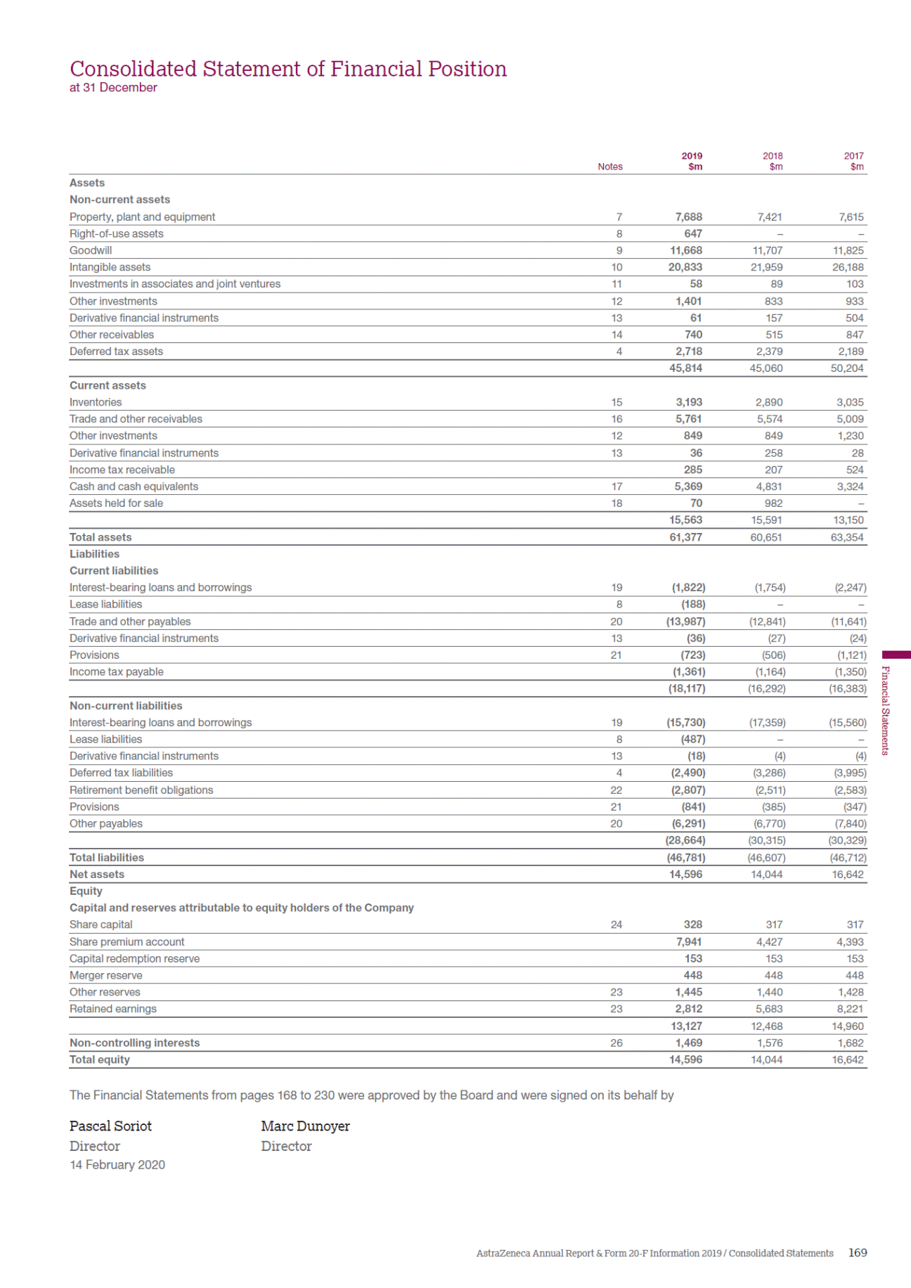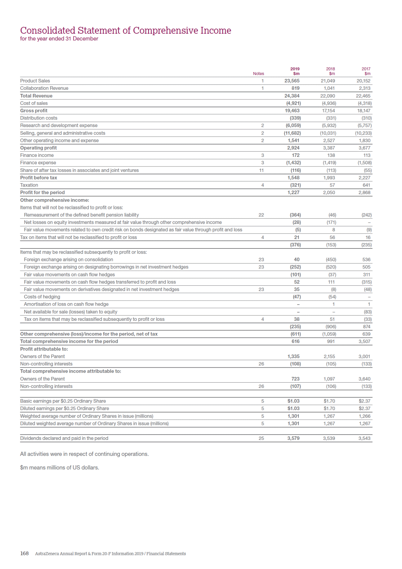 Strategic Report AstraZeneca at a glance 2 Chairman’s Statement 4 Chief Executive Officer’s Review 5 Business model and life-cycle of a medicine 8 Healthcare in a changing world 11 Strategy 17 Key Performance Indicators 20 Business Review 24 Therapy Area Review 54 Contents > > Oncology 54 Cardiovascular, Renal & Metabolism 60 Respiratory 66 Other Disease Areas 71 > > Financial highlights Risk Overview 74 Financial Review 78 Total Revenue* Up 10% at actual rate of exchange to $24,384 million (up 13% at CER), comprising Product Sales of $23,565 million (up 12%; 15% at CER) and Collaboration Revenue of $819 million (down 21%; 20% at CER) Net cash flow from operating activities Up 13% at actual rate of exchange to $2,969 million Corporate Governance Chairman’s Introduction 96 Corporate Governance Overview 97 Board of Directors 98 Senior Executive Team 100 Corporate Governance Report 102 Science Committee Report 113 Nomination and Governance Committee Report 114 Audit Committee Report 116 Directors’ Remuneration Report 125 Remuneration Policy 149 $24.4bn $3.0bn Reported operating profit Down 14% at actual rate of exchange to $2,924 million (down 16% at CER) Core operating profit Up 13% at actual rate of exchange to $6,436 million (up 13% at CER) $2.9bn $6.4bn Financial Statements Preparation of the Financial Statements and Directors’ Responsibilities 161 Auditors’ Report 162 Consolidated Statements 168 Group Accounting Policies 172 Notes to the Group Financial Statements 180 Group Subsidiaries and Holdings 227 Company Statements 231 Company Accounting Policies 233 Notes to the Company Financial Statements 234 Group Financial Record 236 Reported EPS Down 40% at actual rate of exchange to $1.03 (down 44% at CER) Core EPS Up 1% at actual rate of exchange to $3.50 (0% at CER) $1.03 $3.50 Denotes a scale break. Throughout this Annual Report, all bar chart scales start from zero. We use a scale break where charts of a different magnitude, but the same unit of measurement, are presented alongside each other. For more information in relation to the inclusion of Reported performance, Core financial measures and constant exchange rate (CER) growth rates as used in this Annual Report, see the Financial Review from page 78. * As detailed from page 173, Total Revenue consists of Product Sales and Collaboration Revenue. Additional Information Development Pipeline 238 Patent Expiries of Key Marketed Products 243 Risk 246 Shareholder Information 258 Directors’ Report 263 Sustainability: supplementary information 266 Trade Marks 267 Glossary 268 Cautionary statement regarding forward-looking statements 272 Key For more information within this Annual Report For more information, see www.astrazeneca.com Denotes sustainability information independently assured by Bureau Veritas BV This Annual Report is also available on our website, www.astrazeneca.com/annualreport2019 1 AstraZeneca Annual Report & Form 20-F Information 2019 / Contents Strategic Report Corporate Governance Financial Statements Additional Information 2019 $3.50 2018 $3.46 2017 $4.28 2019 $1.03 2018 $1.70 2017 $2.37 2019 $6,436m 2018 $5,672m 2017 $6,855m 2019 $2,924m 2018 $3,387m 2017 $3,677m 2019 $2,969m 2018 $2,618m 2017 $3,578m 2019 $24,384m 2018 $22,090m 2017 $22,465m