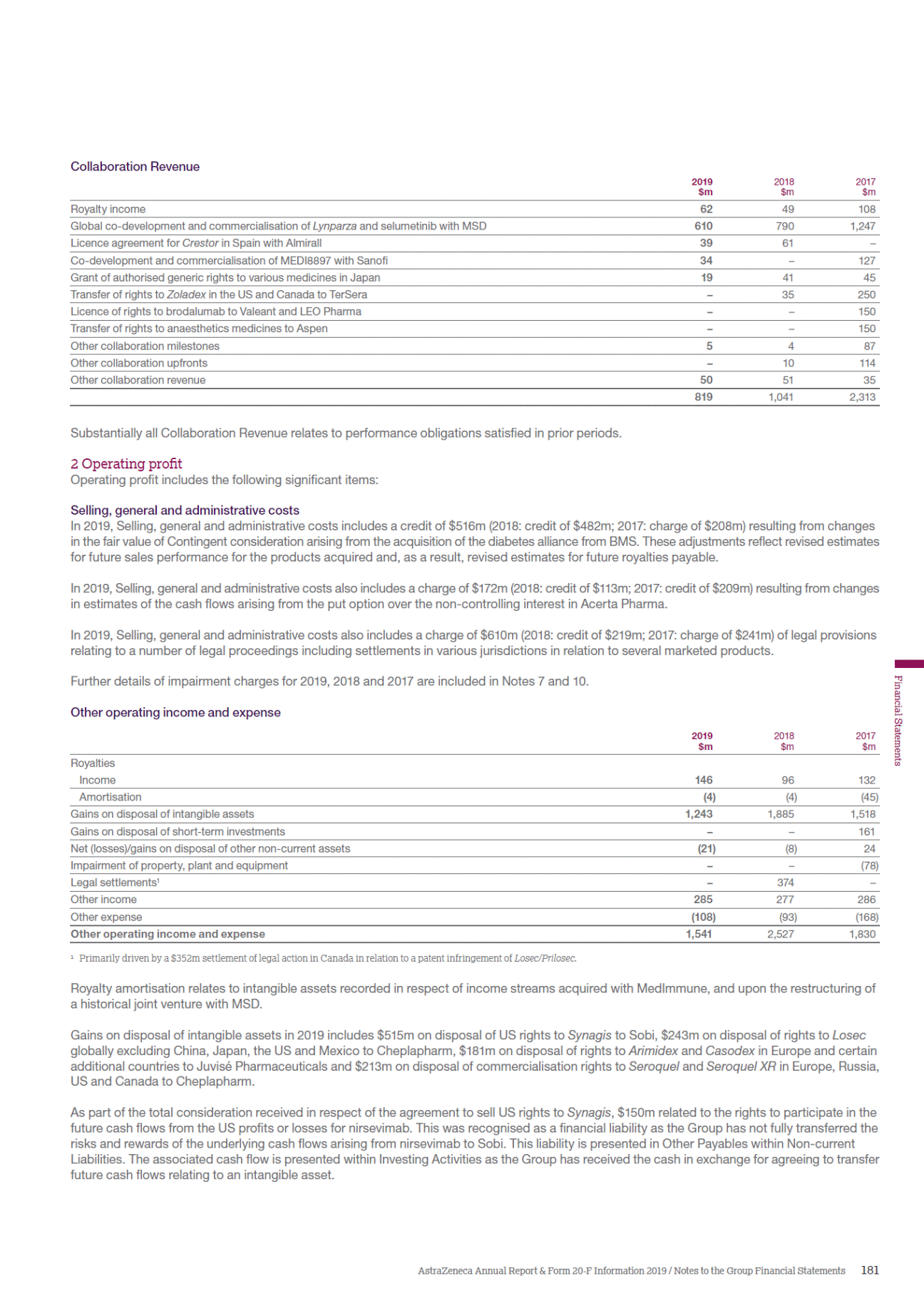 Collaboration Revenue 2019 $m 2018 $m 2017 $m Royalty income 62 49 108 Global co-development and commercialisation of Lynparza and selumetinib with MSD 610 790 1,247 Licence agreement for Crestor in Spain with Almirall 39 61 – Co-development and commercialisation of MEDI8897 with Sanofi 34 – 127 Grant of authorised generic rights to various medicines in Japan 19 41 45 Transfer of rights to Zoladex in the US and Canada to TerSera – 35 250 Licence of rights to brodalumab to Valeant and LEO Pharma – – 150 Transfer of rights to anaesthetics medicines to Aspen – – 150 Other collaboration milestones 5 4 87 Other collaboration upfronts – 10 114 Other collaboration revenue 50 51 35 819 1,041 2,313 Substantially all Collaboration Revenue relates to performance obligations satisfied in prior periods. 2 Operating profit Operating profit includes the following significant items: Selling, general and administrative costs In 2019, Selling, general and administrative costs includes a credit of $516m (2018: credit of $482m; 2017: charge of $208m) resulting from changes in the fair value of Contingent consideration arising from the acquisition of the diabetes alliance from BMS. These adjustments reflect revised estimates for future sales performance for the products acquired and, as a result, revised estimates for future royalties payable. In 2019, Selling, general and administrative costs also includes a charge of $172m (2018: credit of $113m; 2017: credit of $209m) resulting from changes in estimates of the cash flows arising from the put option over the non-controlling interest in Acerta Pharma. In 2019, Selling, general and administrative costs also includes a charge of $610m (2018: credit of $219m; 2017: charge of $241m) of legal provisions relating to a number of legal proceedings including settlements in various jurisdictions in relation to several marketed products. Further details of impairment charges for 2019, 2018 and 2017 are included in Notes 7 and 10. Other operating income and expense 2019 $m 2018 $m 2017 $m Royalties Income 146 96 132 Amortisation (4) (4) (45) Gains on disposal of intangible assets 1,243 1,885 1,518 Gains on disposal of short-term investments – – 161 Net (losses)/gains on disposal of other non-current assets (21) (8) 24 Impairment of property, plant and equipment – – (78) Legal settlements1 – 374 – Other income 285 277 286 Other expense (108) (93) (168) Other operating income and expense 1,541 2,527 1,830 1 Primarily driven by a $352m settlement of legal action in Canada in relation to a patent infringement of Losec/Prilosec. Royalty amortisation relates to intangible assets recorded in respect of income streams acquired with MedImmune, and upon the restructuring of a historical joint venture with MSD. Gains on disposal of intangible assets in 2019 includes $515m on disposal of US rights to Synagis to Sobi, $243m on disposal of rights to Losec globally excluding China, Japan, the US and Mexico to Cheplapharm, $181m on disposal of rights to Arimidex and Casodex in Europe and certain additional countries to Juvisé Pharmaceuticals and $213m on disposal of commercialisation rights to Seroquel and Seroquel XR in Europe, Russia, US and Canada to Cheplapharm. As part of the total consideration received in respect of the agreement to sell US rights to Synagis, $150m related to the rights to participate in the future cash flows from the US profits or losses for nirsevimab. This was recognised as a financial liability as the Group has not fully transferred the risks and rewards of the underlying cash flows arising from nirsevimab to Sobi. This liability is presented in Other Payables within Non-current Liabilities. The associated cash flow is presented within Investing Activities as the Group has received the cash in exchange for agreeing to transfer future cash flows relating to an intangible asset. AstraZeneca Annual Report & Form 20-F Information 2019 / Notes to the Group Financial Statements 181 Financial Statements