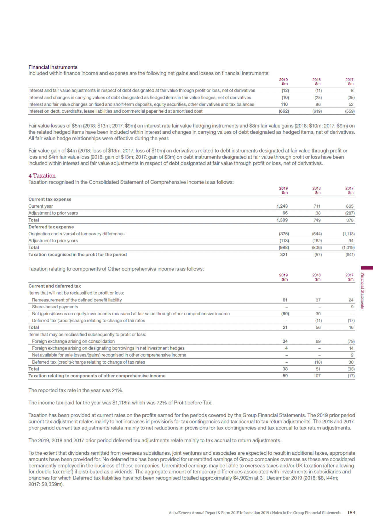 Financial instruments Included within finance income and expense are the following net gains and losses on financial instruments: 2019 $m 2018 $m 2017 $m Interest and fair value adjustments in respect of debt designated at fair value through profit or loss, net of derivatives (12) (11) 8 Interest and changes in carrying values of debt designated as hedged items in fair value hedges, net of derivatives (10) (28) (35) Interest and fair value changes on fixed and short-term deposits, equity securities, other derivatives and tax balances 110 96 52 Interest on debt, overdrafts, lease liabilities and commercial paper held at amortised cost (662) (619) (559) Fair value losses of $5m (2018: $13m; 2017: $9m) on interest rate fair value hedging instruments and $8m fair value gains (2018: $10m; 2017: $9m) on the related hedged items have been included within interest and changes in carrying values of debt designated as hedged items, net of derivatives. All fair value hedge relationships were effective during the year. Fair value gain of $4m (2018: loss of $13m; 2017: loss of $10m) on derivatives related to debt instruments designated at fair value through profit or loss and $4m fair value loss (2018: gain of $13m; 2017: gain of $3m) on debt instruments designated at fair value through profit or loss have been included within interest and fair value adjustments in respect of debt designated at fair value through profit or loss, net of derivatives. 4 Taxation Taxation recognised in the Consolidated Statement of Comprehensive Income is as follows: 2019 $m 2018 $m 2017 $m Current tax expense Current year 1,243 711 665 Adjustment to prior years 66 38 (287) Total 1,309 749 378 Deferred tax expense Origination and reversal of temporary differences (875) (644) (1,113) Adjustment to prior years (113) (162) 94 Total (988) (806) (1,019) Taxation recognised in the profit for the period 321 (57) (641) Taxation relating to components of Other comprehensive income is as follows: 2019 $m 2018 $m 2017 $m Current and deferred tax Items that will not be reclassified to profit or loss: Remeasurement of the defined benefit liability 81 37 24 Share-based payments – – 9 Net (gains)/losses on equity investments measured at fair value through other comprehensive income (60) 30 – Deferred tax (credit)/charge relating to change of tax rates – (11) (17) Total 21 56 16 Items that may be reclassified subsequently to profit or loss: Foreign exchange arising on consolidation 34 69 (79) Foreign exchange arising on designating borrowings in net investment hedges 4 – 14 Net available for sale losses/(gains) recognised in other comprehensive income – – 2 Deferred tax (credit)/charge relating to change of tax rates – (18) 30 Total 38 51 (33) Taxation relating to components of other comprehensive income 59 107 (17) The reported tax rate in the year was 21%. The income tax paid for the year was $1,118m which was 72% of Profit before Tax. Taxation has been provided at current rates on the profits earned for the periods covered by the Group Financial Statements. The 2019 prior period current tax adjustment relates mainly to net increases in provisions for tax contingencies and tax accrual to tax return adjustments. The 2018 and 2017 prior period current tax adjustments relate mainly to net reductions in provisions for tax contingencies and tax accrual to tax return adjustments. The 2019, 2018 and 2017 prior period deferred tax adjustments relate mainly to tax accrual to return adjustments. To the extent that dividends remitted from overseas subsidiaries, joint ventures and associates are expected to result in additional taxes, appropriate amounts have been provided for. No deferred tax has been provided for unremitted earnings of Group companies overseas as these are considered permanently employed in the business of these companies. Unremitted earnings may be liable to overseas taxes and/or UK taxation (after allowing for double tax relief) if distributed as dividends. The aggregate amount of temporary differences associated with investments in subsidiaries and branches for which Deferred tax liabilities have not been recognised totalled approximately $4,902m at 31 December 2019 (2018: $8,144m; 2017: $8,359m). AstraZeneca Annual Report & Form 20-F Information 2019 / Notes to the Group Financial Statements 183 Financial Statements