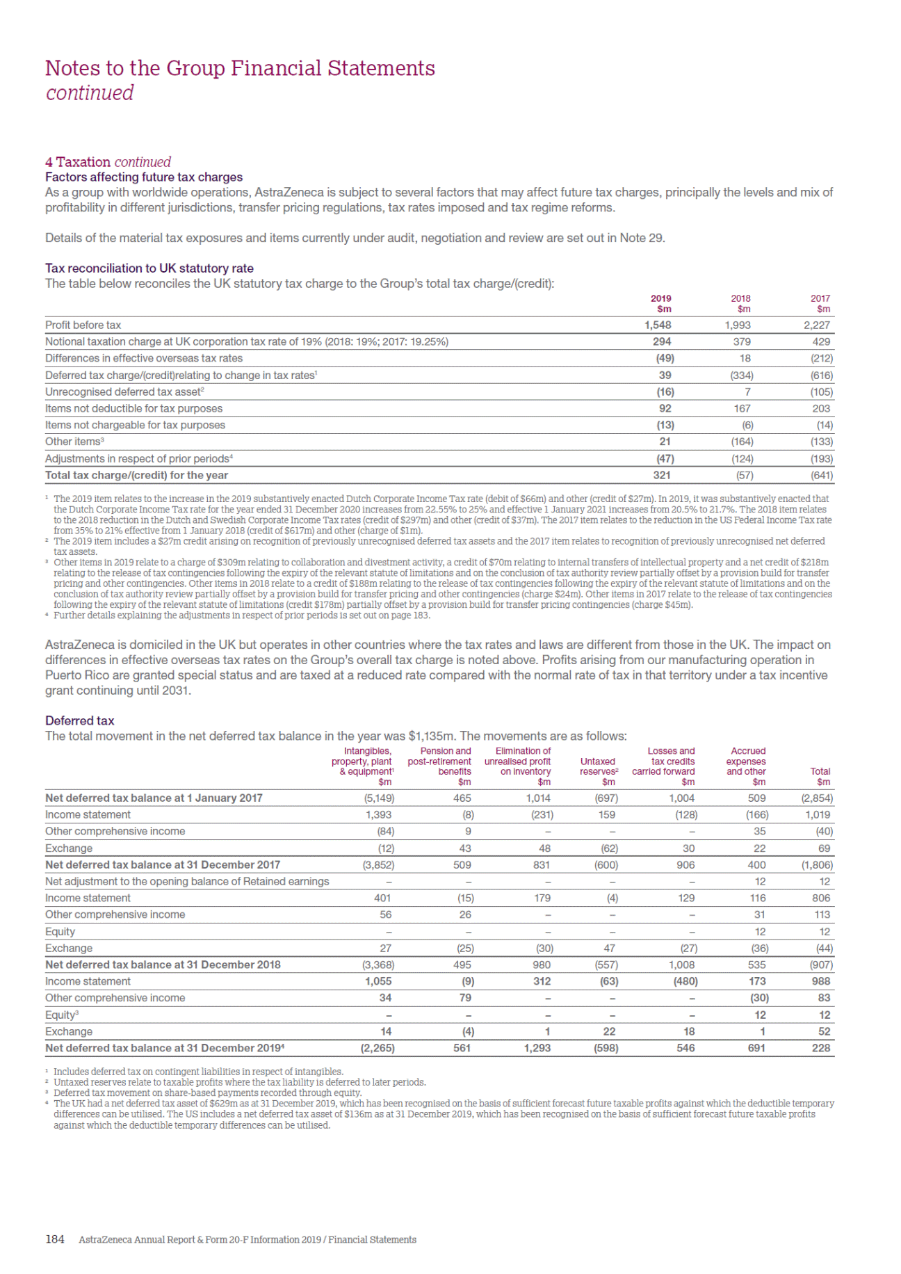 Notes to the Group Financial Statements continued 4 Taxation continued Factors affecting future tax charges As a group with worldwide operations, AstraZeneca is subject to several factors that may affect future tax charges, principally the levels and mix of profitability in different jurisdictions, transfer pricing regulations, tax rates imposed and tax regime reforms. Details of the material tax exposures and items currently under audit, negotiation and review are set out in Note 29. Tax reconciliation to UK statutory rate The table below reconciles the UK statutory tax charge to the Group’s total tax charge/(credit): 2019 $m 2018 $m 2017 $m Profit before tax 1,548 1,993 2,227 Notional taxation charge at UK corporation tax rate of 19% (2018: 19%; 2017: 19.25%) 294 379 429 Differences in effective overseas tax rates (49) 18 (212) Deferred tax charge/(credit)relating to change in tax rates1 39 (334) (616) Unrecognised deferred tax asset2 (16) 7 (105) Items not deductible for tax purposes 92 167 203 Items not chargeable for tax purposes (13) (6) (14) Other items3 21 (164) (133) Adjustments in respect of prior periods4 (47) (124) (193) Total tax charge/(credit) for the year 321 (57) (641) 1 The 2019 item relates to the increase in the 2019 substantively enacted Dutch Corporate Income Tax rate (debit of $66m) and other (credit of $27m). In 2019, it was substantively enacted that the Dutch Corporate Income Tax rate for the year ended 31 December 2020 increases from 22.55% to 25% and effective 1 January 2021 increases from 20.5% to 21.7%. The 2018 item relates to the 2018 reduction in the Dutch and Swedish Corporate Income Tax rates (credit of $297m) and other (credit of $37m). The 2017 item relates to the reduction in the US Federal Income Tax rate from 35% to 21% effective from 1 January 2018 (credit of $617m) and other (charge of $1m). 2 The 2019 item includes a $27m credit arising on recognition of previously unrecognised deferred tax assets and the 2017 item relates to recognition of previously unrecognised net deferred tax assets. 3 Other items in 2019 relate to a charge of $309m relating to collaboration and divestment activity, a credit of $70m relating to internal transfers of intellectual property and a net credit of $218m relating to the release of tax contingencies following the expiry of the relevant statute of limitations and on the conclusion of tax authority review partially offset by a provision build for transfer pricing and other contingencies. Other items in 2018 relate to a credit of $188m relating to the release of tax contingencies following the expiry of the relevant statute of limitations and on the conclusion of tax authority review partially offset by a provision build for transfer pricing and other contingencies (charge $24m). Other items in 2017 relate to the release of tax contingencies following the expiry of the relevant statute of limitations (credit $178m) partially offset by a provision build for transfer pricing contingencies (charge $45m). 4 Further details explaining the adjustments in respect of prior periods is set out on page 183. AstraZeneca is domiciled in the UK but operates in other countries where the tax rates and laws are different from those in the UK. The impact on differences in effective overseas tax rates on the Group’s overall tax charge is noted above. Profits arising from our manufacturing operation in Puerto Rico are granted special status and are taxed at a reduced rate compared with the normal rate of tax in that territory under a tax incentive grant continuing until 2031. Deferred tax The total movement in the net deferred tax balance in the year was $1,135m. The movements are as follows: Intangibles, property, plant & equipment1 $m Pension and post-retirement benefits $m Elimination of unrealised profit on inventory $m Losses and tax credits carried forward $m Accrued expenses and other $m Untaxed reserves2 $m Total $m Net deferred tax balance at 1 January 2017 (5,149) 465 1,014 (697) 1,004 509 (2,854) Income statement 1,393 (8) (231) 159 (128) (166) 1,019 Other comprehensive income (84) 9 – – – 35 (40) Exchange (12) 43 48 (62) 30 22 69 Net deferred tax balance at 31 December 2017 (3,852) 509 831 (600) 906 400 (1,806) Net adjustment to the opening balance of Retained earnings – – – – – 12 12 Income statement 401 (15) 179 (4) 129 116 806 Other comprehensive income 56 26 – – – 31 113 Equity – – – – – 12 12 Exchange 27 (25) (30) 47 (27) (36) (44) Net deferred tax balance at 31 December 2018 (3,368) 495 980 (557) 1,008 535 (907) Income statement 1,055 (9) 312 (63) (480) 173 988 Other comprehensive income 34 79 – – – (30) 83 Equity3 – – – – – 12 12 Exchange 14 (4) 1 22 18 1 52 Net deferred tax balance at 31 December 20194 (2,265) 561 1,293 (598) 546 691 228 1 Includes deferred tax on contingent liabilities in respect of intangibles. 2 Untaxed reserves relate to taxable profits where the tax liability is deferred to later periods. 3 Deferred tax movement on share-based payments recorded through equity. 4 The UK had a net deferred tax asset of $629m as at 31 December 2019, which has been recognised on the basis of sufficient forecast future taxable profits against which the deductible temporary differences can be utilised. The US includes a net deferred tax asset of $136m as at 31 December 2019, which has been recognised on the basis of sufficient forecast future taxable profits against which the deductible temporary differences can be utilised. 184 AstraZeneca Annual Report & Form 20-F Information 2019 / Financial Statements