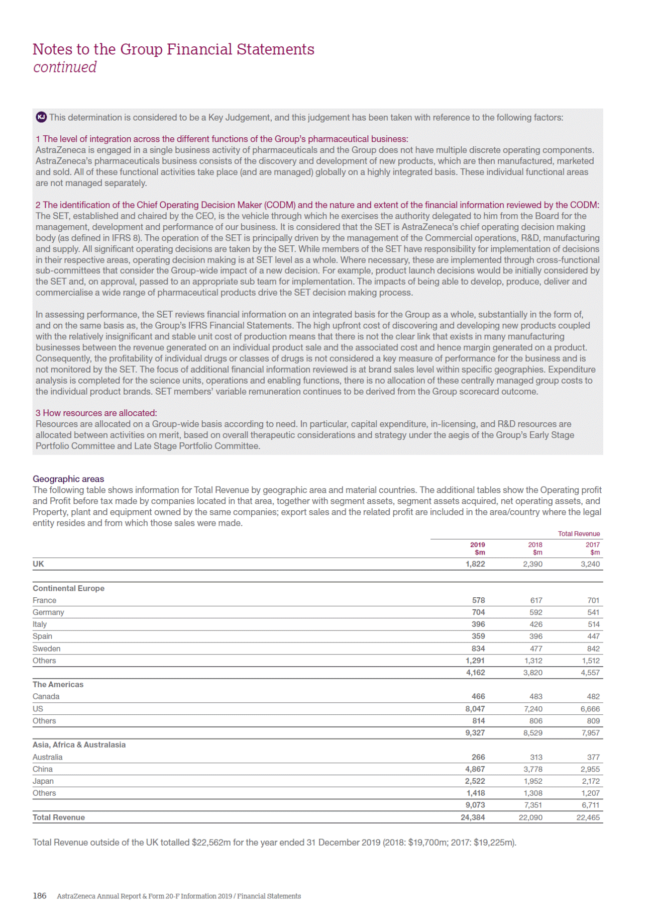 Notes to the Group Financial Statements continued Geographic areas The following table shows information for Total Revenue by geographic area and material countries. The additional tables show the Operating profit and Profit before tax made by companies located in that area, together with segment assets, segment assets acquired, net operating assets, and Property, plant and equipment owned by the same companies; export sales and the related profit are included in the area/country where the legal entity resides and from which those sales were made. Total Revenue 2019 $m 2018 $m 2017 $m UK 1,822 2,390 3,240 Continental Europe France 578 617 701 Germany 704 592 541 Italy 396 426 514 Spain 359 396 447 Sweden 834 477 842 Others 1,291 1,312 1,512 4,162 3,820 4,557 The Americas Canada 466 483 482 US 8,047 7,240 6,666 Others 814 806 809 9,327 8,529 7,957 Asia, Africa & Australasia Australia 266 313 377 China 4,867 3,778 2,955 Japan 2,522 1,952 2,172 Others 1,418 1,308 1,207 9,073 7,351 6,711 Total Revenue 24,384 22,090 22,465 Total Revenue outside of the UK totalled $22,562m for the year ended 31 December 2019 (2018: $19,700m; 2017: $19,225m). 186 AstraZeneca Annual Report & Form 20-F Information 2019 / Financial Statements KJ This determination is considered to be a Key Judgement, and this judgement has been taken with reference to the following factors: 1 The level of integration across the different functions of the Group’s pharmaceutical business: AstraZeneca is engaged in a single business activity of pharmaceuticals and the Group does not have multiple discrete operating components. AstraZeneca’s pharmaceuticals business consists of the discovery and development of new products, which are then manufactured, marketed and sold. All of these functional activities take place (and are managed) globally on a highly integrated basis. These individual functional areas are not managed separately. 2 The identification of the Chief Operating Decision Maker (CODM) and the nature and extent of the financial information reviewed by the CODM: The SET, established and chaired by the CEO, is the vehicle through which he exercises the authority delegated to him from the Board for the management, development and performance of our business. It is considered that the SET is AstraZeneca’s chief operating decision making body (as defined in IFRS 8). The operation of the SET is principally driven by the management of the Commercial operations, R&D, manufacturing and supply. All significant operating decisions are taken by the SET. While members of the SET have responsibility for implementation of decisions in their respective areas, operating decision making is at SET level as a whole. Where necessary, these are implemented through cross-functional sub-committees that consider the Group-wide impact of a new decision. For example, product launch decisions would be initially considered by the SET and, on approval, passed to an appropriate sub team for implementation. The impacts of being able to develop, produce, deliver and commercialise a wide range of pharmaceutical products drive the SET decision making process. In assessing performance, the SET reviews financial information on an integrated basis for the Group as a whole, substantially in the form of, and on the same basis as, the Group’s IFRS Financial Statements. The high upfront cost of discovering and developing new products coupled with the relatively insignificant and stable unit cost of production means that there is not the clear link that exists in many manufacturing businesses between the revenue generated on an individual product sale and the associated cost and hence margin generated on a product. Consequently, the profitability of individual drugs or classes of drugs is not considered a key measure of performance for the business and is not monitored by the SET. The focus of additional financial information reviewed is at brand sales level within specific geographies. Expenditure analysis is completed for the science units, operations and enabling functions, there is no allocation of these centrally managed group costs to the individual product brands. SET members’ variable remuneration continues to be derived from the Group scorecard outcome. 3 How resources are allocated: Resources are allocated on a Group-wide basis according to need. In particular, capital expenditure, in-licensing, and R&D resources are allocated between activities on merit, based on overall therapeutic considerations and strategy under the aegis of the Group’s Early Stage Portfolio Committee and Late Stage Portfolio Committee.
