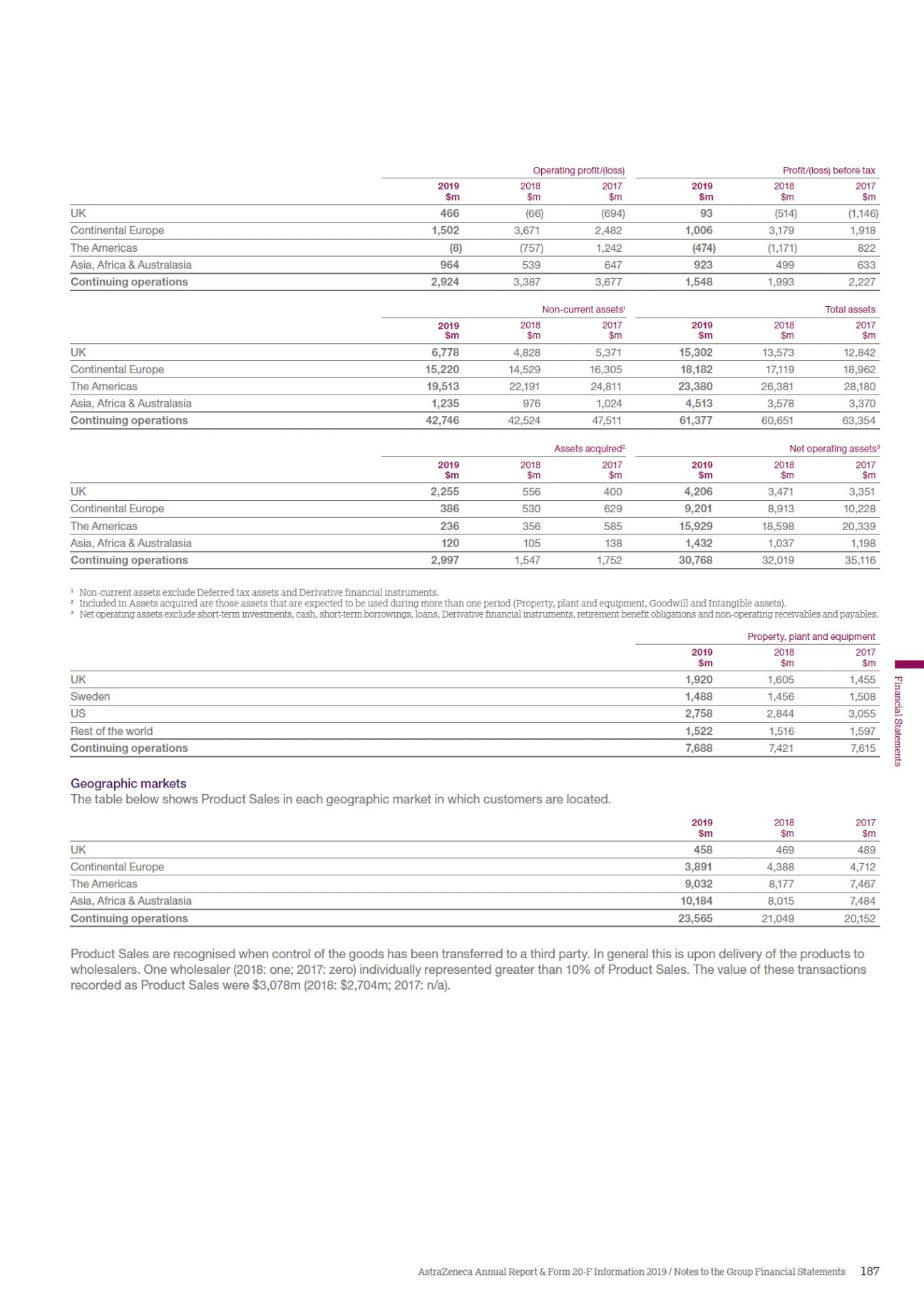 Operating profit/(loss) Profit/(loss) before tax 2019 $m 2018 $m 2017 $m 2019 $m 2018 $m 2017 $m UK 466 (66) (694) 93 (514) (1,146) Continental Europe 1,502 3,671 2,482 1,006 3,179 1,918 The Americas (8) (757) 1,242 (474) (1,171) 822 Asia, Africa & Australasia 964 539 647 923 499 633 Continuing operations 2,924 3,387 3,677 1,548 1,993 2,227 Non-current assets1 Total assets 2018 $m 2017 $m 2019 $m 2018 $m 2017 $m 2019 $m UK 6,778 4,828 5,371 15,302 13,573 12,842 Continental Europe 15,220 14,529 16,305 18,182 17,119 18,962 The Americas 19,513 22,191 24,811 23,380 26,381 28,180 Asia, Africa & Australasia 1,235 976 1,024 4,513 3,578 3,370 Continuing operations 42,746 42,524 47,511 61,377 60,651 63,354 Assets acquired2 Net operating assets3 2019 $m 2018 $m 2017 $m 2019 $m 2018 $m 2017 $m UK 2,255 556 400 4,206 3,471 3,351 Continental Europe 386 530 629 9,201 8,913 10,228 The Americas 236 356 585 15,929 18,598 20,339 Asia, Africa & Australasia 120 105 138 1,432 1,037 1,198 Continuing operations 2,997 1,547 1,752 30,768 32,019 35,116 1 Non-current assets exclude Deferred tax assets and Derivative financial instruments. 2 Included in Assets acquired are those assets that are expected to be used during more than one period (Property, plant and equipment, Goodwill and Intangible assets). 3 Net operating assets exclude short-term investments, cash, short-term borrowings, loans, Derivative financial instruments, retirement benefit obligations and non-operating receivables and payables. Property, plant and equipment 2019 $m 2018 $m 2017 $m UK 1,920 1,605 1,455 Sweden 1,488 1,456 1,508 US 2,758 2,844 3,055 Rest of the world 1,522 1,516 1,597 Continuing operations 7,688 7,421 7,615 Geographic markets The table below shows Product Sales in each geographic market in which customers are located. 2019 $m 2018 $m 2017 $m UK 458 469 489 Continental Europe 3,891 4,388 4,712 The Americas 9,032 8,177 7,467 Asia, Africa & Australasia 10,184 8,015 7,484 Continuing operations 23,565 21,049 20,152 Product Sales are recognised when control of the goods has been transferred to a third party. In general this is upon delivery of the products to wholesalers. One wholesaler (2018: one; 2017: zero) individually represented greater than 10% of Product Sales. The value of these transactions recorded as Product Sales were $3,078m (2018: $2,704m; 2017: n/a). AstraZeneca Annual Report & Form 20-F Information 2019 / Notes to the Group Financial Statements 187 Financial Statements