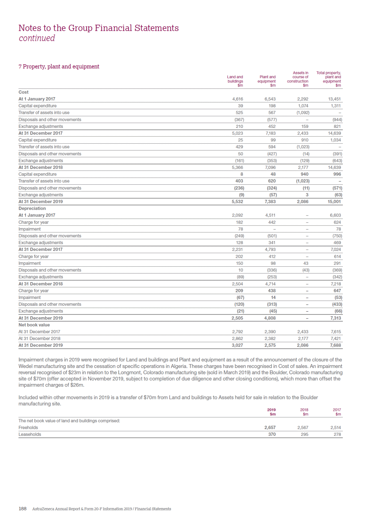 Notes to the Group Financial Statements continued 7 Property, plant and equipment Assets in course of construction $m Total property, plant and equipment $m Land and buildings $m Plant and equipment $m Cost At 1 January 2017 4,616 6,543 2,292 13,451 Capital expenditure 39 198 1,074 1,311 Transfer of assets into use 525 567 (1,092) – Disposals and other movements (367) (577) – (944) Exchange adjustments 210 452 159 821 At 31 December 2017 5,023 7,183 2,433 14,639 Capital expenditure 25 99 910 1,034 Transfer of assets into use 429 594 (1,023) – Disposals and other movements 50 (427) (14) (391) Exchange adjustments (161) (353) (129) (643) At 31 December 2018 5,366 7,096 2,177 14,639 Capital expenditure 8 48 940 996 Transfer of assets into use 403 620 (1,023) – Disposals and other movements (236) (324) (11) (571) Exchange adjustments (9) (57) 3 (63) At 31 December 2019 5,532 7,383 2,086 15,001 Depreciation At 1 January 2017 2,092 4,511 – 6,603 Charge for year 182 442 – 624 Impairment 78 – – 78 Disposals and other movements (249) (501) – (750) Exchange adjustments 128 341 – 469 At 31 December 2017 2,231 4,793 – 7,024 Charge for year 202 412 – 614 Impairment 150 98 43 291 Disposals and other movements 10 (336) (43) (369) Exchange adjustments (89) (253) – (342) At 31 December 2018 2,504 4,714 – 7,218 Charge for year 209 438 – 647 Impairment (67) 14 – (53) Disposals and other movements (120) (313) – (433) Exchange adjustments (21) (45) – (66) At 31 December 2019 2,505 4,808 – 7,313 Net book value At 31 December 2017 2,792 2,390 2,433 7,615 At 31 December 2018 2,862 2,382 2,177 7,421 At 31 December 2019 3,027 2,575 2,086 7,688 Impairment charges in 2019 were recognised for Land and buildings and Plant and equipment as a result of the announcement of the closure of the Wedel manufacturing site and the cessation of specific operations in Algeria. These charges have been recognised in Cost of sales. An impairment reversal recognised of $23m in relation to the Longmont, Colorado manufacturing site (sold in March 2019) and the Boulder, Colorado manufacturing site of $70m (offer accepted in November 2019, subject to completion of due diligence and other closing conditions), which more than offset the impairment charges of $26m. Included within other movements in 2019 is a transfer of $70m from Land and buildings to Assets held for sale in relation to the Boulder manufacturing site. 2019 $m 2018 $m 2017 $m The net book value of land and buildings comprised: Freeholds 2,657 2,567 2,514 Leaseholds 370 295 278 188 AstraZeneca Annual Report & Form 20-F Information 2019 / Financial Statements