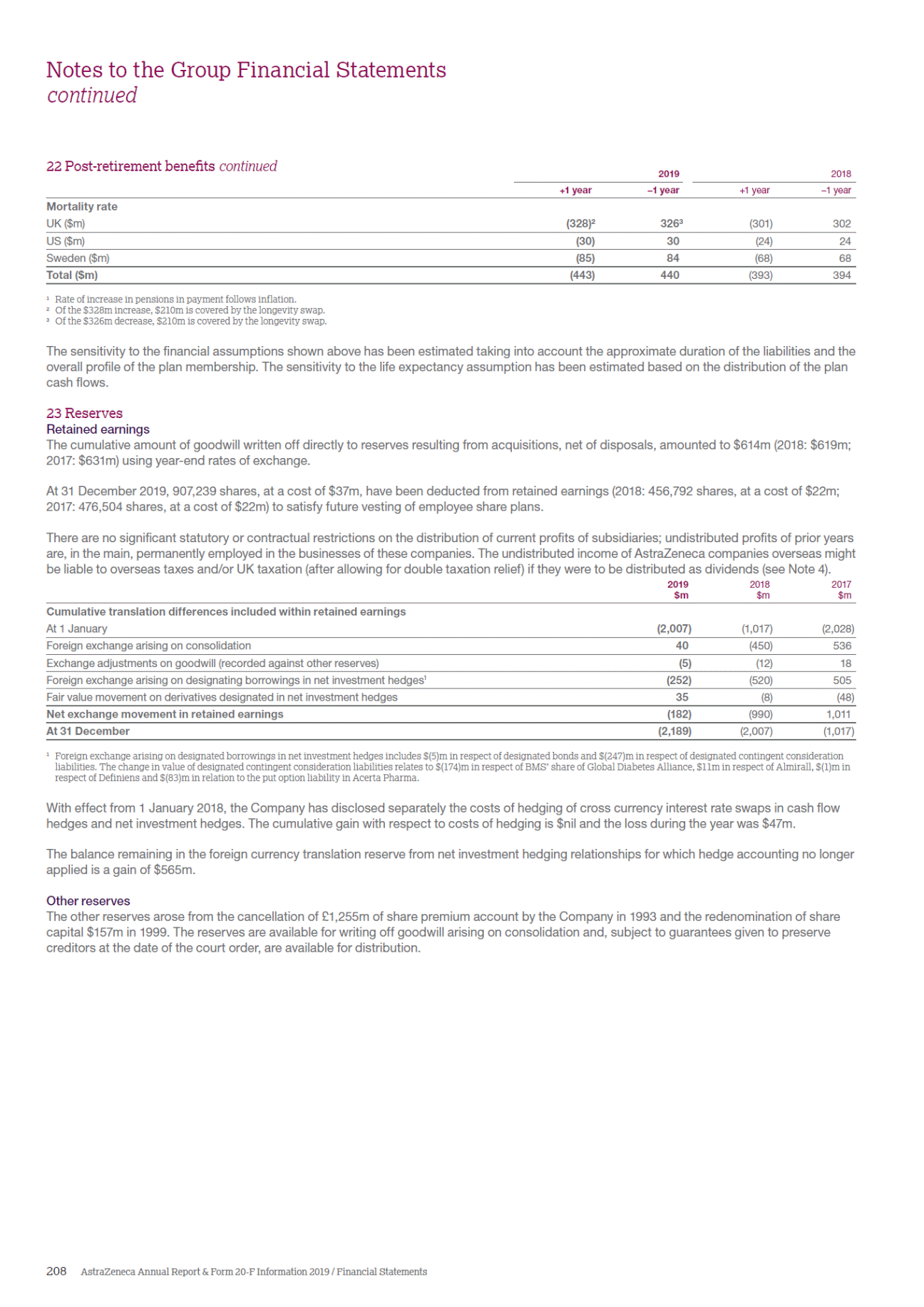 Notes to the Group Financial Statements continued 22 Post-retirement benefits continued 2019 2018 +1 year -1 year +1 year -1 year Mortality rate UK ($m) (328)2 3263 (301) 302 US ($m) (30) 30 (24) 24 Sweden ($m) (85) 84 (68) 68 Total ($m) (443) 440 (393) 394 1 Rate of increase in pensions in payment follows inflation. 2 Of the $328m increase, $210m is covered by the longevity swap. 3 Of the $326m decrease, $210m is covered by the longevity swap. The sensitivity to the financial assumptions shown above has been estimated taking into account the approximate duration of the liabilities and the overall profile of the plan membership. The sensitivity to the life expectancy assumption has been estimated based on the distribution of the plan cash flows. 23 Reserves Retained earnings The cumulative amount of goodwill written off directly to reserves resulting from acquisitions, net of disposals, amounted to $614m (2018: $619m; 2017: $631m) using year-end rates of exchange. At 31 December 2019, 907,239 shares, at a cost of $37m, have been deducted from retained earnings (2018: 456,792 shares, at a cost of $22m; 2017: 476,504 shares, at a cost of $22m) to satisfy future vesting of employee share plans. There are no significant statutory or contractual restrictions on the distribution of current profits of subsidiaries; undistributed profits of prior years are, in the main, permanently employed in the businesses of these companies. The undistributed income of AstraZeneca companies overseas might be liable to overseas taxes and/or UK taxation (after allowing for double taxation relief) if they were to be distributed as dividends (see Note 4). 2019 $m 2018 $m 2017 $m Cumulative translation differences included within retained earnings At 1 January (2,007) (1,017) (2,028) Foreign exchange arising on consolidation 40 (450) 536 Exchange adjustments on goodwill (recorded against other reserves) (5) (12) 18 Foreign exchange arising on designating borrowings in net investment hedges1 (252) (520) 505 Fair value movement on derivatives designated in net investment hedges 35 (8) (48) Net exchange movement in retained earnings (182) (990) 1,011 At 31 December (2,189) (2,007) (1,017) 1 Foreign exchange arising on designated borrowings in net investment hedges includes $(5)m in respect of designated bonds and $(247)m in respect of designated contingent consideration liabilities. The change in value of designated contingent consideration liabilities relates to $(174)m in respect of BMS’ share of Global Diabetes Alliance, $11m in respect of Almirall, $(1)m in respect of Definiens and $(83)m in relation to the put option liability in Acerta Pharma. With effect from 1 January 2018, the Company has disclosed separately the costs of hedging of cross currency interest rate swaps in cash flow hedges and net investment hedges. The cumulative gain with respect to costs of hedging is $nil and the loss during the year was $47m. The balance remaining in the foreign currency translation reserve from net investment hedging relationships for which hedge accounting no longer applied is a gain of $565m. Other reserves The other reserves arose from the cancellation of £1,255m of share premium account by the Company in 1993 and the redenomination of share capital $157m in 1999. The reserves are available for writing off goodwill arising on consolidation and, subject to guarantees given to preserve creditors at the date of the court order, are available for distribution. 208 AstraZeneca Annual Report & Form 20-F Information 2019 / Financial Statements