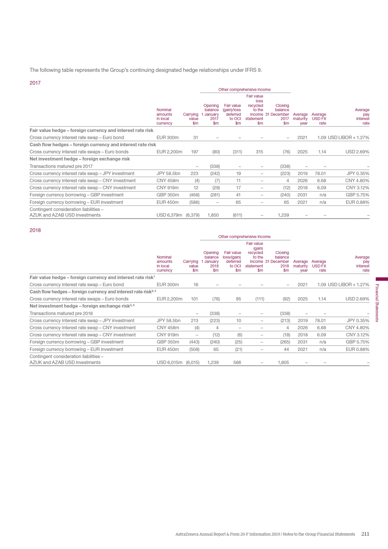 The following table represents the Group’s continuing designated hedge relationships under IFRS 9. 2017 Other comprehensive income Fair value loss recycled to the Opening balance Carrying 1 January Fair value (gain)/loss deferred to OCI $m Closing balance Nominal amounts in local currency Average pay interest rate income 31 December Average maturity year Average USD FX rate value $m 2017 $m statement 2017 $m $m Fair value hedge – foreign currency and interest rate risk Cross currency interest rate swap – Euro bond EUR 300m 31 – – – – 2021 1.09 USD LIBOR + 1.27% Cash flow hedges – foreign currency and interest rate risk Cross currency interest rate swaps – Euro bonds EUR 2,200m 197 (80) (311) 315 (76) 2025 1.14 USD 2.69% Net investment hedge – foreign exchange risk Transactions matured pre 2017 – (338) – – (338) – – – Cross currency interest rate swap – JPY investment JPY 58.5bn 223 (242) 19 – (223) 2019 78.01 JPY 0.35% Cross currency interest rate swap – CNY investment CNY 458m (4) (7) 11 – 4 2026 6.68 CNY 4.80% Cross currency interest rate swap – CNY investment CNY 919m 12 (29) 17 – (12) 2018 6.09 CNY 3.12% Foreign currency borrowing – GBP investment GBP 350m (468) (281) 41 – (240) 2031 n/a GBP 5.75% Foreign currency borrowing – EUR investment EUR 450m (586) – 65 – 65 2021 n/a EUR 0.88% Contingent consideration liabilities – AZUK and AZAB USD investments USD 6,379m (6,379) 1,850 (611) – 1,239 – – – 2018 Other comprehensive income Fair value (gain) recycled to the Opening balance Carrying 1 January Fair value loss/(gain) deferred to OCI $m Closing balance Nominal amounts in local currency Average pay interest rate income 31 December Average maturity year Average USD FX rate value $m 2018 $m statement 2018 $m $m Fair value hedge – foreign currency and interest rate risk1 Cross currency interest rate swap – Euro bond EUR 300m 16 – – – – 2021 1.09 USD LIBOR + 1.27% Cash flow hedges – foreign currency and interest rate risk2, 4 Cross currency interest rate swaps – Euro bonds EUR 2,200m 101 (76) 95 (111) (92) 2025 1.14 USD 2.69% Net investment hedge – foreign exchange risk3, 4 Transactions matured pre 2018 – (338) – – (338) – – – Cross currency interest rate swap – JPY investment JPY 58.5bn 213 (223) 10 – (213) 2019 78.01 JPY 0.35% Cross currency interest rate swap – CNY investment CNY 458m (4) 4 – – 4 2026 6.68 CNY 4.80% Cross currency interest rate swap – CNY investment CNY 919m – (12) (6) – (18) 2018 6.09 CNY 3.12% Foreign currency borrowing – GBP investment GBP 350m (443) (240) (25) – (265) 2031 n/a GBP 5.75% Foreign currency borrowing – EUR investment EUR 450m (508) 65 (21) – 44 2021 n/a EUR 0.88% Contingent consideration liabilities – AZUK and AZAB USD investments USD 6,015m (6,015) 1,239 566 – 1,805 – – – AstraZeneca Annual Report & Form 20-F Information 2019 / Notes to the Group Financial Statements 211 Financial Statements